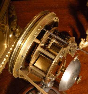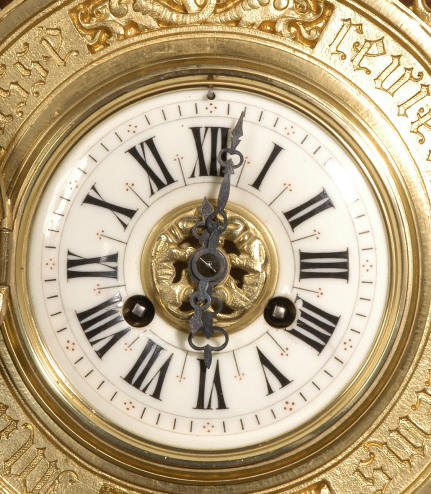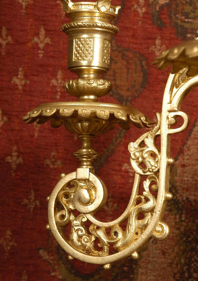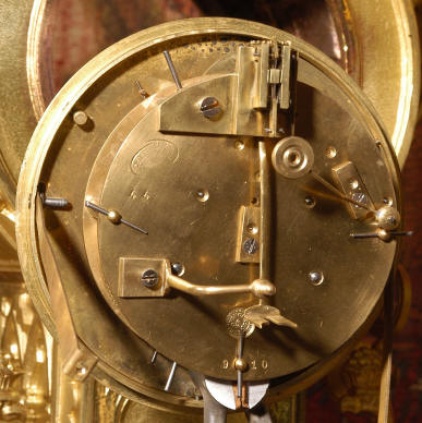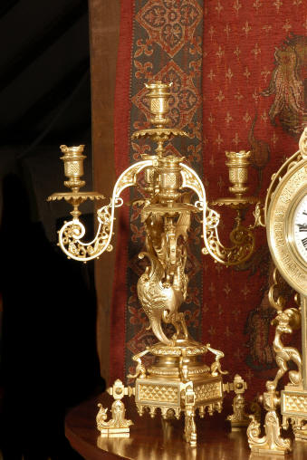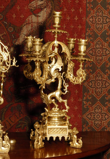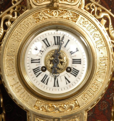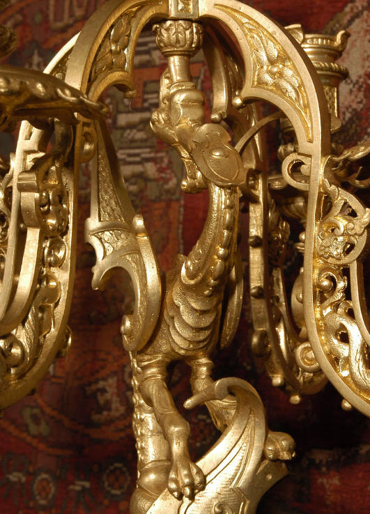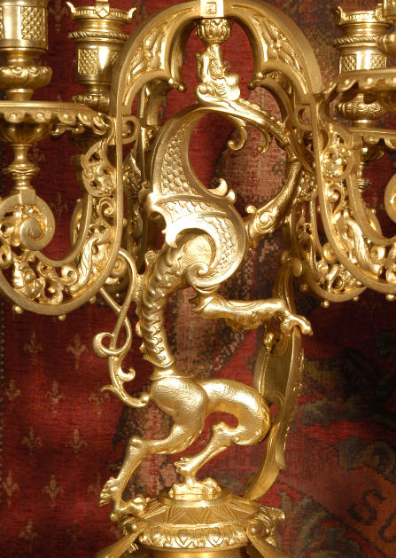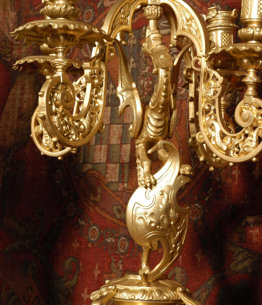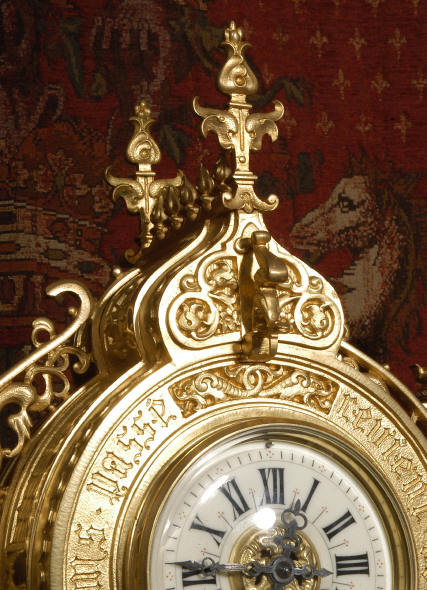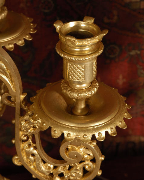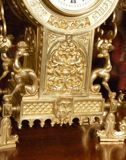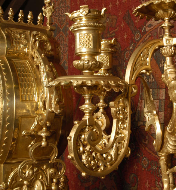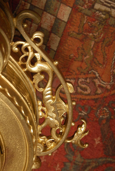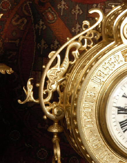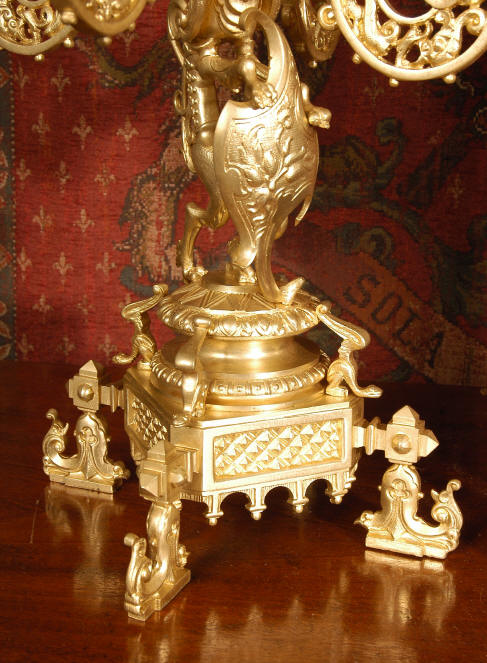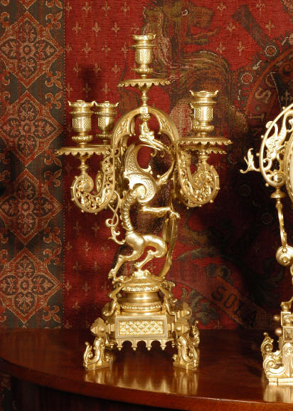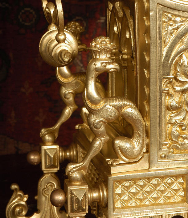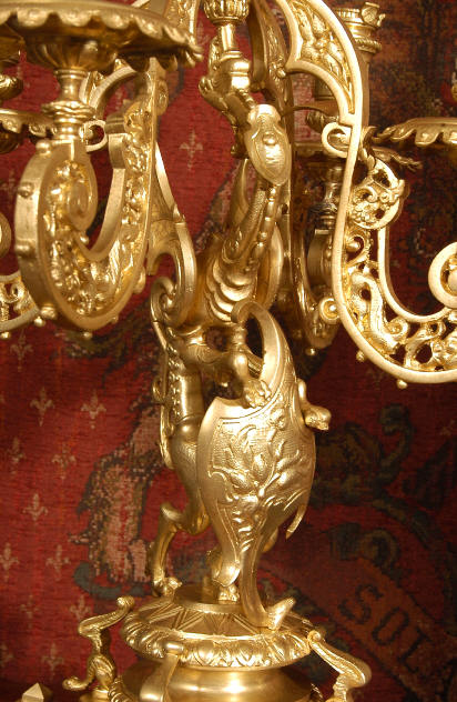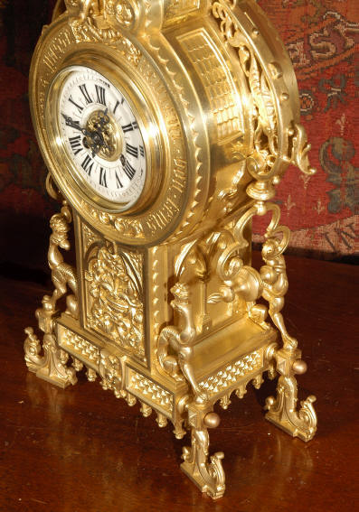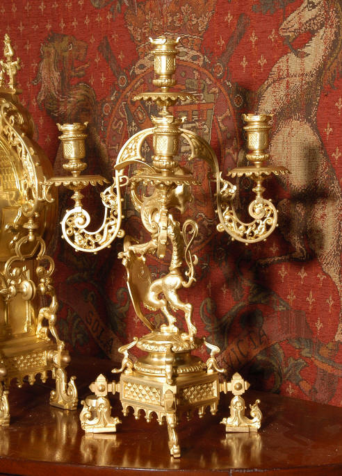 ~ French - Circa 1890 ~ ~~ Excellent condition ~~ A large and impressive clock set of very unusual shape and superb quality, profusely decorated in French Gothic style with a chinoiserie accent. Fire breathing Chinese dragons holding shields, form the stem of the candelabra, holding the four branches in their mouths. The clock case is equally spectacular, decorated in conforming chinoiserie style with dragons and crested heraldic birds. The front panel decorated with lotus. Engraved in gothic script around the dial is the Latin motto ' Mei Tems Vasse Reulent Hon Tems' The dial is enamel on copper and has a pair blued steel hands which follow the chinoiserie theme of the clock. The superb movement is by Vincenti et Cie and is in fully working, clean and running condition. It is complete with the original pendulum and bell. The movement features a Brocot pin-palette dead-beat escapement and rack striking. It runs for 8 days and strikes the hours and halves on a large sonorous bell - click the movie below to hear the bell. Condition is excellent - the finish of the brass is very good - bright and clean. There are some very small areas of wear or discoloration but in general both the case and the candelabra are excellent. The candelabra arms are slightly distorted and there is an old repair to one of the sconces which is not visible except on close inspection. The dial is in very good condition - just some minor chipping around the winding holes and a faint hairline through the 8 and 4 o'clock positions. A spectacular and unusual clock in excellent condition! Dimensions of clock: Height 21", Width