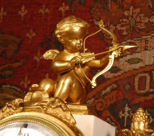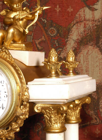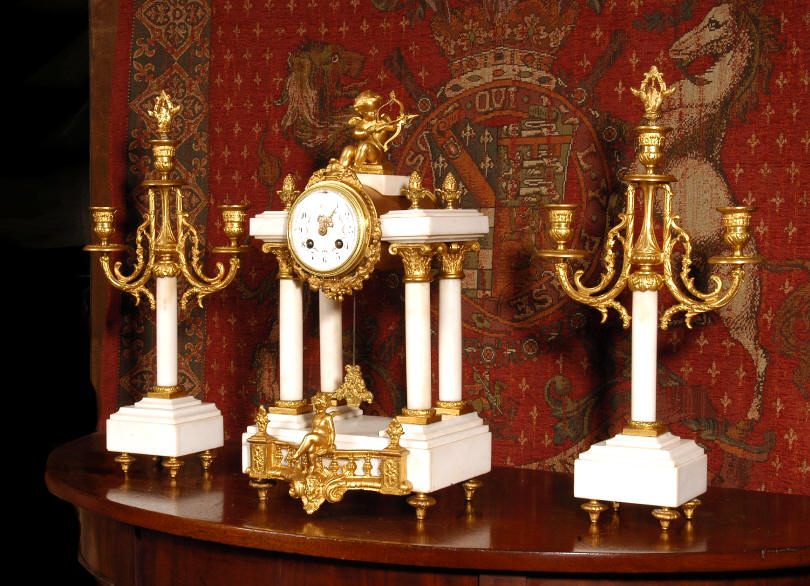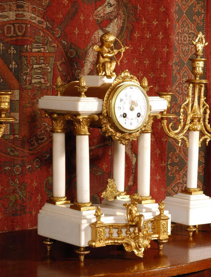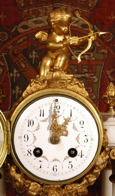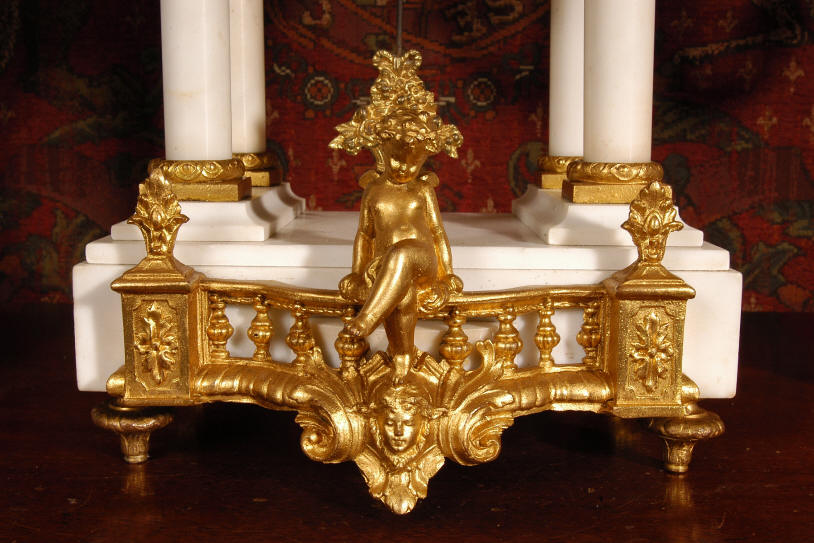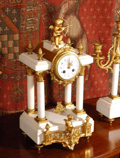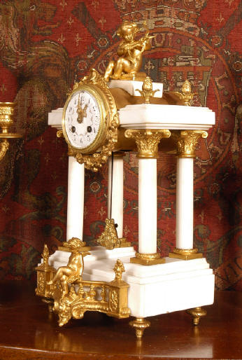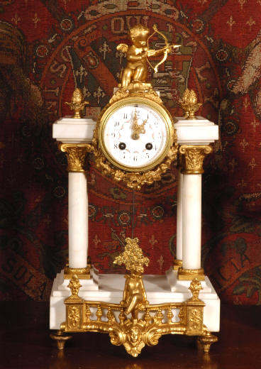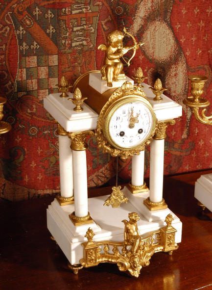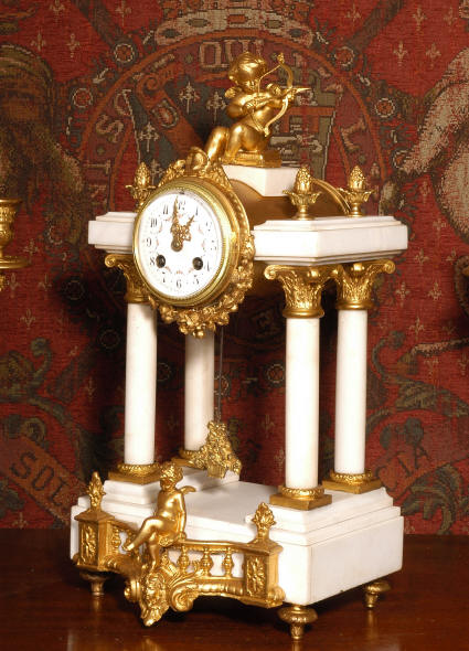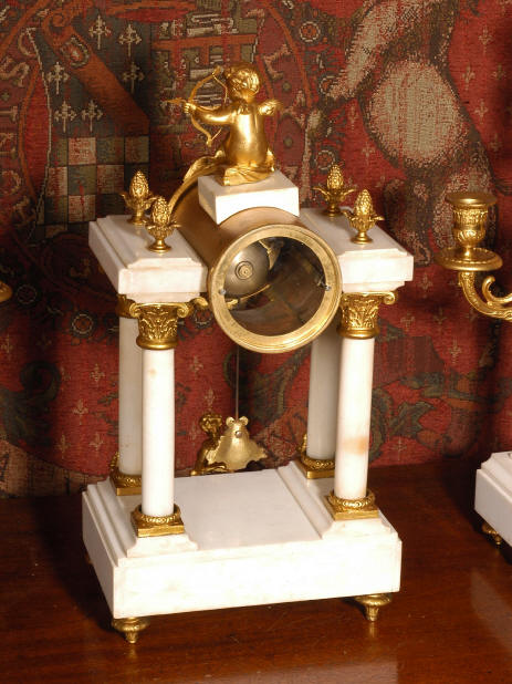 ~ French - Circa 1890 ~ ~~ Very Good condition ~~ A stunning portico clock set, beautiful white marble with gilt mounts. The top of the clock is surmounted by a putti with a bow and arrow, an allegory for love. The movement is housed in a drum that forms part of the portico, supported by 4 Corinthian columns. The pendulum is in the form of a basket of fruit and is visible below the movement. The dial is delicately painted with floral swags and is enamel on copper. The excellent movement is by A D Mougin, it runs for 8 days and strikes a bell on the hours and halves - click the movie below to hear the bell. Condition of the case is very good, just some very small nibbles along the bottom edge of the marble. The gilt finish of the mounts is very good and we have polished them with some wax. The dial as a small repair to the centre and also near the 12 o'clock - these are only noticeable on close inspection - see the picture below. A spectacular and unusual clock! Dimensions of clock: Height 19", Width