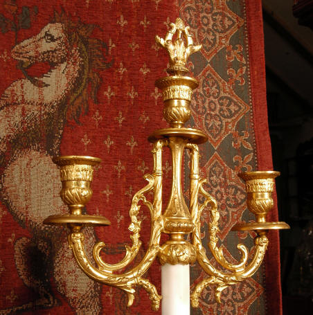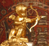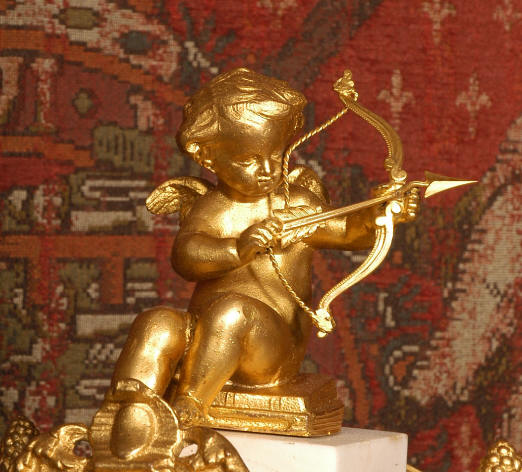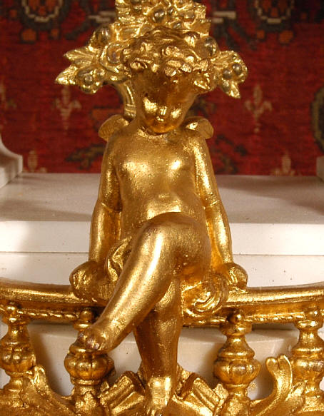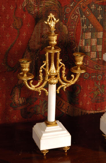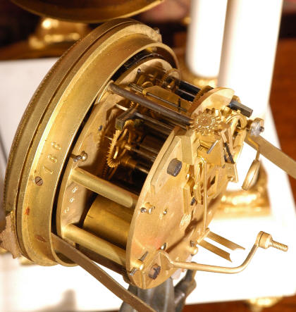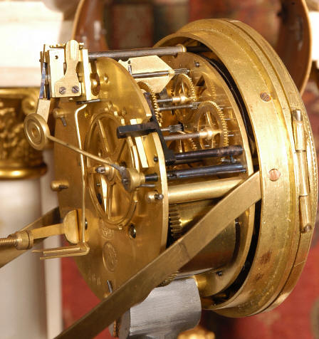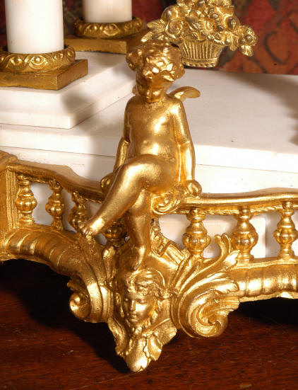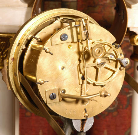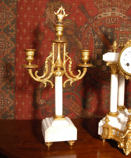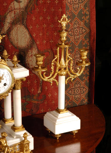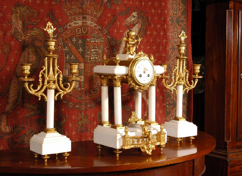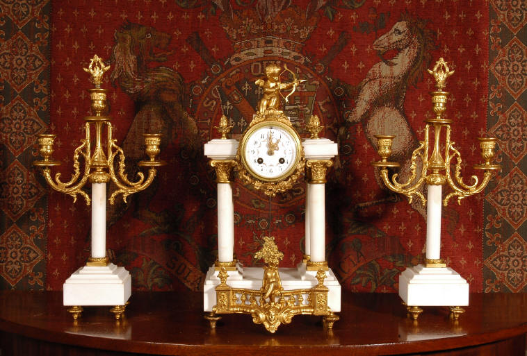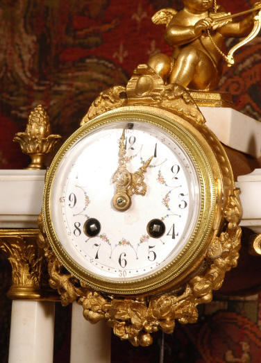 ~ French - Circa 1890 ~ ~~ Very Good condition ~~ A stunning portico clock set, beautiful white marble with gilt mounts. The top of the clock is surmounted by a putti with a bow and arrow, an allegory for love. The movement is housed in a drum that forms part of the portico, supported by 4 Corinthian columns. The pendulum is in the form of a basket of fruit and is visible below the movement. The dial is delicately painted with floral swags and is enamel on copper. The excellent movement is by A D Mougin, it runs for 8 days and strikes a bell on the hours and halves - click the movie below to hear the bell. Condition of the case is very good, just some very small nibbles along the bottom edge of the marble. The gilt finish of the mounts is very good and we have polished them with some wax. The dial as a small repair to the centre and also near the 12 o'clock - these are only noticeable on close inspection - see the picture below. A spectacular and unusual clock! Dimensions of clock: Height 19", Width