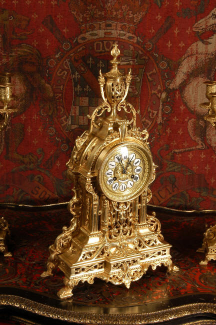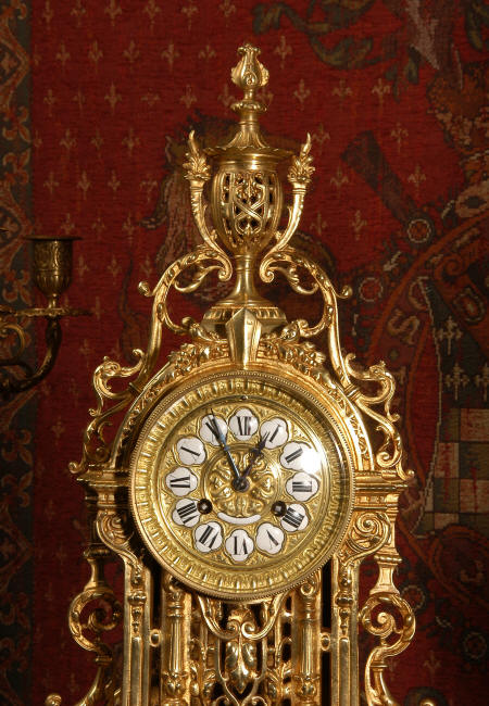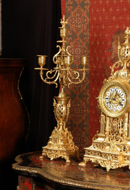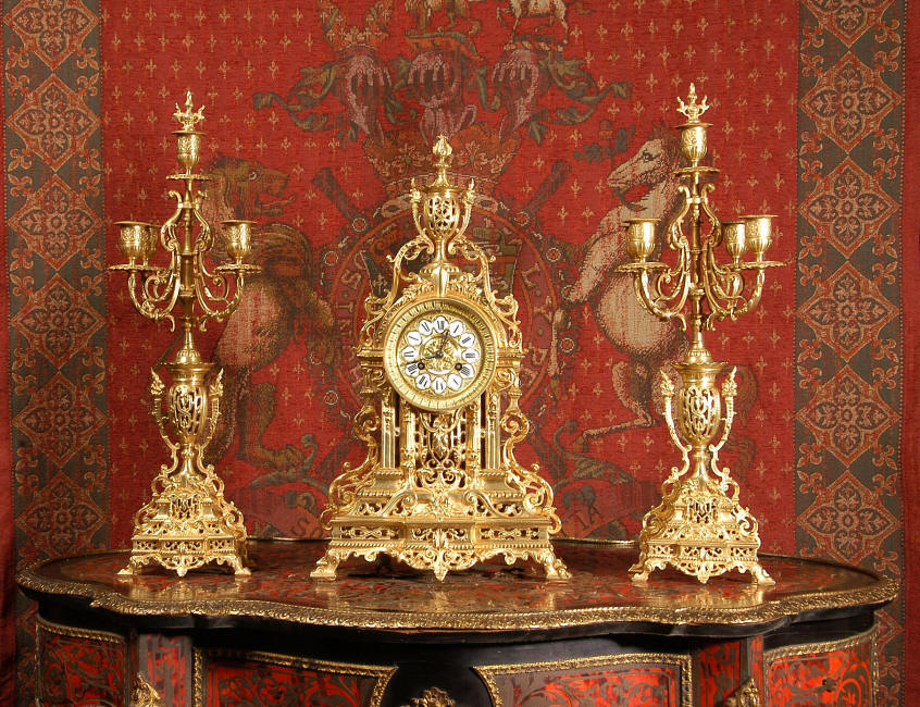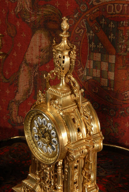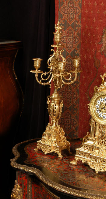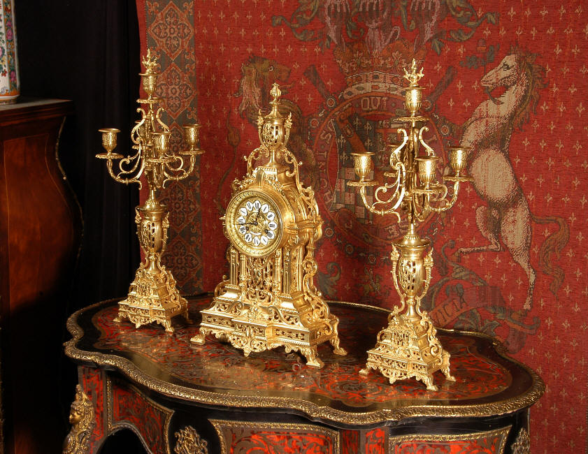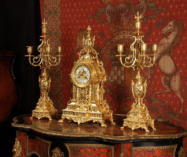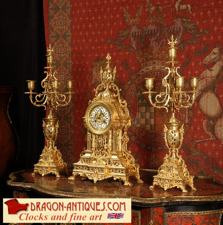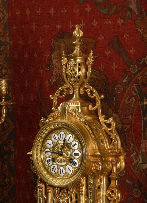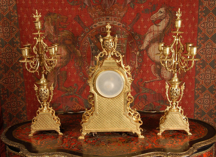 ~ French - Circa 1880 ~ ~~ Excellent condition, fully overhauled and tested movement ~~ A beautiful Louis XVI style clock set 'Garniture de Cheminee'. It is very well modelled in brass in the Louis XVI style. The case is architecturally shaped, profusely decorated with floral swags. The front of the case is finely fretted to allow the pendulum to be glimpsed, swinging within the case. Candelabra are conforming in style with bold 4 branch candelabra above urns with flaming handles and are complete with snuffers. The large and superb dial is brass, mounted with 12 individual enamel cartouches and an egg and dart bezel. The back door is glazed with frosted glass. The French movement is of excellent quality and is the slightly larger plate version of the 'Pendule de Paris' movement and is fitted with rack striking. It is in excellent clean and running condition having been stripped, inspected, fully cleaned, serviced and function tested by our clockmaker. We have also replaced the pendulum. It runs for 8 days and strikes the hours and halves on a bell. See the video clip below to see this actual clock working! Condition of the case is
