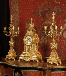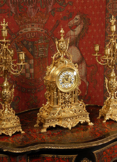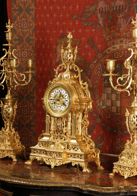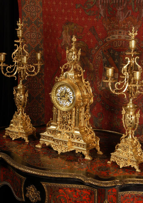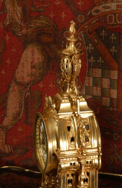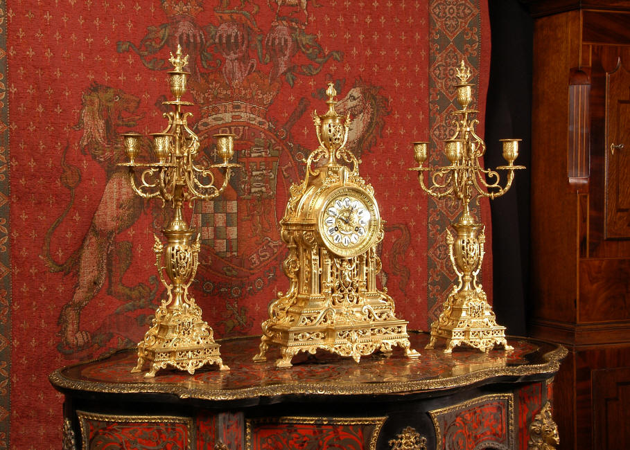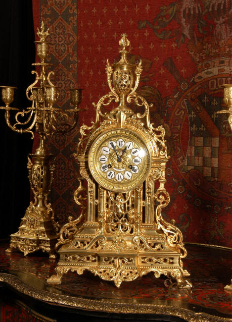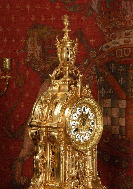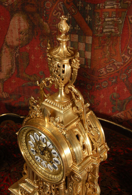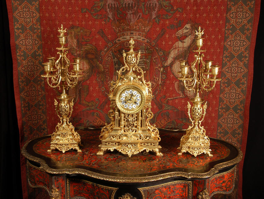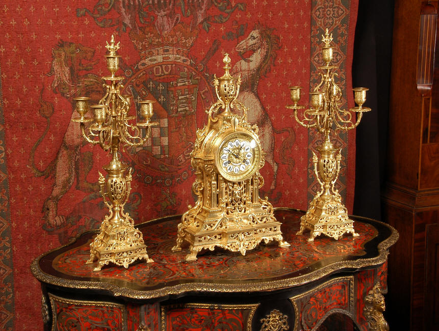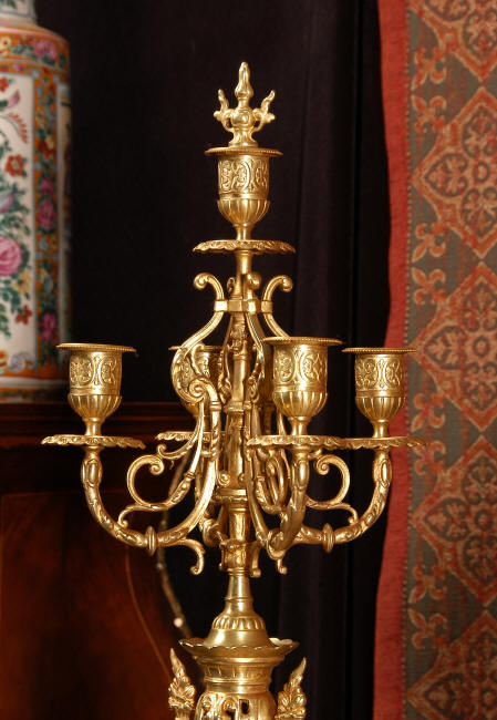 ~ French - Circa 1880 ~ ~~ Excellent condition, fully overhauled and tested movement ~~ A beautiful Louis XVI style clock set 'Garniture de Cheminee'. It is very well modelled in brass in the Louis XVI style. The case is architecturally shaped, profusely decorated with floral swags. The front of the case is finely fretted to allow the pendulum to be glimpsed, swinging within the case. Candelabra are conforming in style with bold 4 branch candelabra above urns with flaming handles and are complete with snuffers. The large and superb dial is brass, mounted with 12 individual enamel cartouches and an egg and dart bezel. The back door is glazed with frosted glass. The French movement is of excellent quality and is the slightly larger plate version of the 'Pendule de Paris' movement and is fitted with rack striking. It is in excellent clean and running condition having been stripped, inspected, fully cleaned, serviced and function tested by our clockmaker. We have also replaced the pendulum. It runs for 8 days and strikes the hours and halves on a bell. See the video clip below to see this actual clock working! Condition of the case is