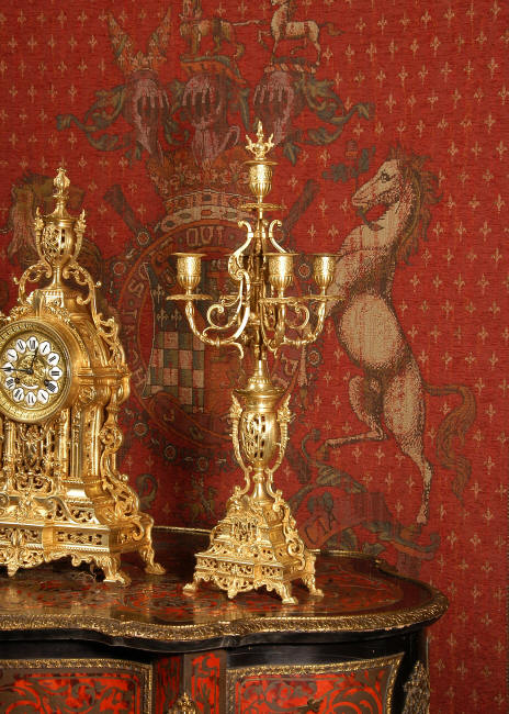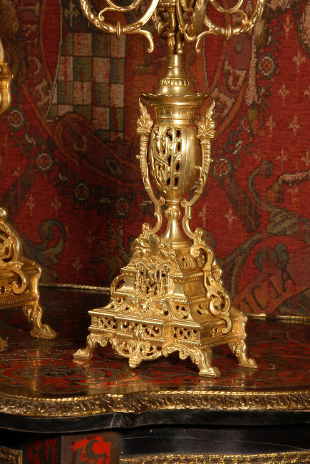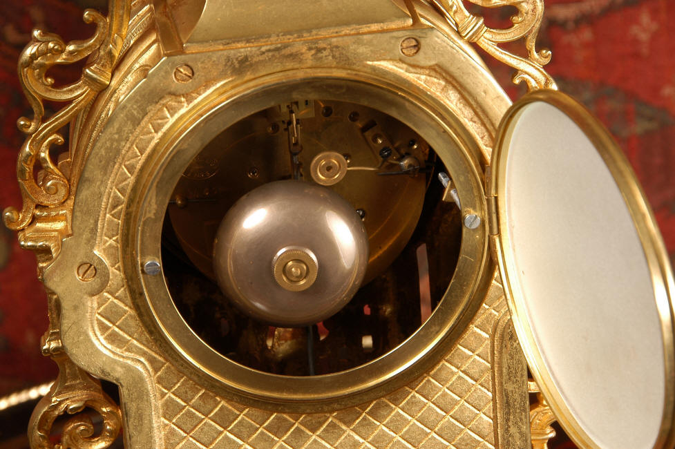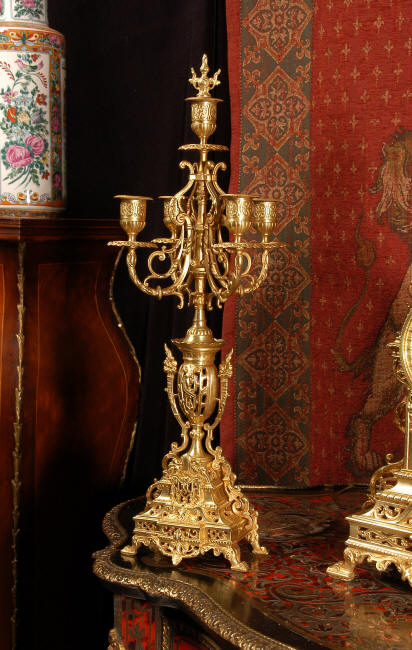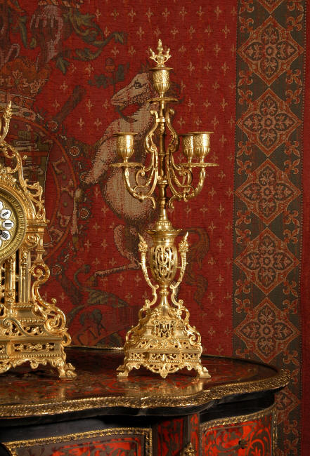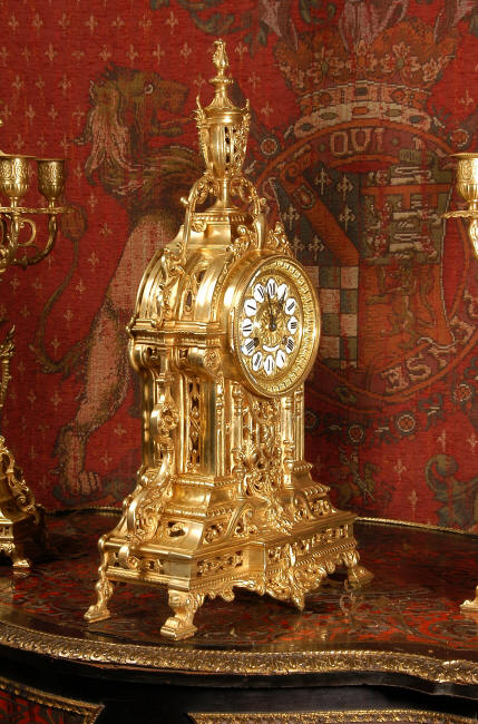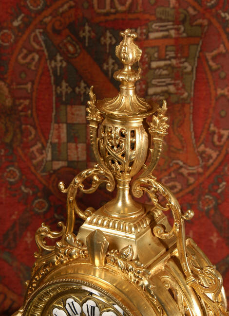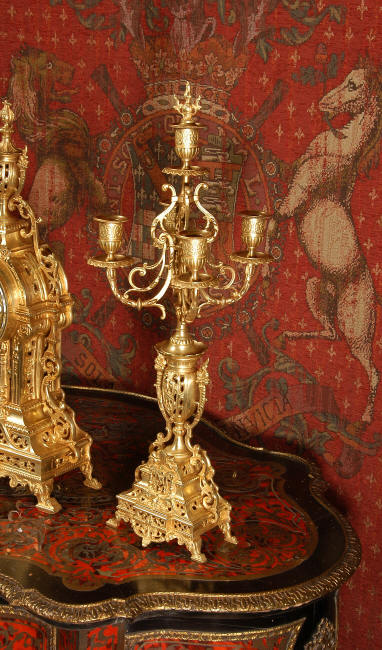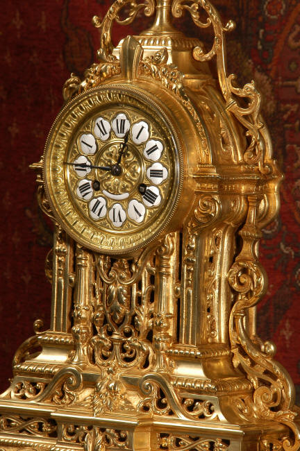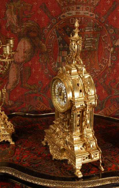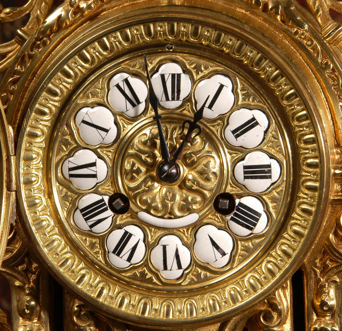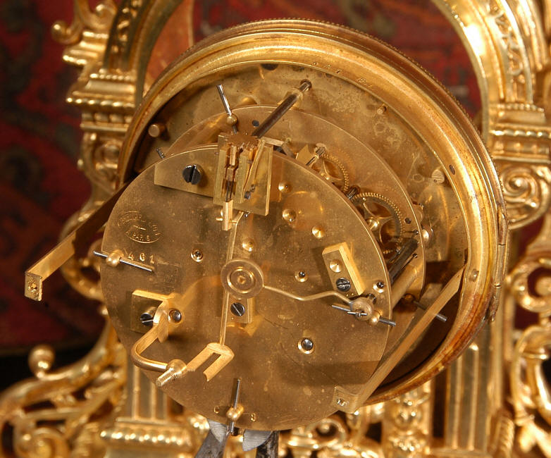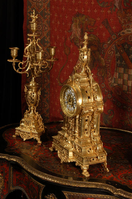 ~ French - Circa 1880 ~ ~~ Excellent condition, fully overhauled and tested movement ~~ A beautiful Louis XVI style clock set 'Garniture de Cheminee'. It is very well modelled in brass in the Louis XVI style. The case is architecturally shaped, profusely decorated with floral swags. The front of the case is finely fretted to allow the pendulum to be glimpsed, swinging within the case. Candelabra are conforming in style with bold 4 branch candelabra above urns with flaming handles and are complete with snuffers. The large and superb dial is brass, mounted with 12 individual enamel cartouches and an egg and dart bezel. The back door is glazed with frosted glass. The French movement is of excellent quality and is the slightly larger plate version of the 'Pendule de Paris' movement and is fitted with rack striking. It is in excellent clean and running condition having been stripped, inspected, fully cleaned, serviced and function tested by our clockmaker. We have also replaced the pendulum. It runs for 8 days and strikes the hours and halves on a bell. See the video clip below to see this actual clock working! Condition of the case is