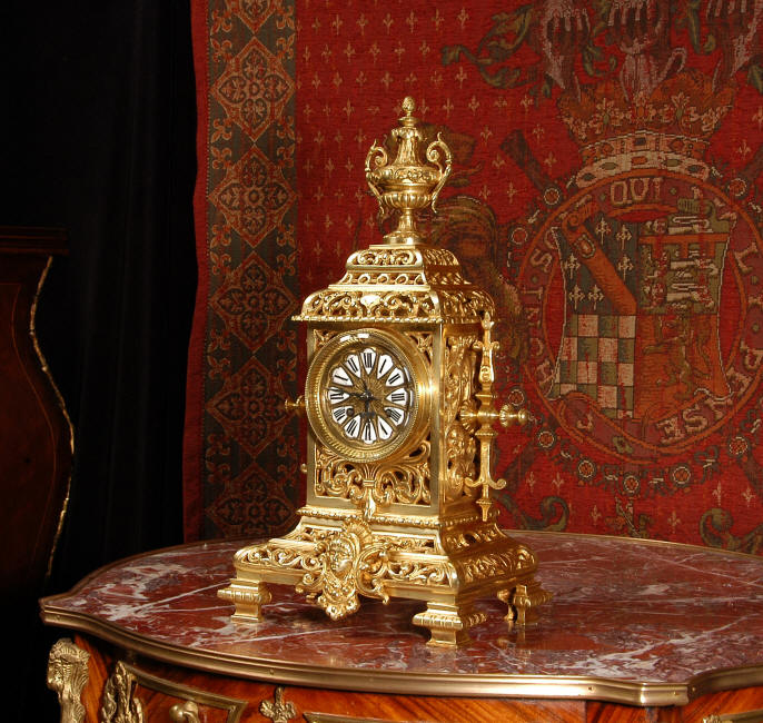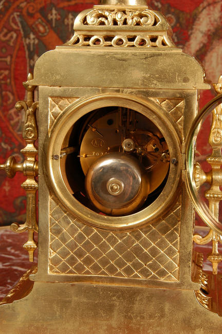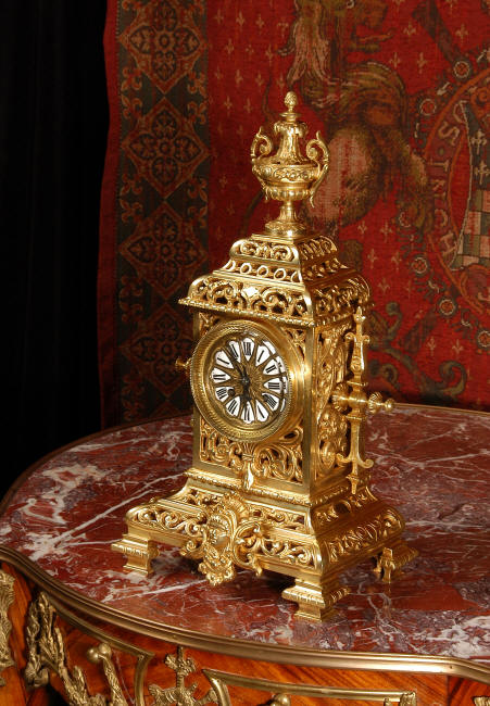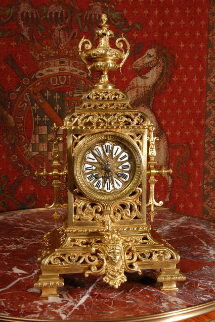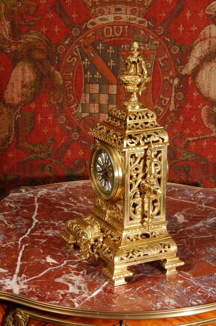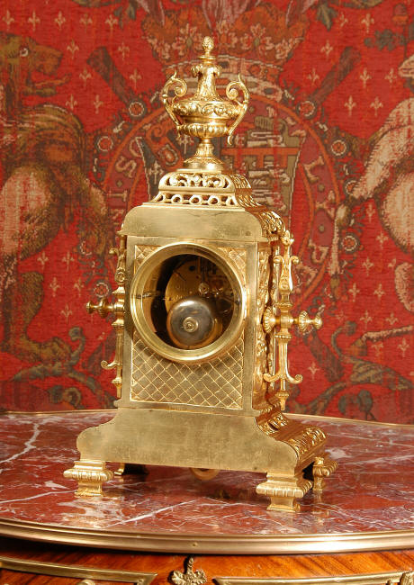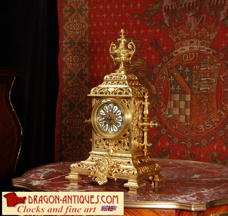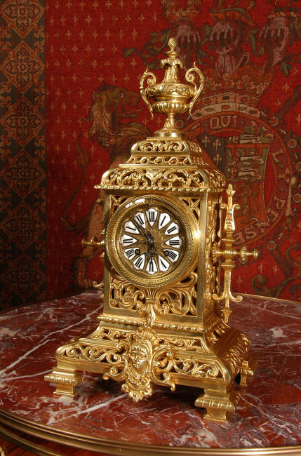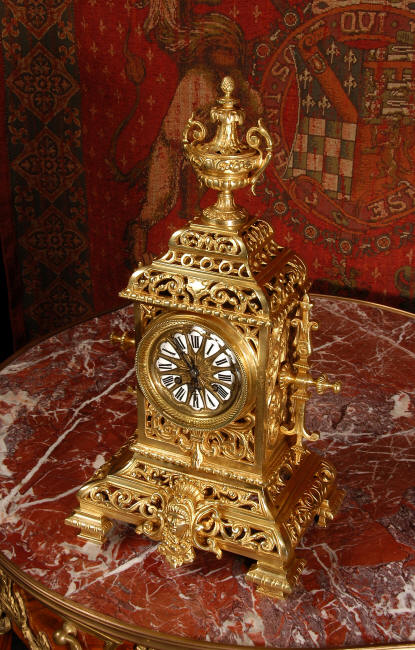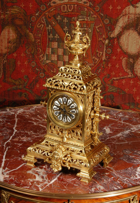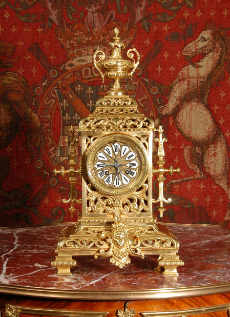 ~ French - Circa 1870 ~ ~~ Excellent condition, fully working, ready to display ~~ A superb Brass cased table clock by the famous maker Japy Freres. It is architecturally styled in a light Gothic taste, profusely fretted to the front an sides which allows the pendulum to be seen swinging within the case. The back door is glazed with bevelled glass to allow the movement to be seen. The dial is heavily molded in brass and mounted with 12 individual shield cartouches for the letters. The dial surround has an unusual rope design and the original hands are fretted blued steel. Below the dial is a goddess mask. The movement has the Japy Freres 'Grande Medaille d'Honneur' mark on the movement backplate and is of the clock makers usual high quality. Our clockmaker has completely disassembled the movement, cleaned and inspected it, replaced the springs and the pendulum and thoroughly tested it to ensure years of trouble free running. It runs for 8 days on one wind and strikes the hours and halves on a bell. Click the video clip below to hear the bell and watch the clock running! Condition of the case is