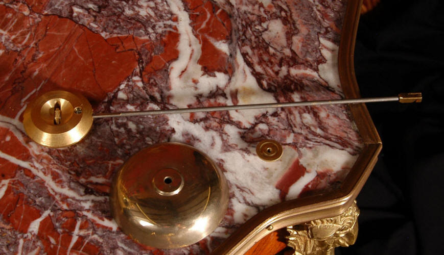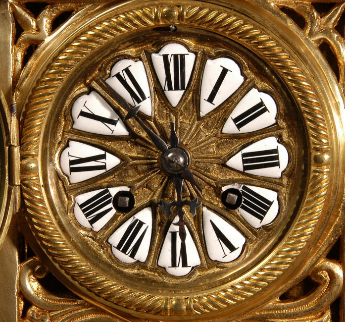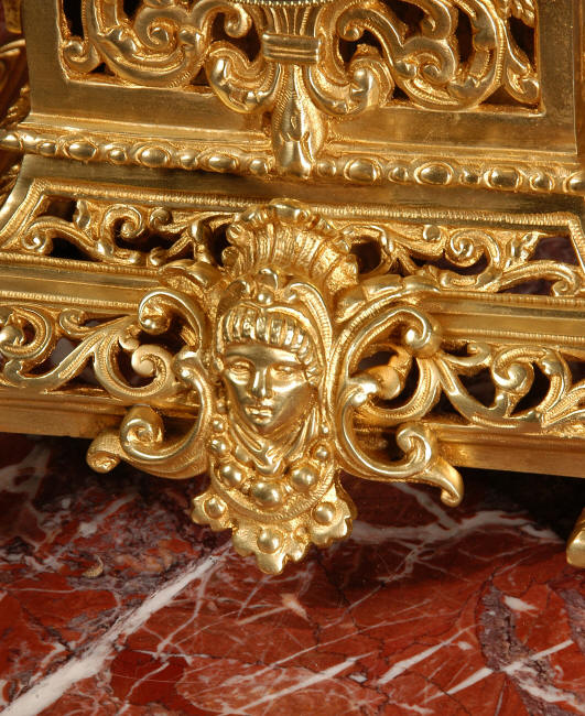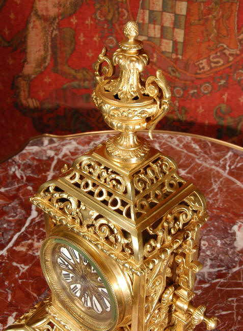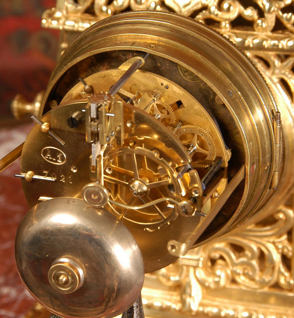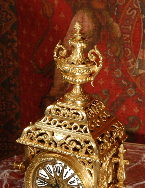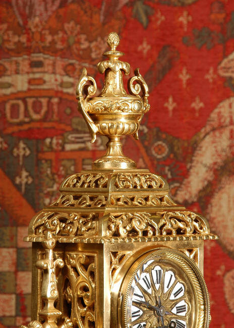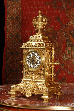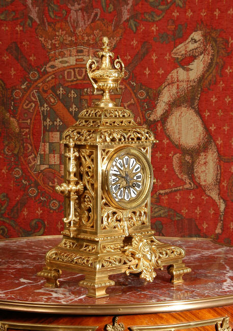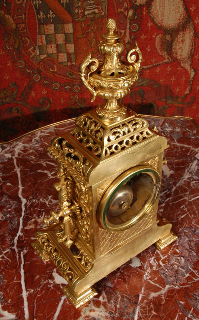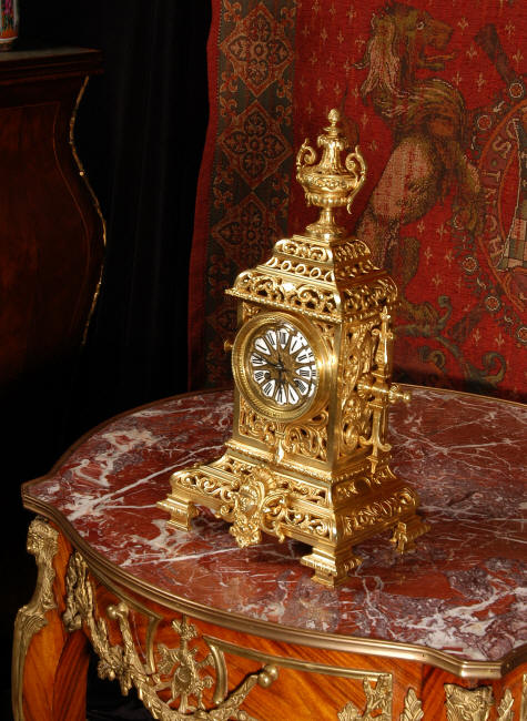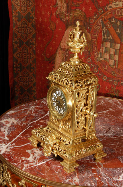 ~ French - Circa 1870 ~ ~~ Excellent condition, fully working, ready to display ~~ A superb Brass cased table clock by the famous maker Japy Freres. It is architecturally styled in a light Gothic taste, profusely fretted to the front an sides which allows the pendulum to be seen swinging within the case. The back door is glazed with bevelled glass to allow the movement to be seen. The dial is heavily molded in brass and mounted with 12 individual shield cartouches for the letters. The dial surround has an unusual rope design and the original hands are fretted blued steel. Below the dial is a goddess mask. The movement has the Japy Freres 'Grande Medaille d'Honneur' mark on the movement backplate and is of the clock makers usual high quality. Our clockmaker has completely disassembled the movement, cleaned and inspected it, replaced the springs and the pendulum and thoroughly tested it to ensure years of trouble free running. It runs for 8 days on one wind and strikes the hours and halves on a bell. Click the video clip below to hear the bell and watch the clock running! Condition of the case is