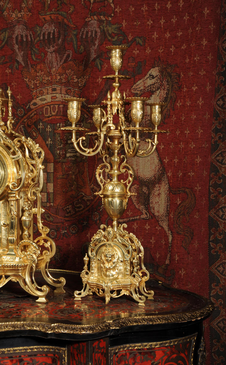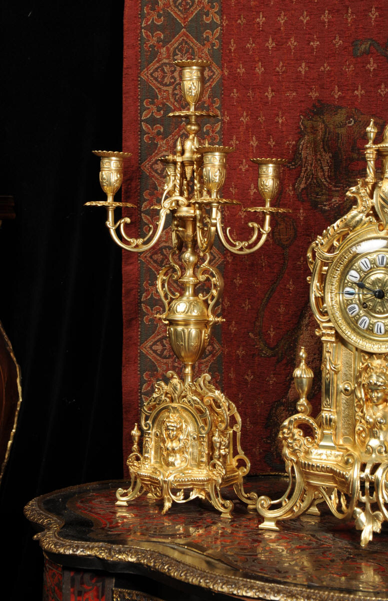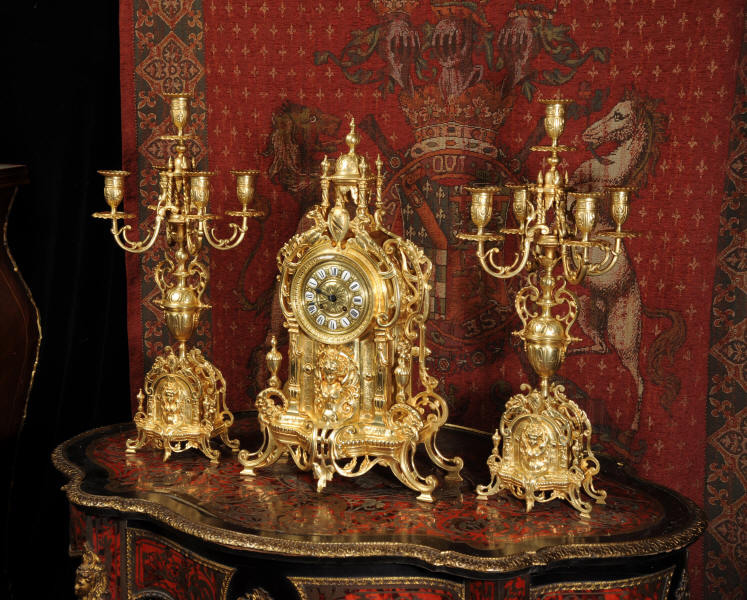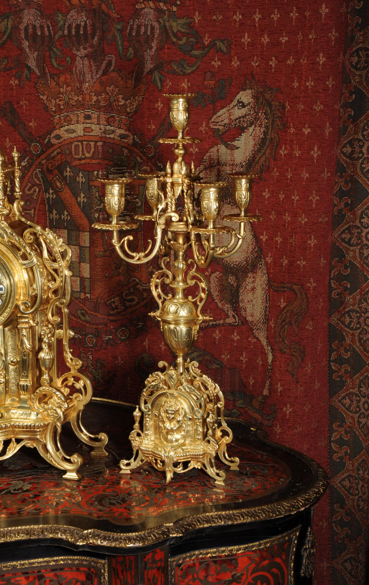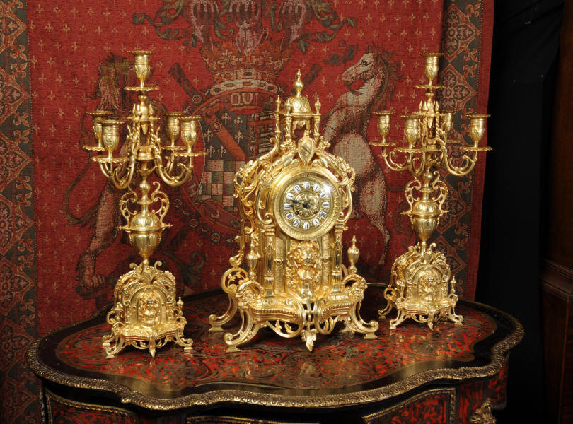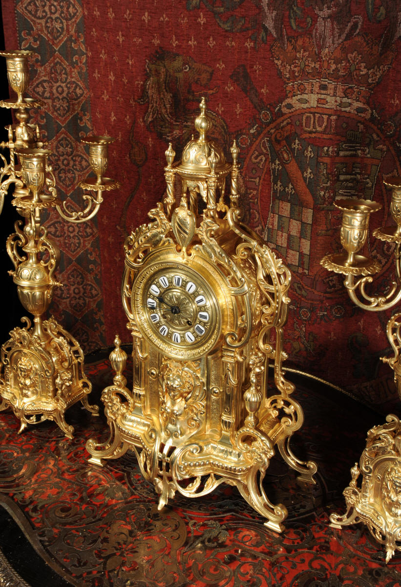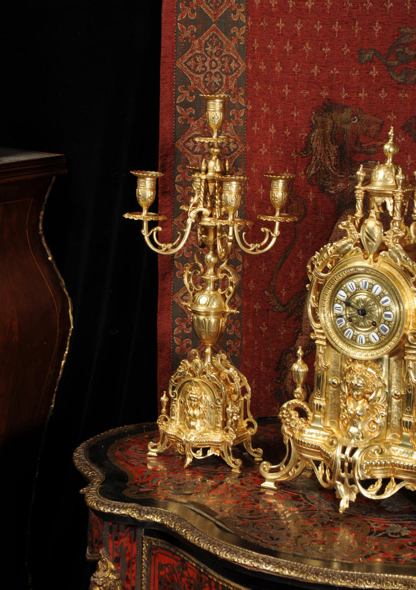 Above the dial are a pair of mythical creatures sitting on the arched top of the case with a shield between. To the top of the case is a domed temple with four pillars. Candelabra are conforming in style, with four branches. This is a large and beautifully detailed clock set, with a lovely original gild. The rear door is glazed with frosted glass. The French movement is by Japy Freres and has the makers mark on the movement backplate. It is of high quality and is in excellent clean and running condition having been fully overhauled by our clockmaker. Pendulum is a replacement. It runs for 8 days and strikes the hours and halves on a bell. Click the video clip below to hear the bell and watch the clock running! Condition of the case is excellent, the original gilding is beautifully clean and bright with hardly any wear or discolouration and there are no losses. The dial is also in excellent condition just a few tiny nibbles to the cartouches. Candelabra are slightly distorted. The rear door has some scratches to the glass. The set makes a stunning display as you can see below.