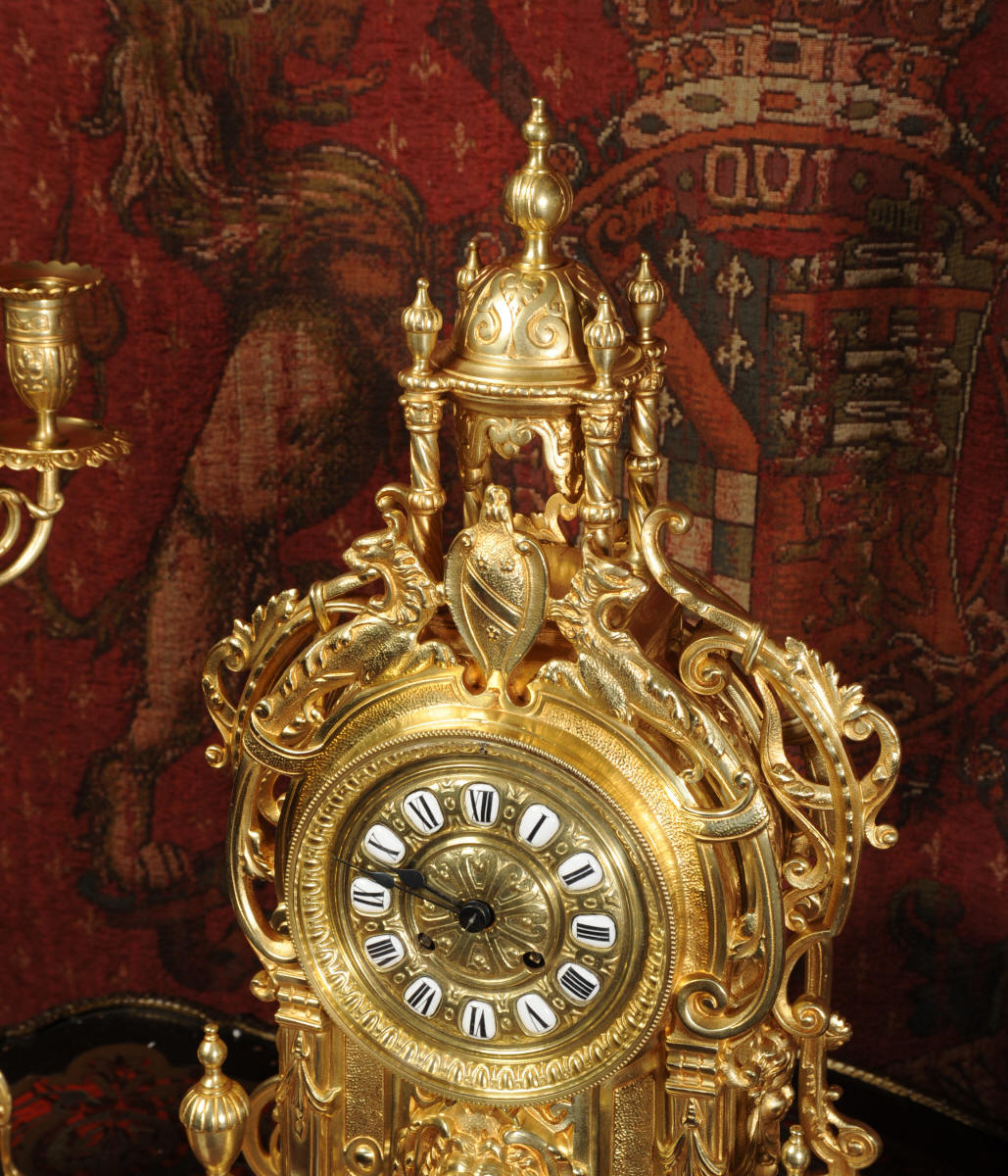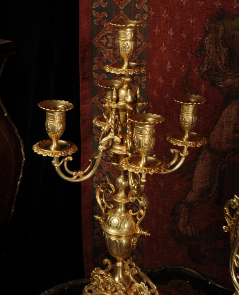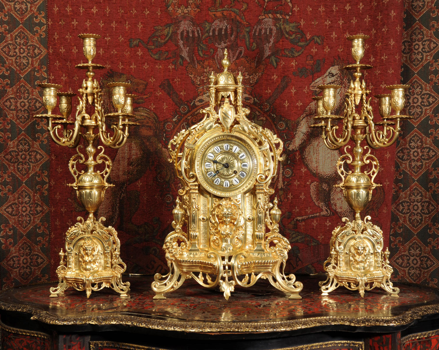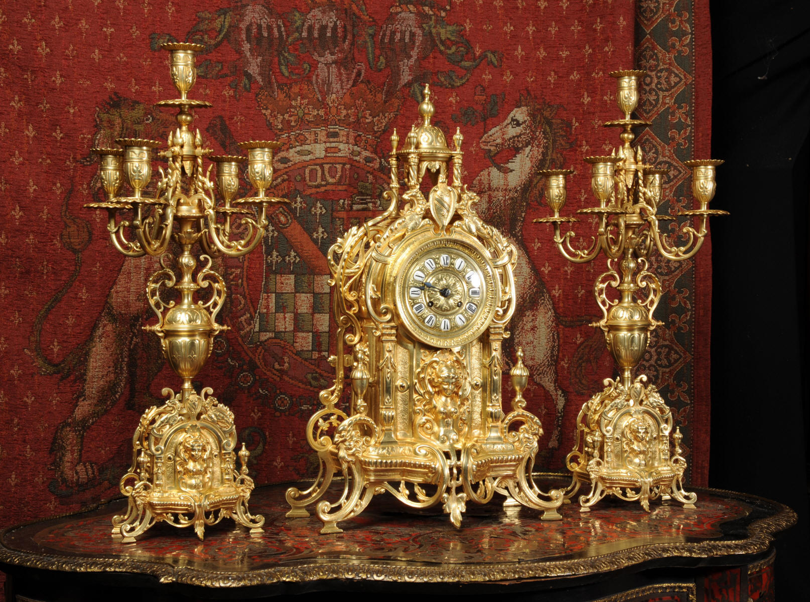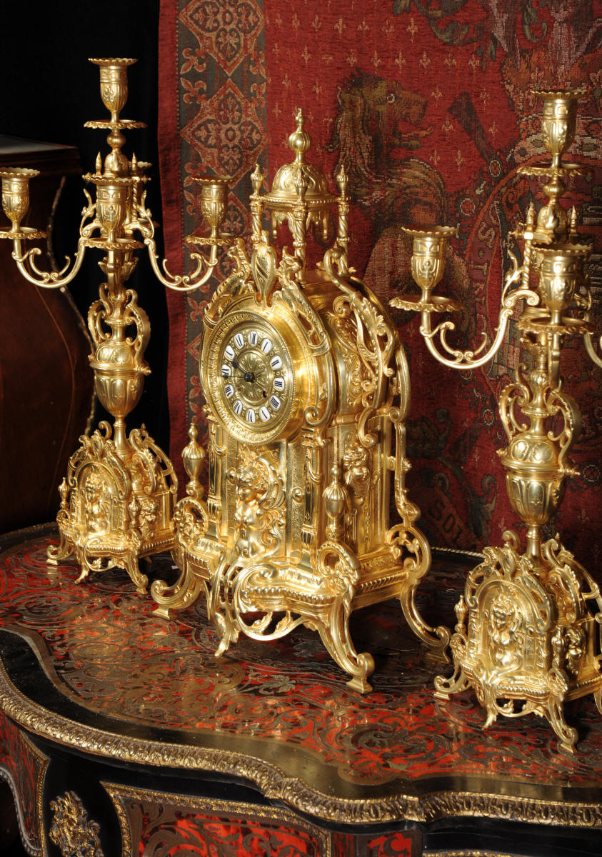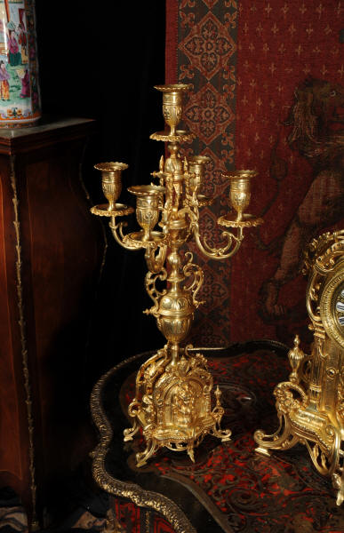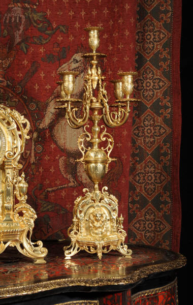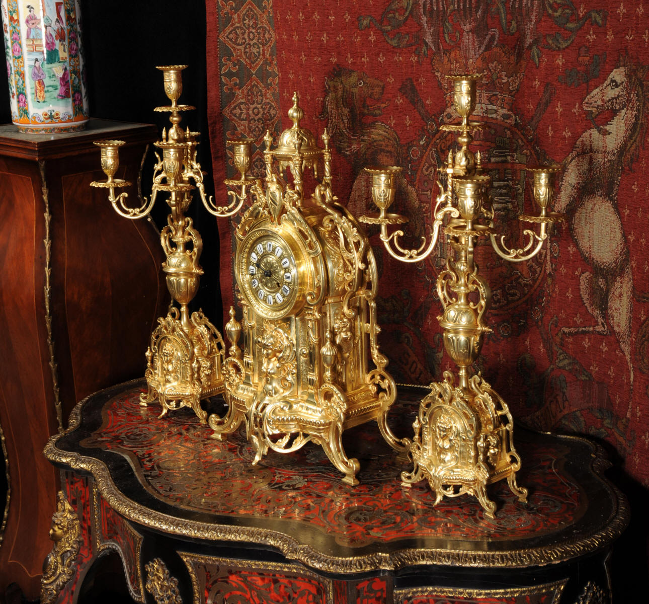 Above the dial are a pair of mythical creatures sitting on the arched top of the case with a shield between. To the top of the case is a domed temple with four pillars. Candelabra are conforming in style, with four branches. This is a large and beautifully detailed clock set, with a lovely original gild. The rear door is glazed with frosted glass. The French movement is by Japy Freres and has the makers mark on the movement backplate. It is of high quality and is in excellent clean and running condition having been fully overhauled by our clockmaker. Pendulum is a replacement. It runs for 8 days and strikes the hours and halves on a bell. Click the video clip below to hear the bell and watch the clock running! Condition of the case is excellent, the original gilding is beautifully clean and bright with hardly any wear or discolouration and there are no losses. The dial is also in excellent condition just a few tiny nibbles to the cartouches. Candelabra are slightly distorted. The rear door has some scratches to the glass. The set makes a stunning display as you can see below.
