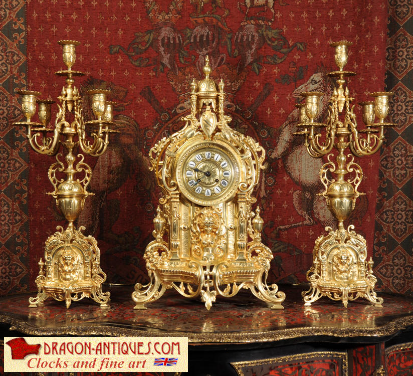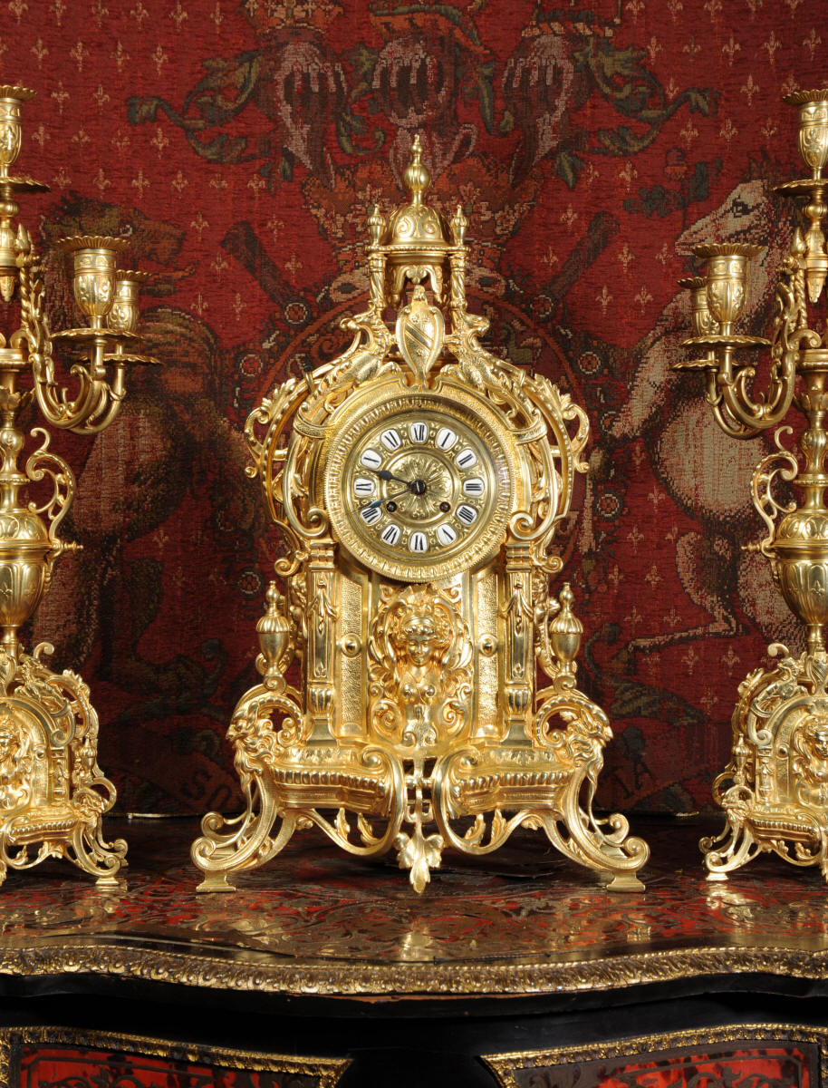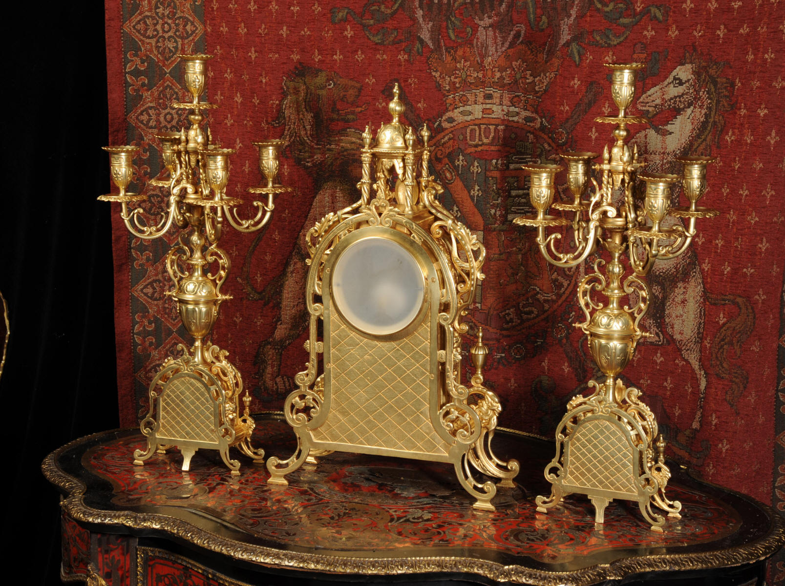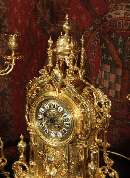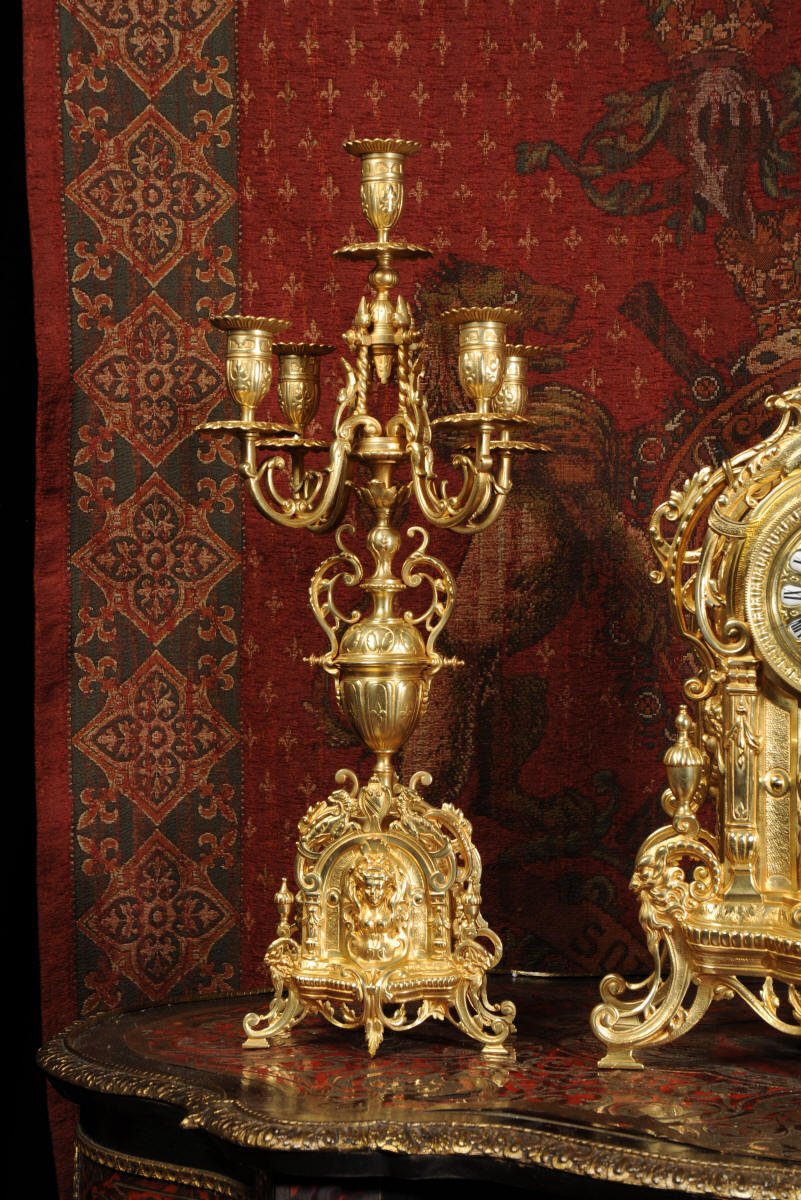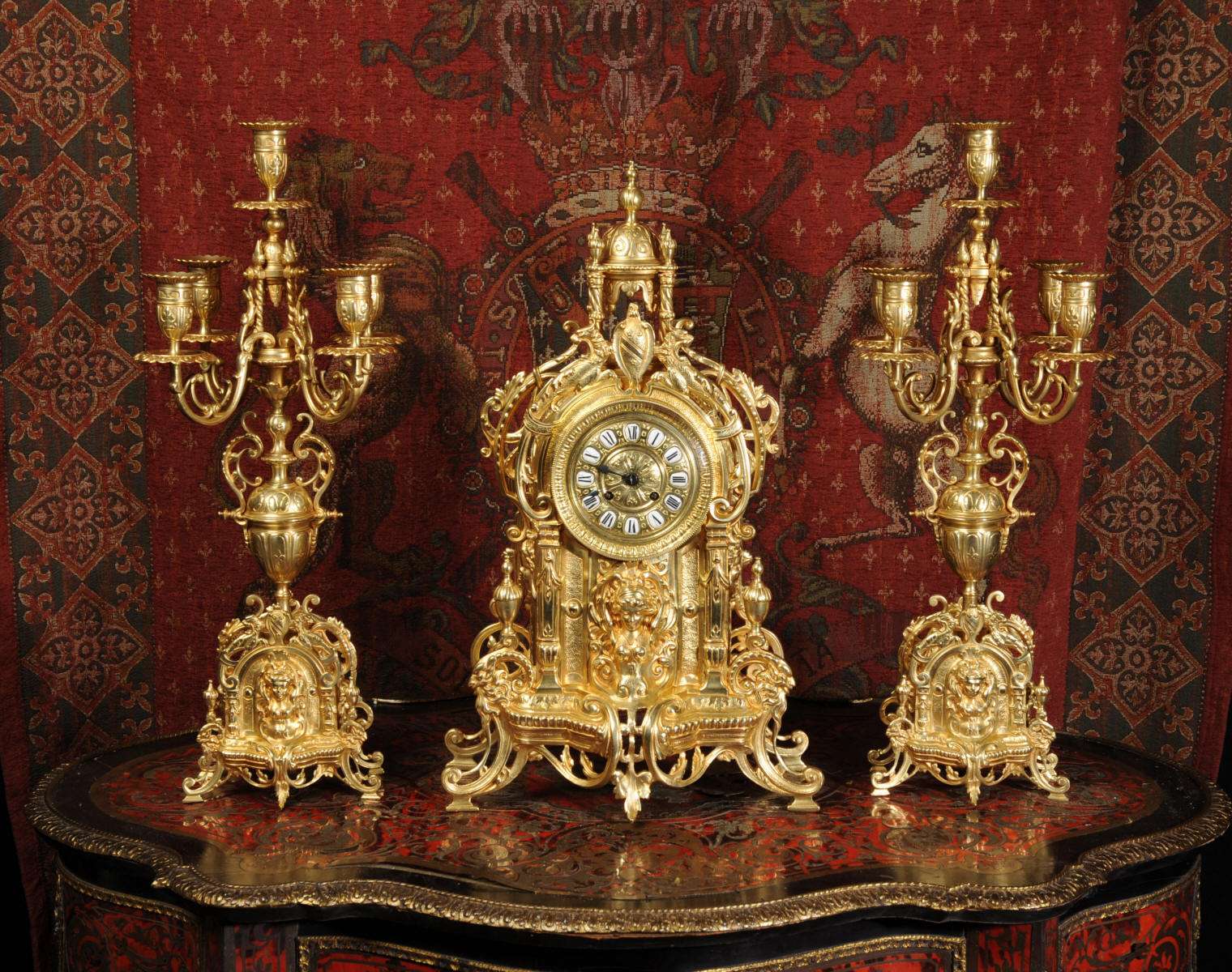 Above the dial are a pair of mythical creatures sitting on the arched top of the case with a shield between. To the top of the case is a domed temple with four pillars. Candelabra are conforming in style, with four branches. This is a large and beautifully detailed clock set, with a lovely original gild. The rear door is glazed with frosted glass. The French movement is by Japy Freres and has the makers mark on the movement backplate. It is of high quality and is in excellent clean and running condition having been fully overhauled by our clockmaker. Pendulum is a replacement. It runs for 8 days and strikes the hours and halves on a bell. Click the video clip below to hear the bell and watch the clock running! Condition of the case is excellent, the original gilding is beautifully clean and bright with hardly any wear or discolouration and there are no losses. The dial is also in excellent condition just a few tiny nibbles to the cartouches. Candelabra are slightly distorted. The rear door has some scratches to the glass. The set makes a stunning display as you can see below.