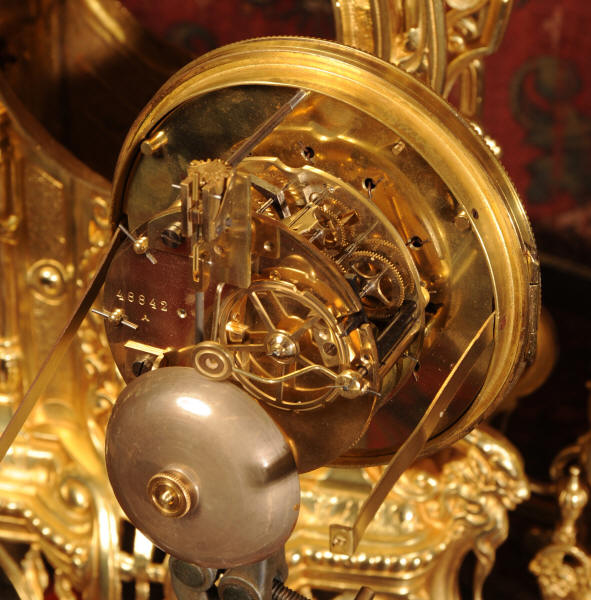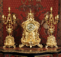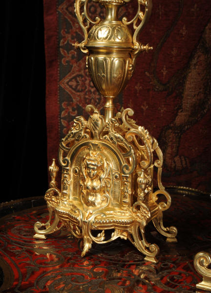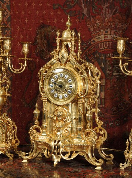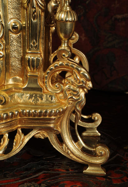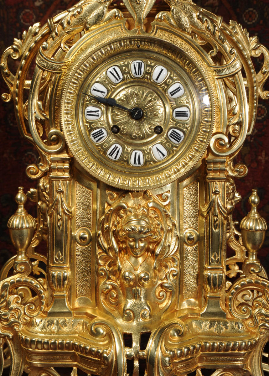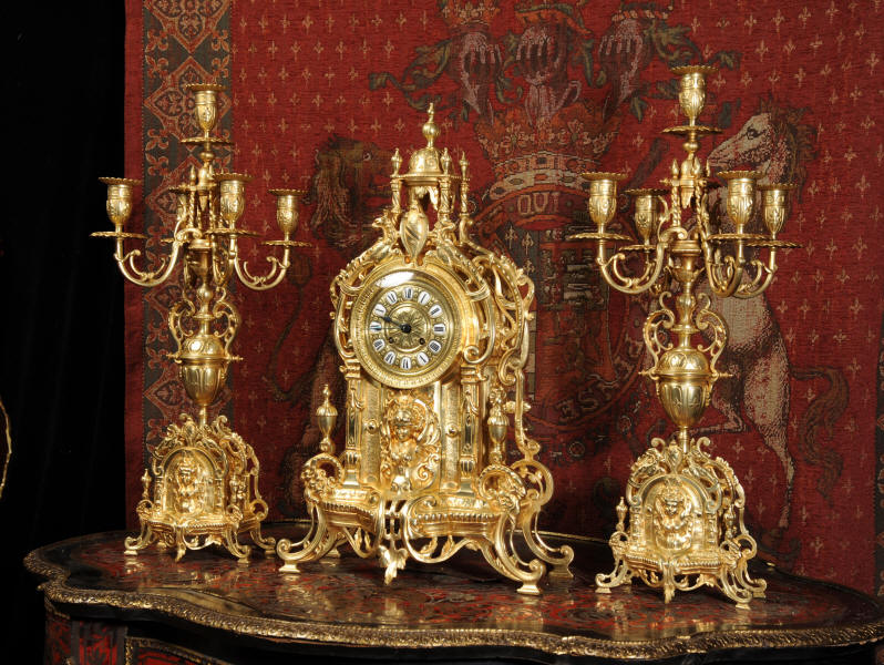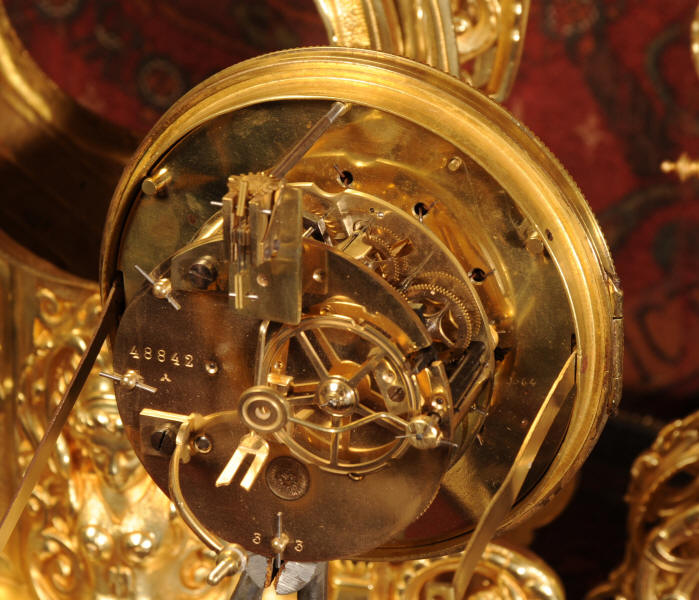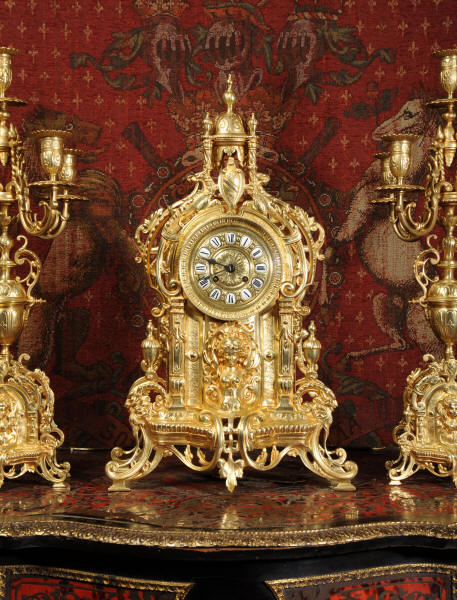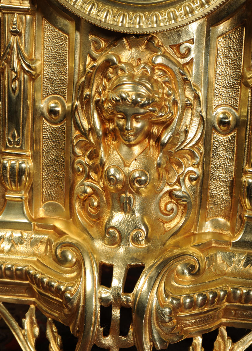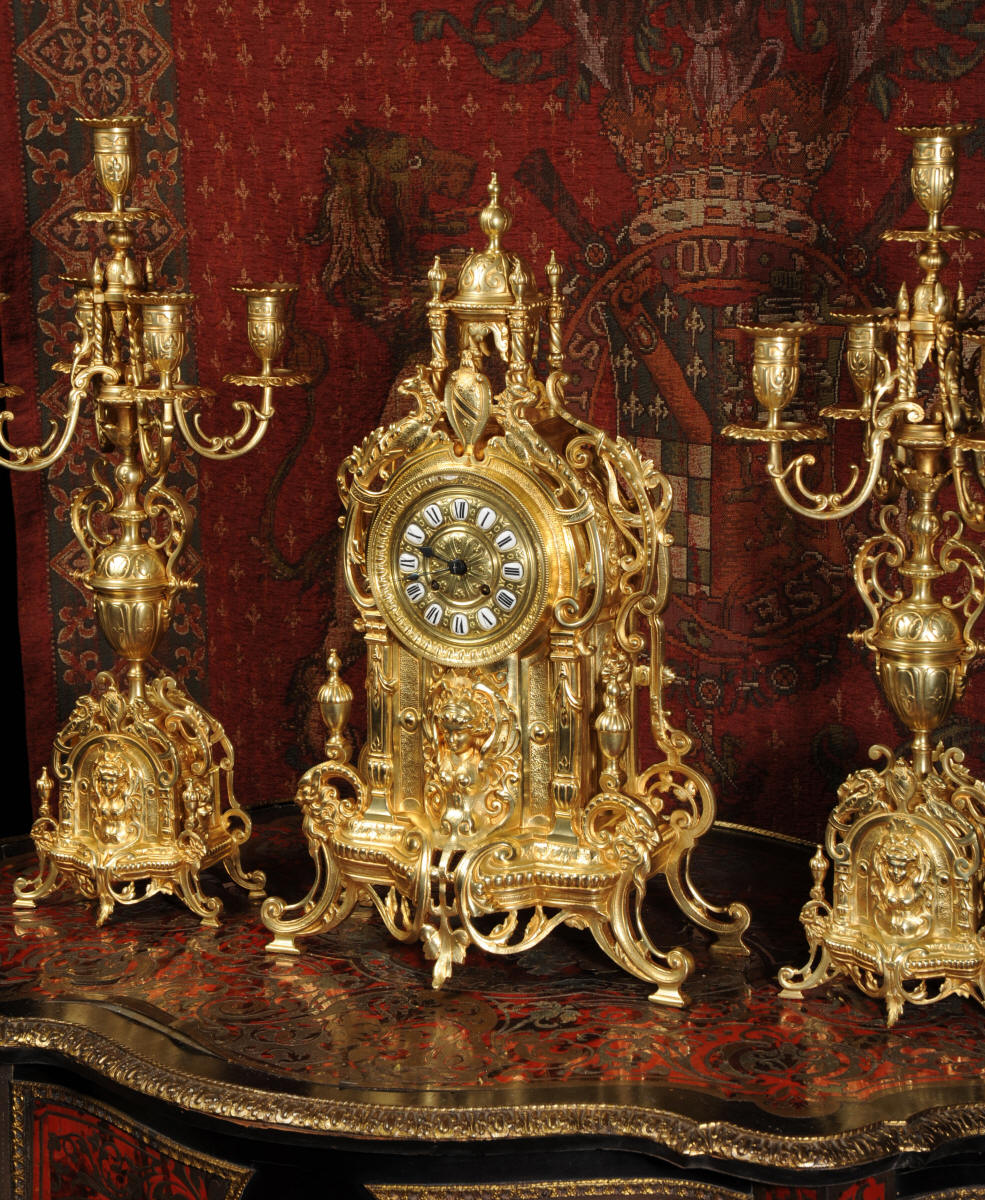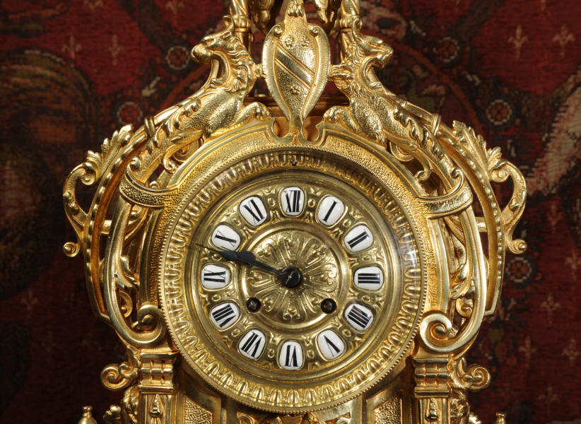 Above the dial are a pair of mythical creatures sitting on the arched top of the case with a shield between. To the top of the case is a domed temple with four pillars. Candelabra are conforming in style, with four branches. This is a large and beautifully detailed clock set, with a lovely original gild. The rear door is glazed with frosted glass. The French movement is by Japy Freres and has the makers mark on the movement backplate. It is of high quality and is in excellent clean and running condition having been fully overhauled by our clockmaker. Pendulum is a replacement. It runs for 8 days and strikes the hours and halves on a bell. Click the video clip below to hear the bell and watch the clock running! Condition of the case is excellent, the original gilding is beautifully clean and bright with hardly any wear or discolouration and there are no losses. The dial is also in excellent condition just a few tiny nibbles to the cartouches. Candelabra are slightly distorted. The rear door has some scratches to the glass. The set makes a stunning display as you can see below.