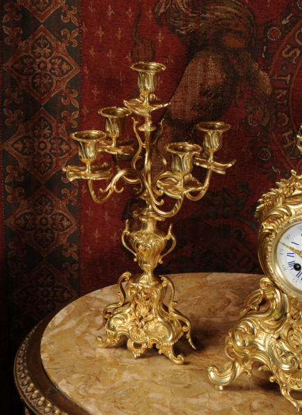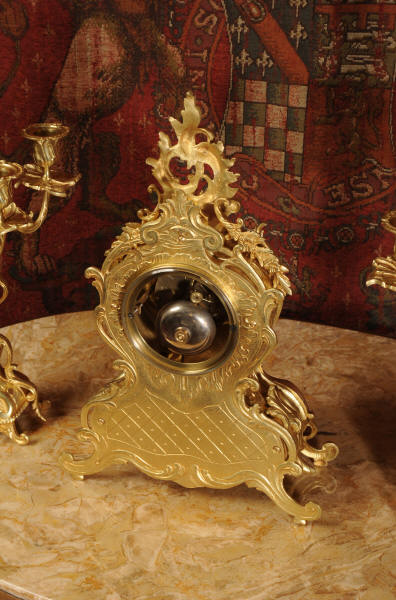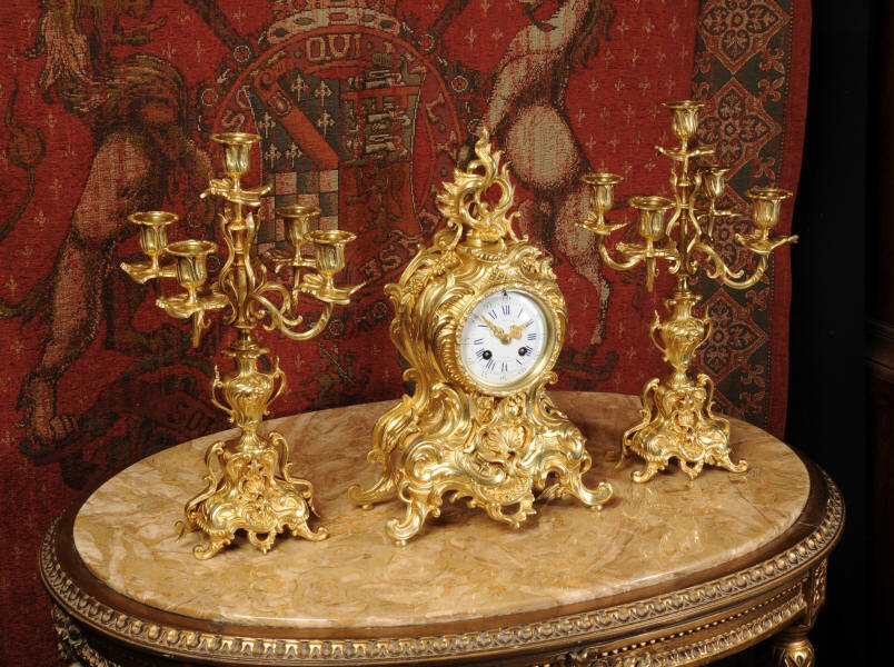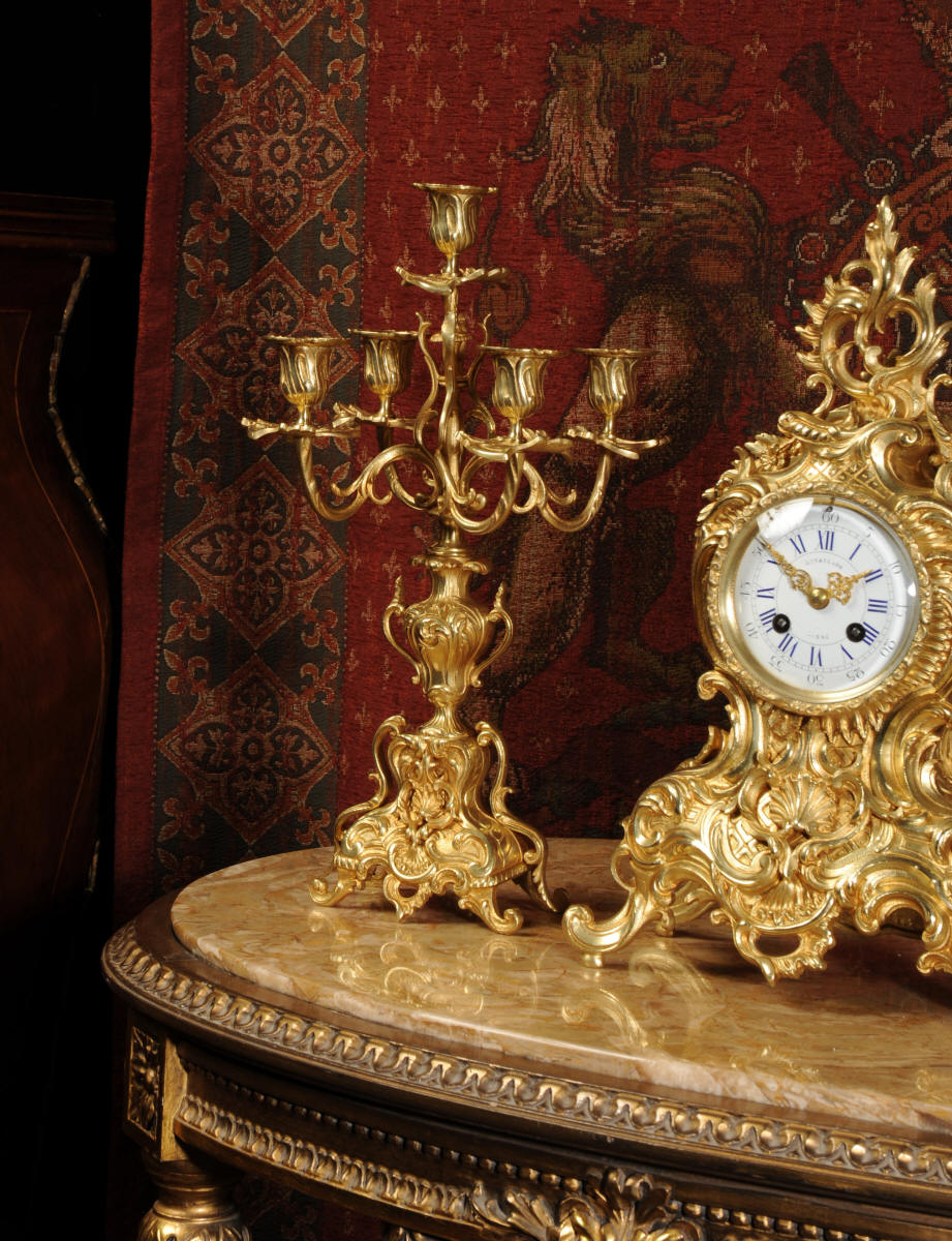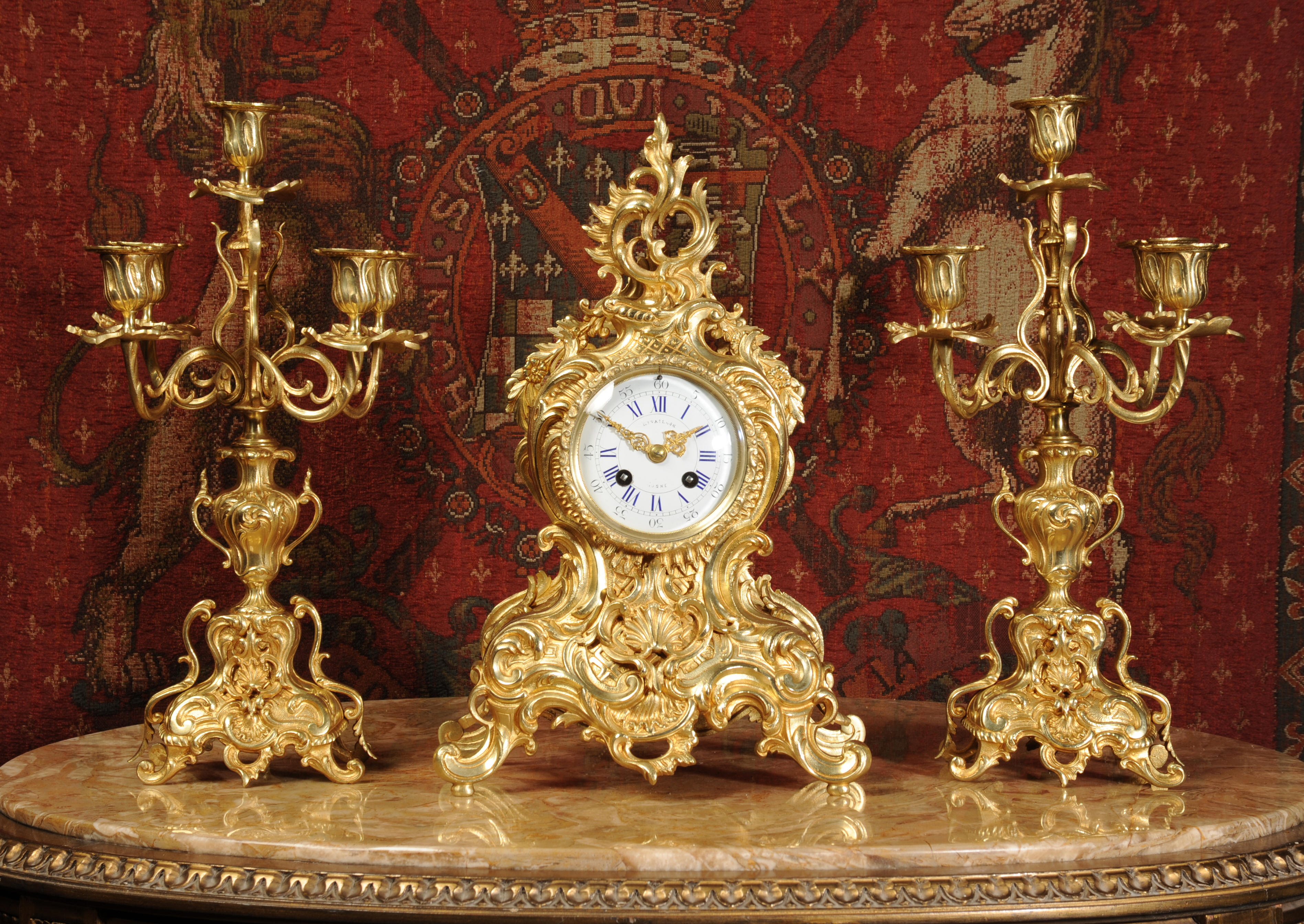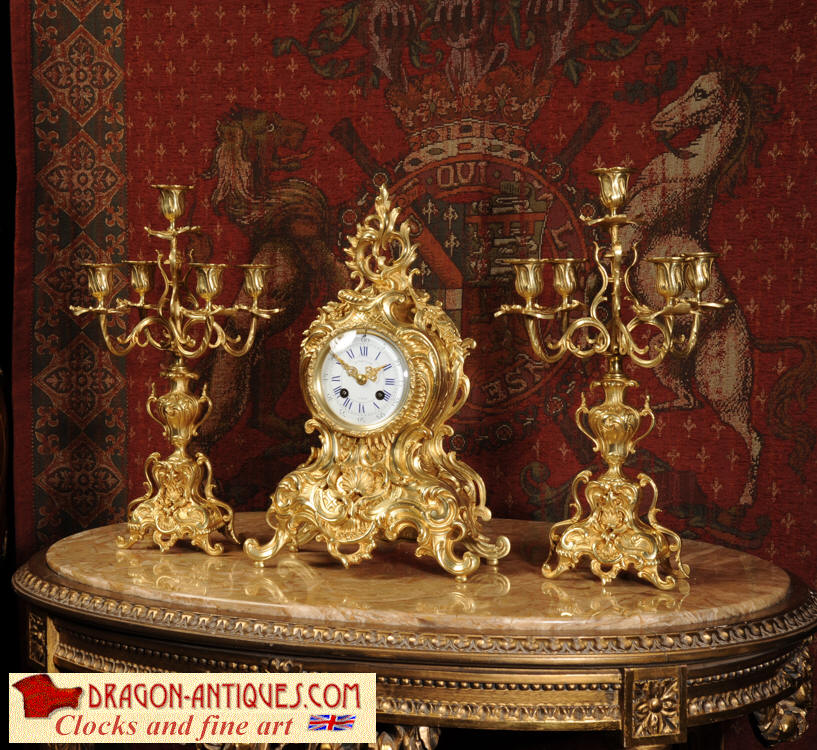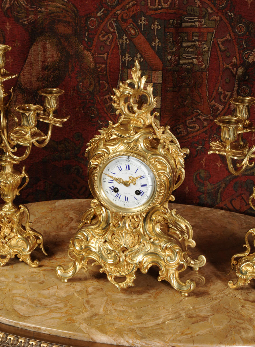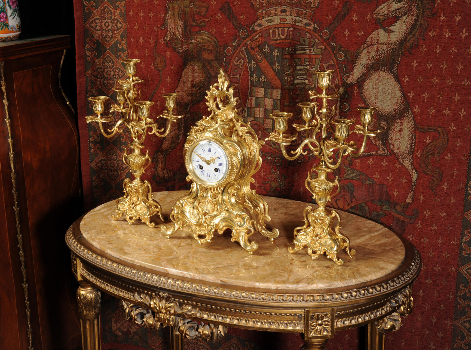 The dial is enamel on copper with a blue hour ring and separate outside minute ring. It is complete with it's original finely fretted gilt brass hands and convex glazed Rococo bezel. The rear door is also glazed to the allow the movement to be seen. The French movement is of high quality and is by A. D. Mougin. It has the clockmakers mark on the movement backplate. It is in excellent clean and running condition having been fully overhauled by our clockmaker. Pendulum is a replacement. It runs for 8 days and strikes the hours and halves on a bell. Click the video clip below to hear the bell and watch the clock running! Condition of the case is excellent, the original gilding is beautifully clean and bright with hardly any wear or discolouration and there are no losses. The dial is also in excellent condition just some tiny nibbles next to the winding holes. Candelabra are slightly distorted. The set makes a stunning display as you can see below.