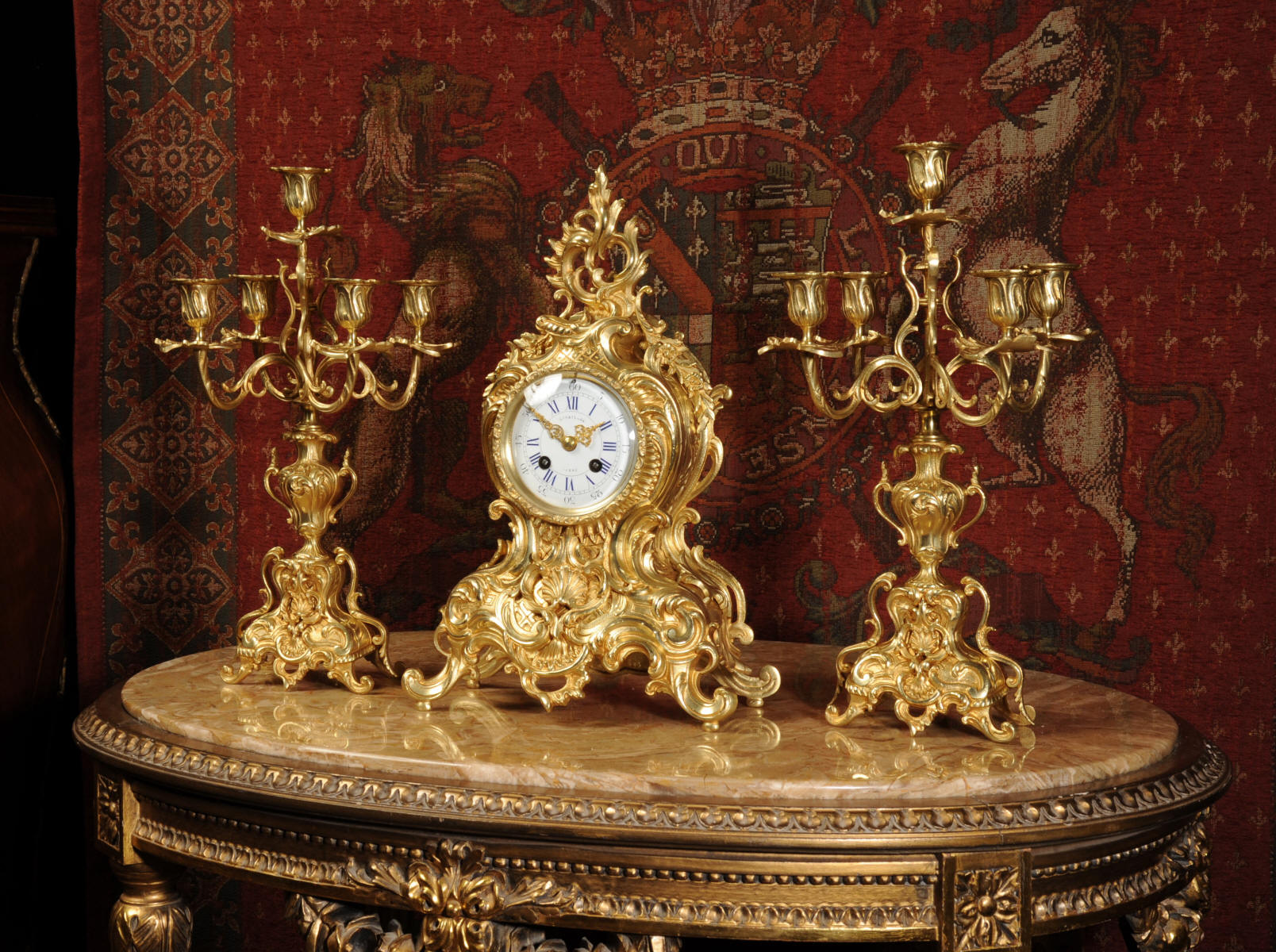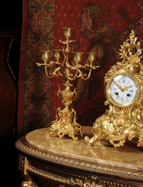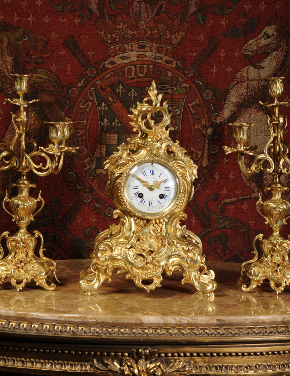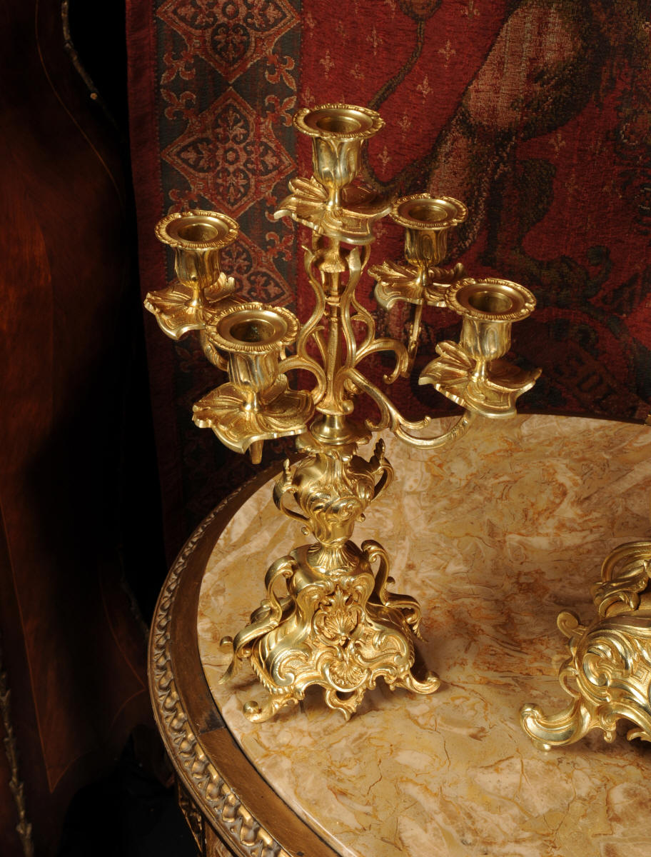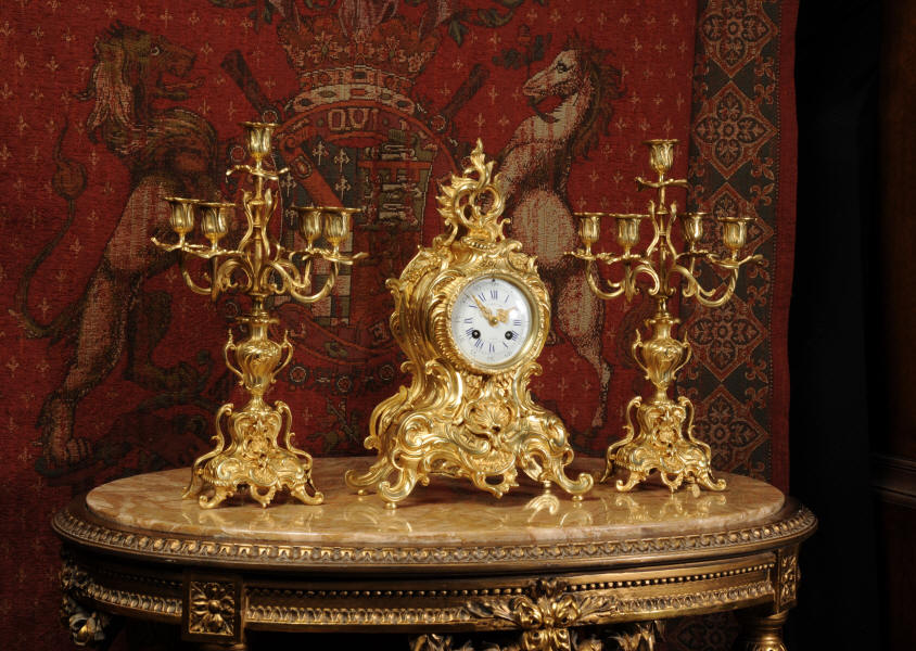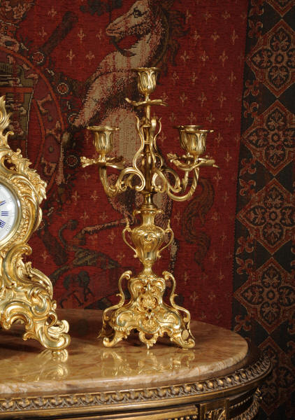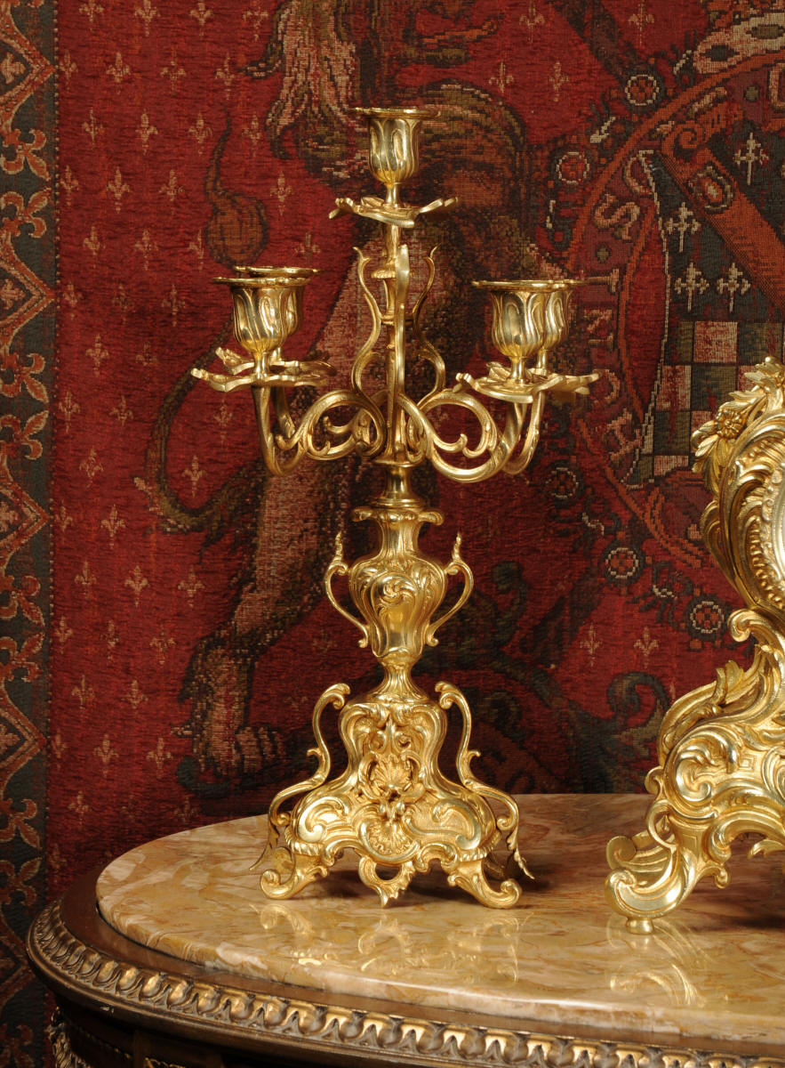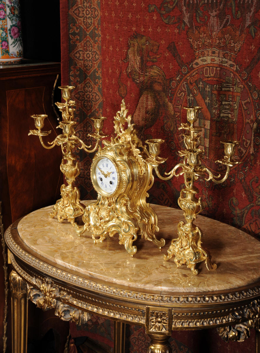 The dial is enamel on copper with a blue hour ring and separate outside minute ring. It is complete with it's original finely fretted gilt brass hands and convex glazed Rococo bezel. The rear door is also glazed to the allow the movement to be seen. The French movement is of high quality and is by A. D. Mougin. It has the clockmakers mark on the movement backplate. It is in excellent clean and running condition having been fully overhauled by our clockmaker. Pendulum is a replacement. It runs for 8 days and strikes the hours and halves on a bell. Click the video clip below to hear the bell and watch the clock running! Condition of the case is excellent, the original gilding is beautifully clean and bright with hardly any wear or discolouration and there are no losses. The dial is also in excellent condition just some tiny nibbles next to the winding holes. Candelabra are slightly distorted. The set makes a stunning display as you can see below.