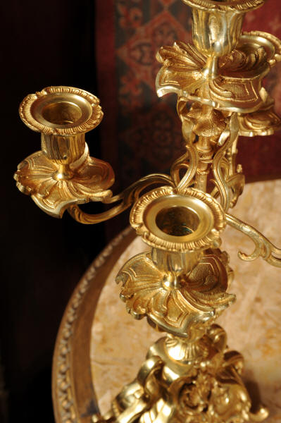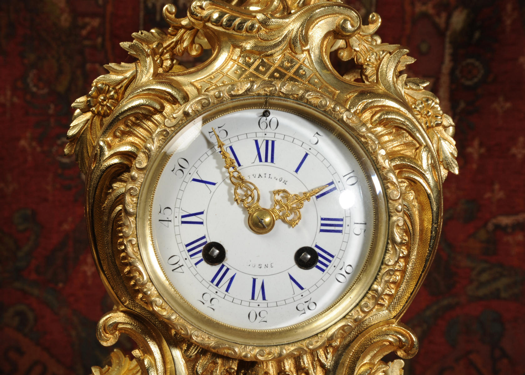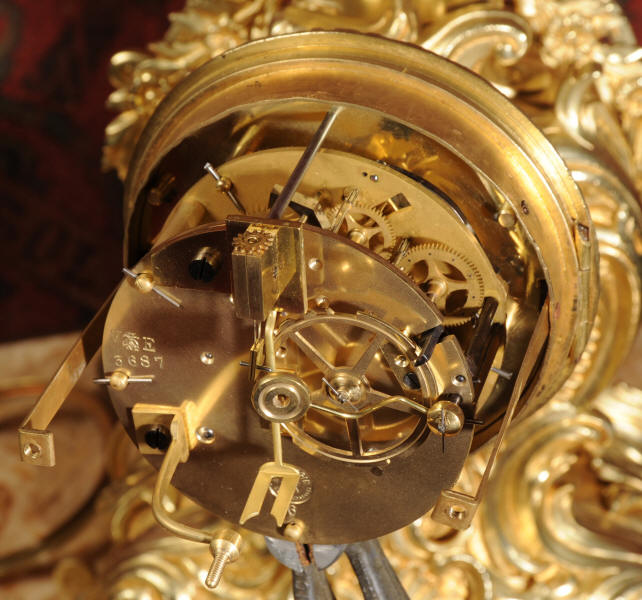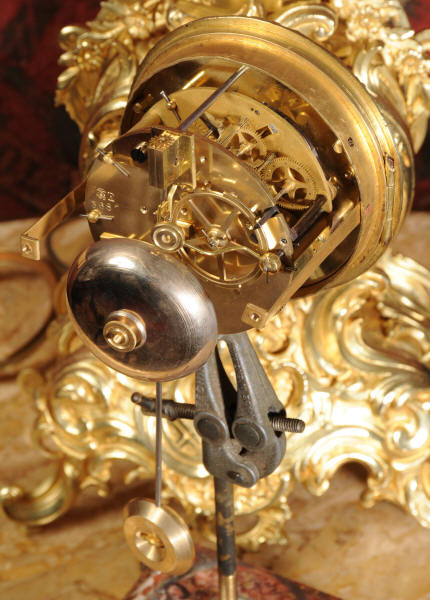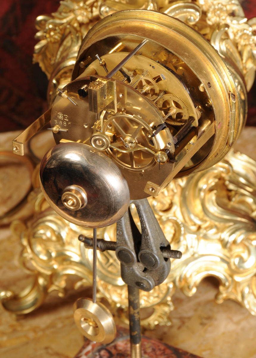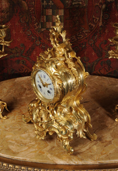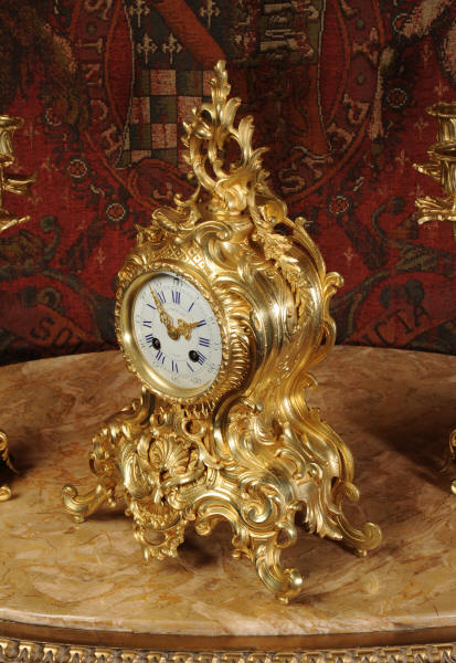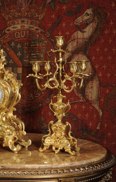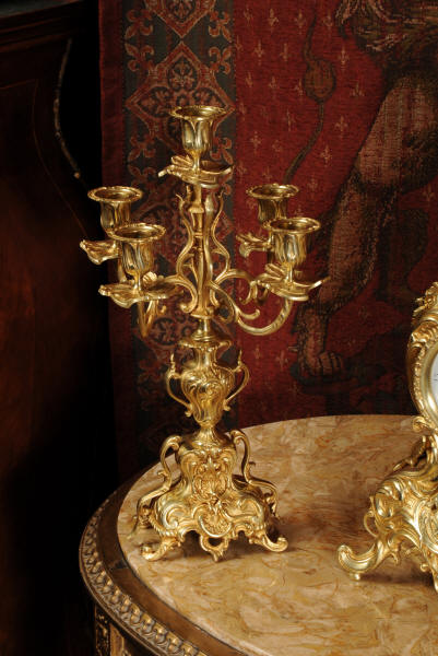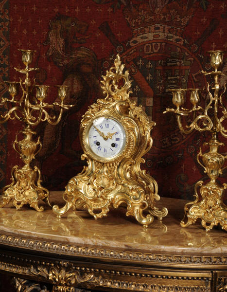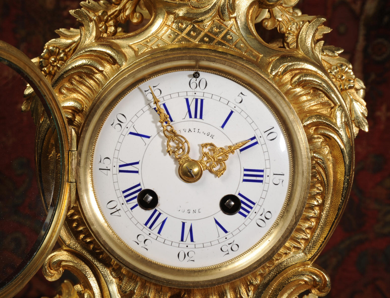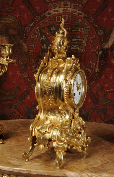 The dial is enamel on copper with a blue hour ring and separate outside minute ring. It is complete with it's original finely fretted gilt brass hands and convex glazed Rococo bezel. The rear door is also glazed to the allow the movement to be seen. The French movement is of high quality and is by A. D. Mougin. It has the clockmakers mark on the movement backplate. It is in excellent clean and running condition having been fully overhauled by our clockmaker. Pendulum is a replacement. It runs for 8 days and strikes the hours and halves on a bell. Click the video clip below to hear the bell and watch the clock running! Condition of the case is excellent, the original gilding is beautifully clean and bright with hardly any wear or discolouration and there are no losses. The dial is also in excellent condition just some tiny nibbles next to the winding holes. Candelabra are slightly distorted. The set makes a stunning display as you can see below.