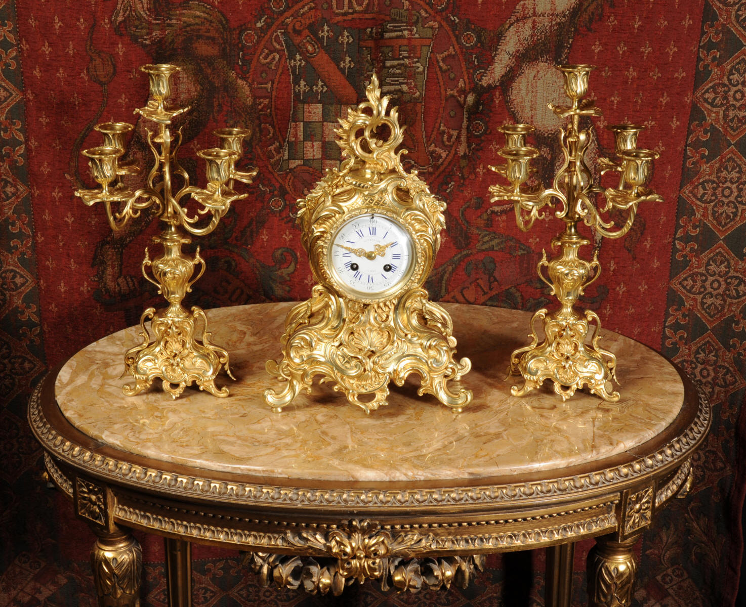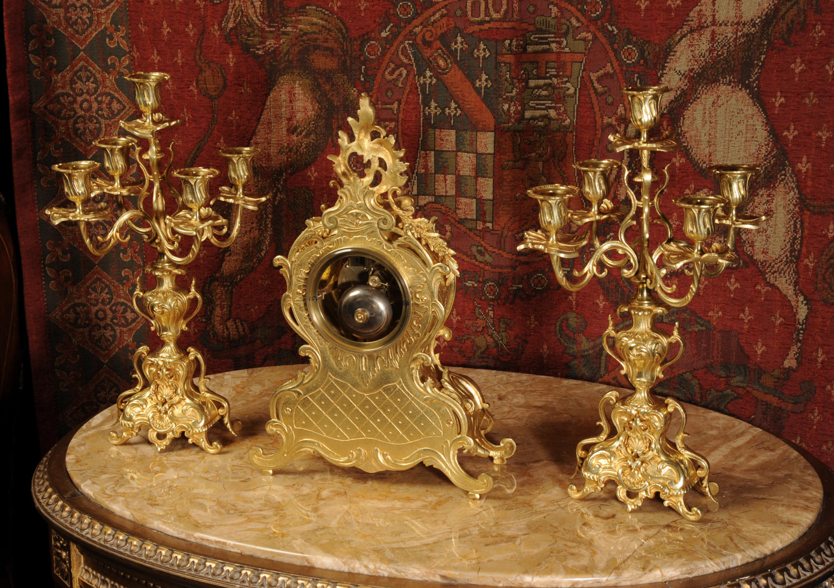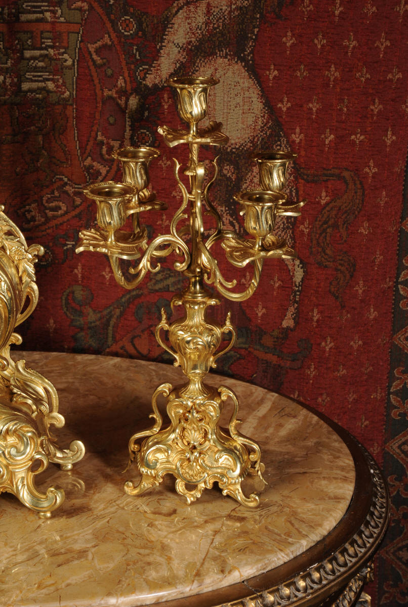 ~ French - Circa 1900 ~ ~~ Excellent condition, fully overhauled ~~ A stunning original antique French clock set. It is beautifully modelled in gilded brass in the Rococo style. Sweeping C scrolls, elaborately flowing floral swags and shells adorn the waisted shape. Candelabra are conforming in style with handled urns and arms of twisting foliage. Nozzles and drip trays are formed as flower buds and petals.