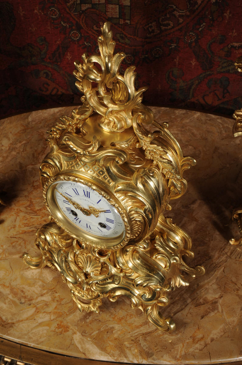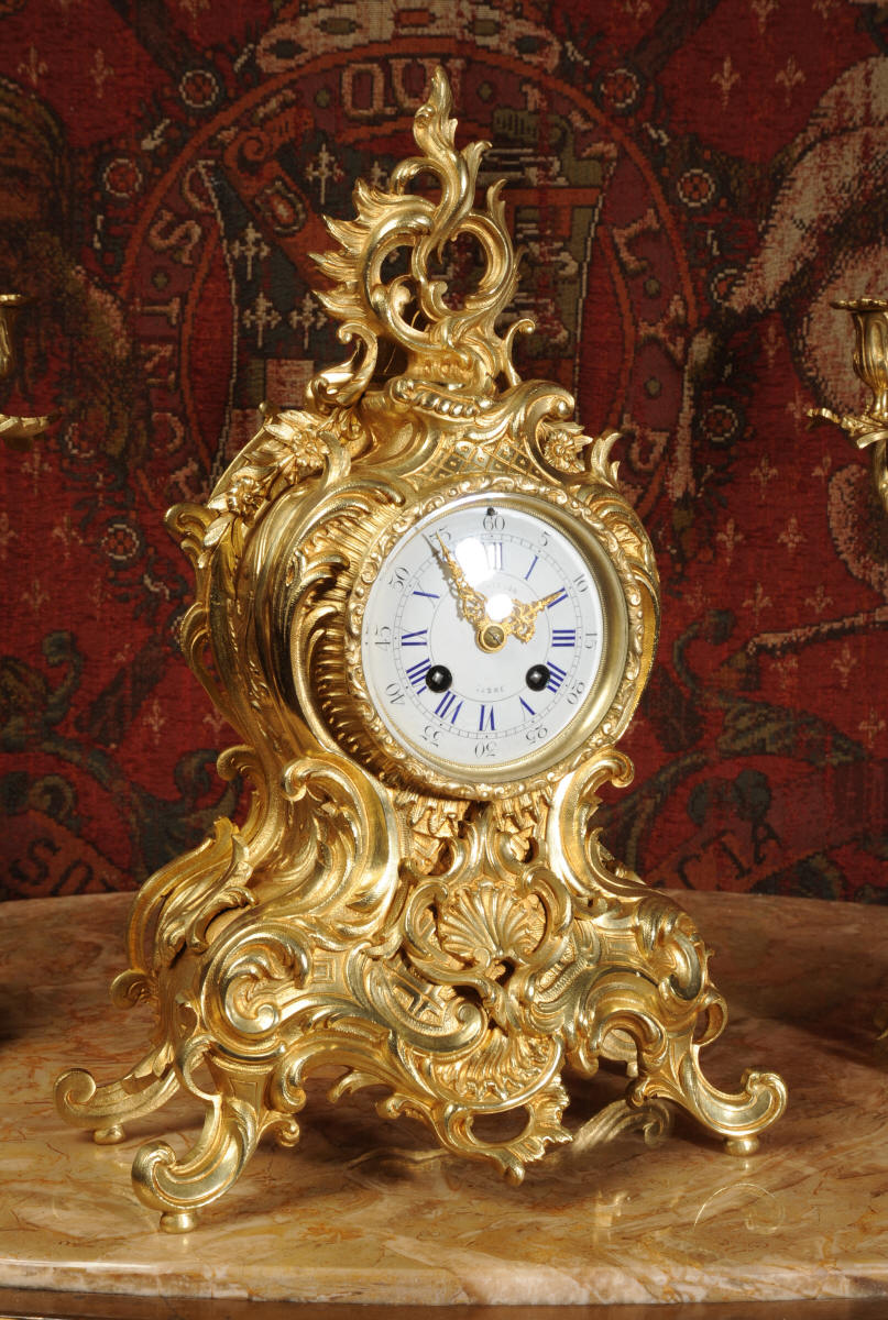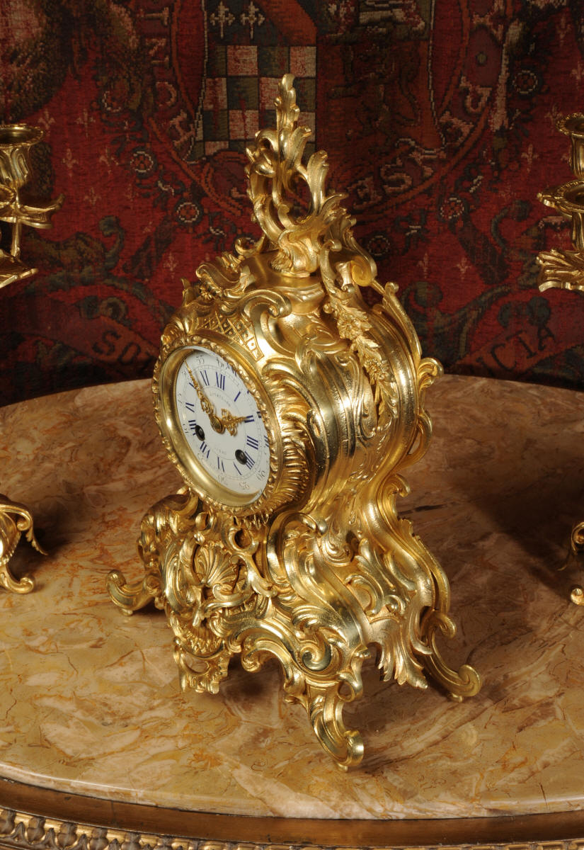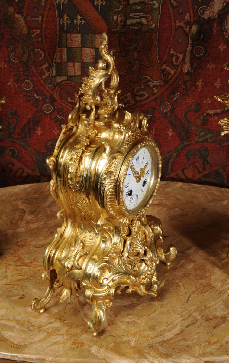 ~ French - Circa 1900 ~ ~~ Excellent condition, fully overhauled ~~ A stunning original antique French clock set. It is beautifully modelled in gilded brass in the Rococo style. Sweeping C scrolls, elaborately flowing floral swags and shells adorn the waisted shape. Candelabra are conforming in style with handled urns and arms of twisting foliage. Nozzles and drip trays are formed as flower buds and petals.