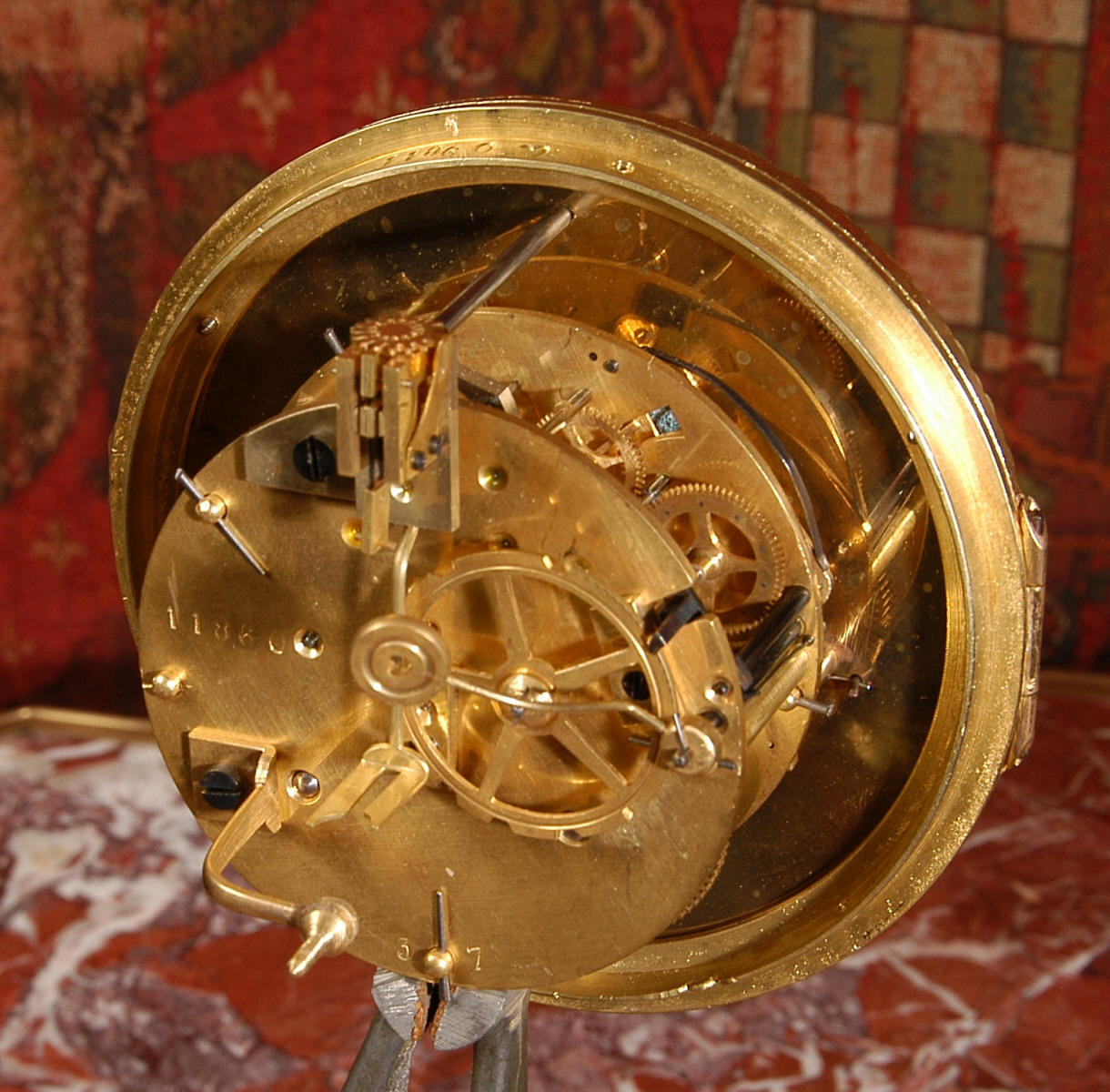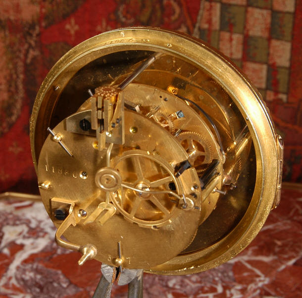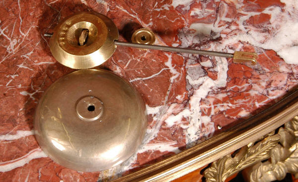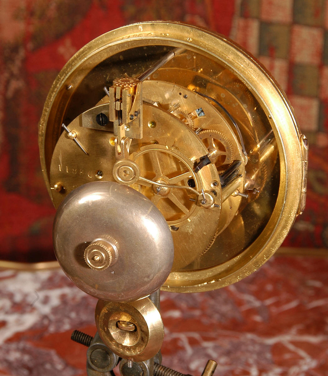 The French movement is of high quality and is in excellent clean and running condition having been fully overhauled by our clockmaker. Pendulum is original. It runs for 8 days and strikes the hours and halves on a bell. Click the video clip below to hear the bell and watch the clock running!