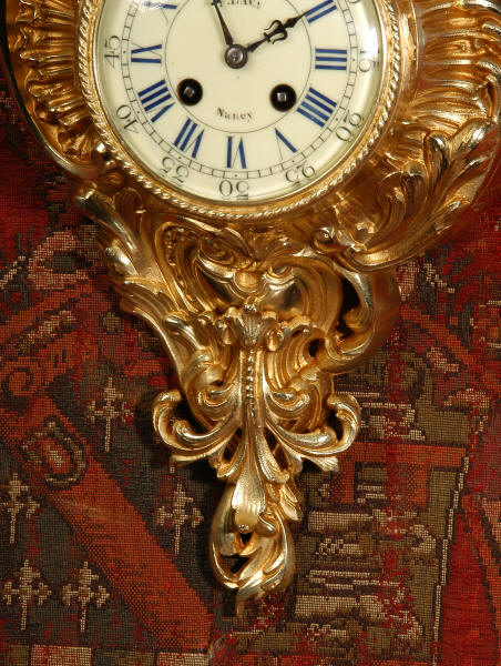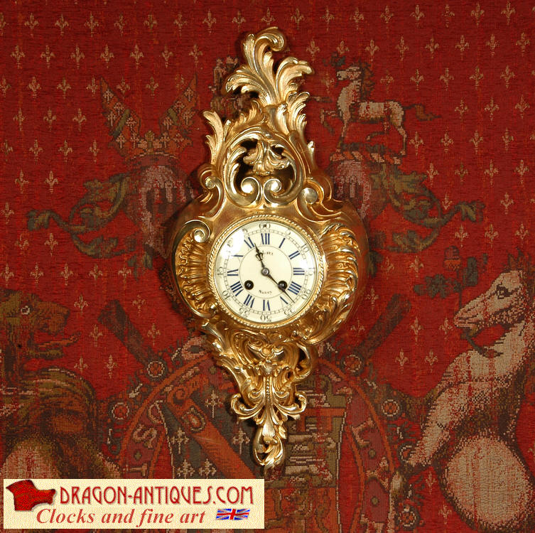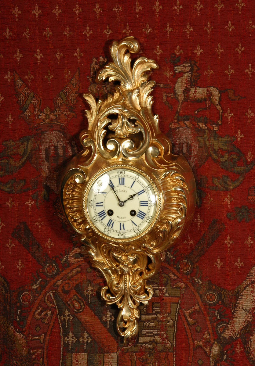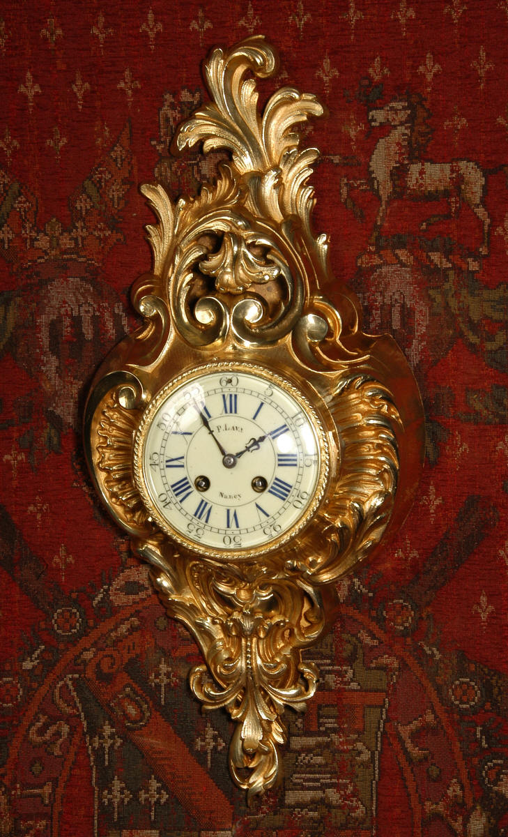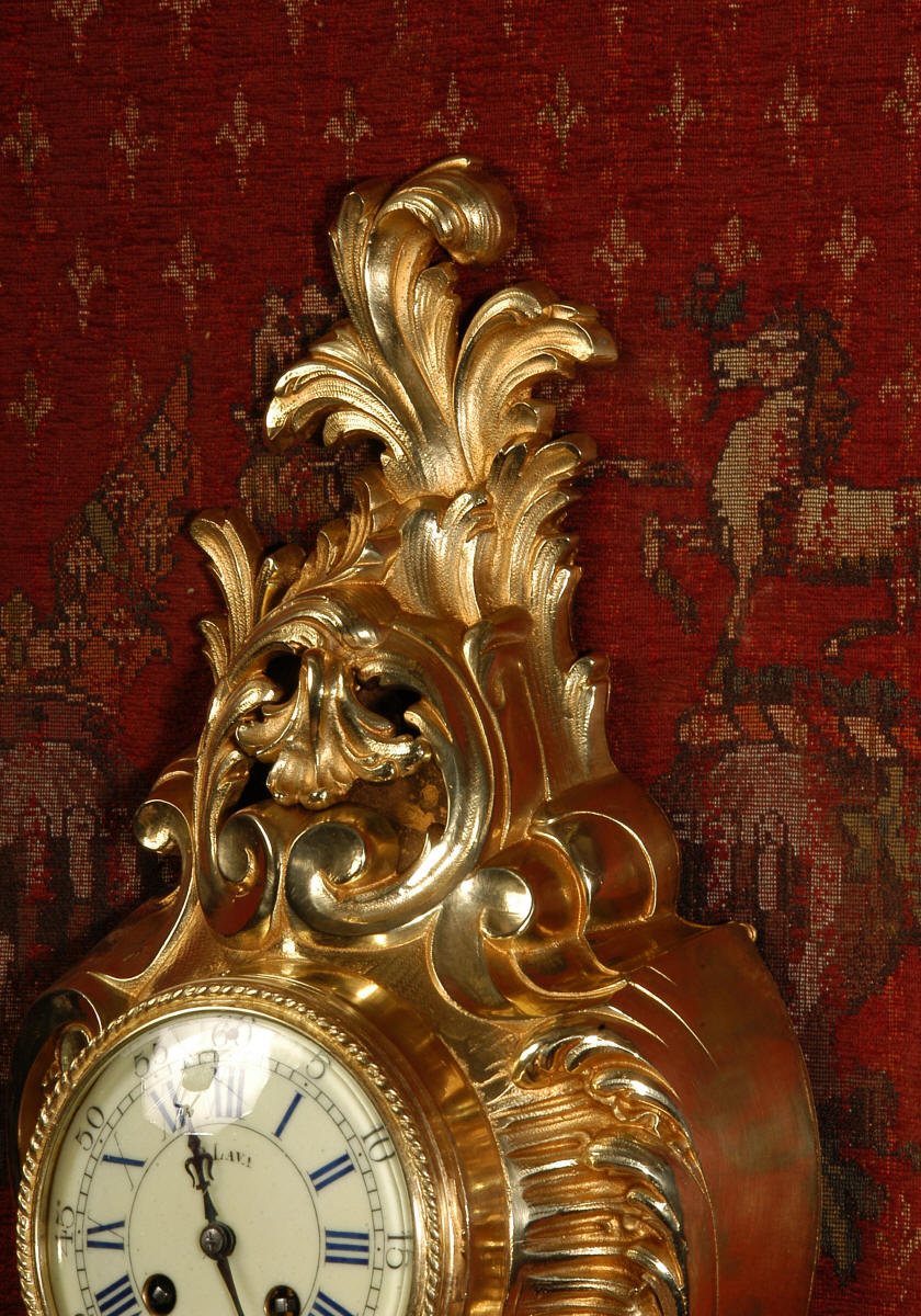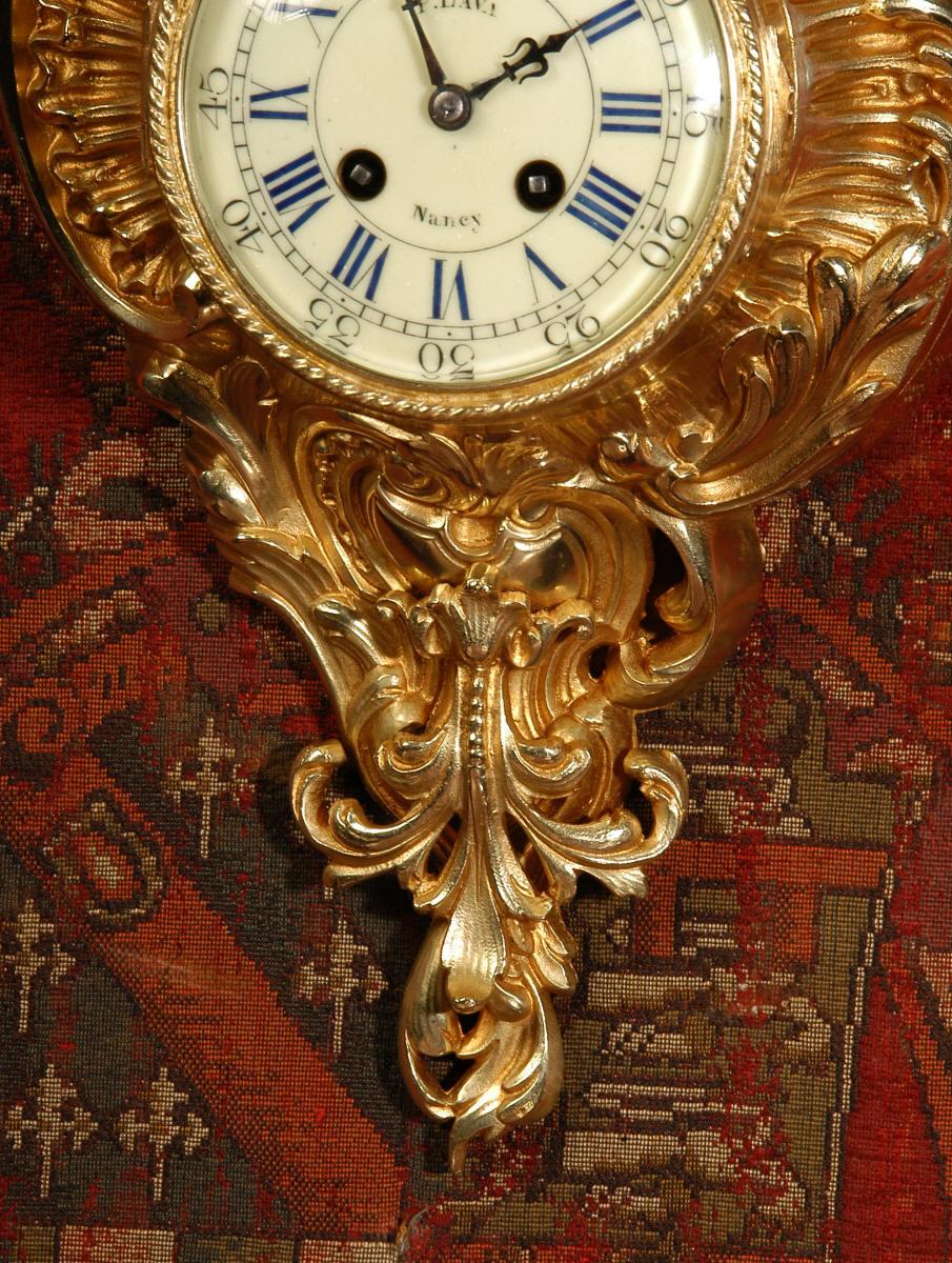~ French - Circa 1870 ~ ~~ Excellent condition, fully overhauled ~~ A very decorative antique French gilt brass cartel wall clock. It is Rococo in style, asymmetric with acanthus shoulders and a large acanthus leaf top. Acanthus flowers hang below the dial. It is in stunning condition, finely modelled with good original gilding. The dial is cream with blue lettering and has a separate minute ring and convex glass. The retailers name 'P Lava, Nancy' is on the dial.