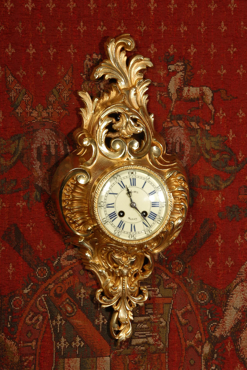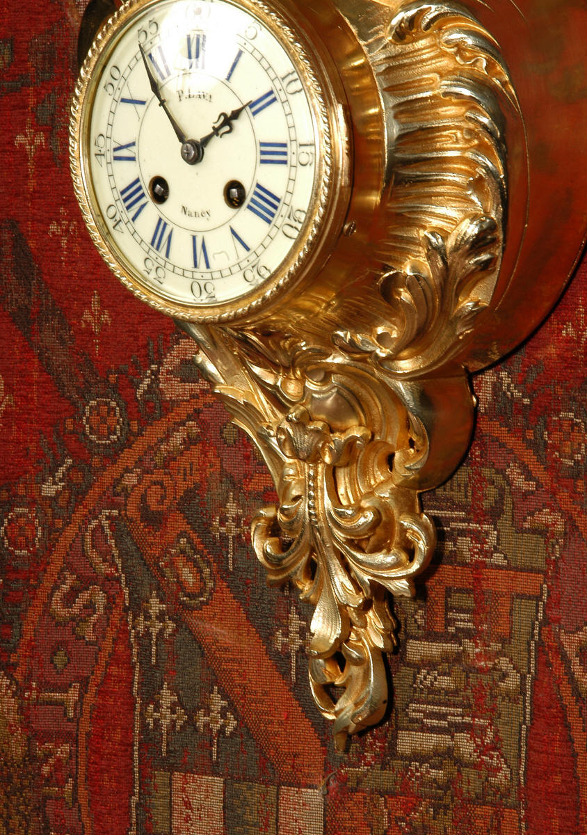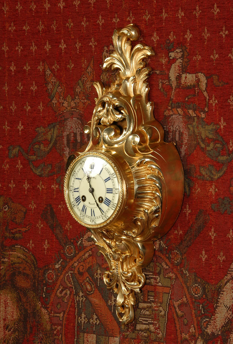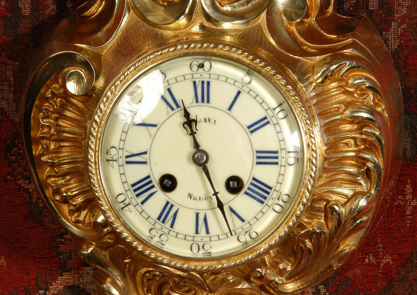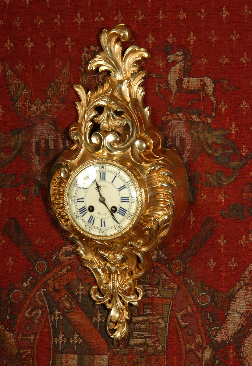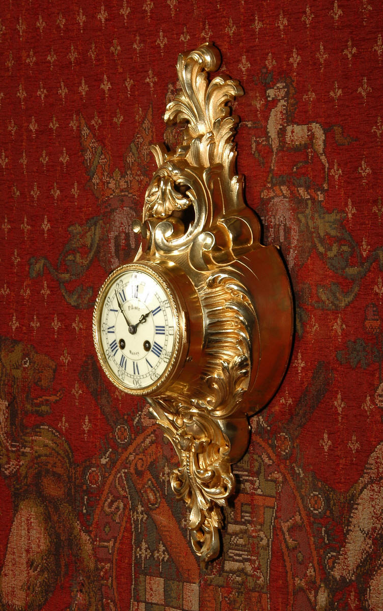 ~ French - Circa 1870 ~ ~~ Excellent condition, fully overhauled ~~ A very decorative antique French gilt brass cartel wall clock. It is Rococo in style, asymmetric with acanthus shoulders and a large acanthus leaf top. Acanthus flowers hang below the dial. It is in stunning condition, finely modelled with good original gilding. The dial is cream with blue lettering and has a separate minute ring and convex glass. The retailers name 'P Lava, Nancy' is on the dial.