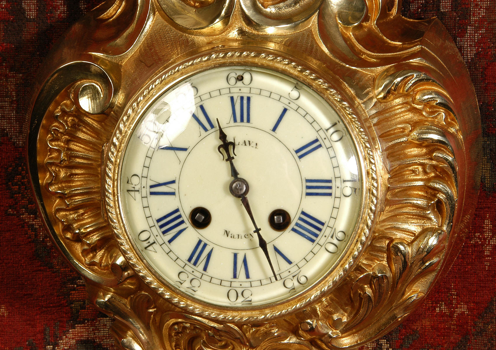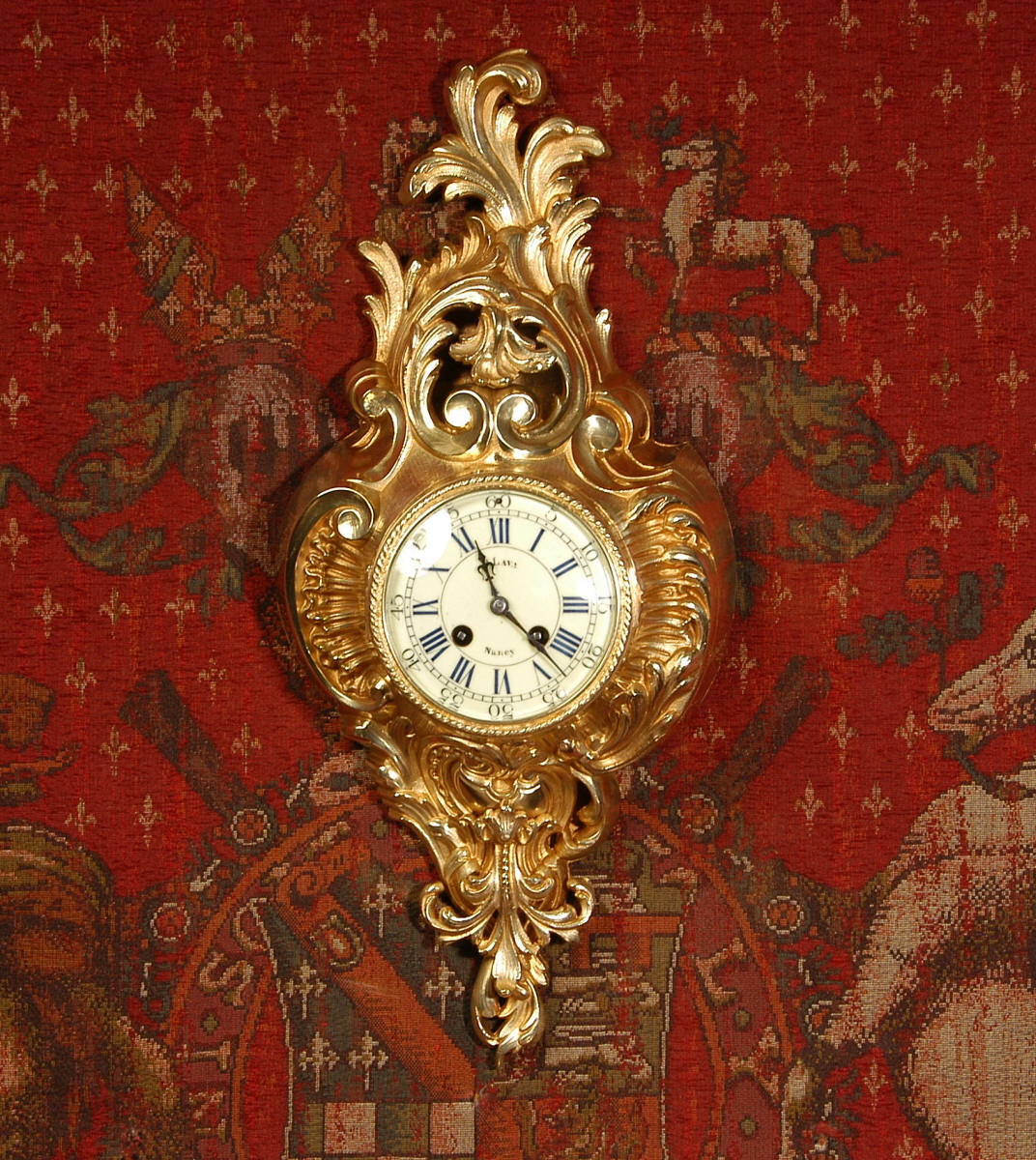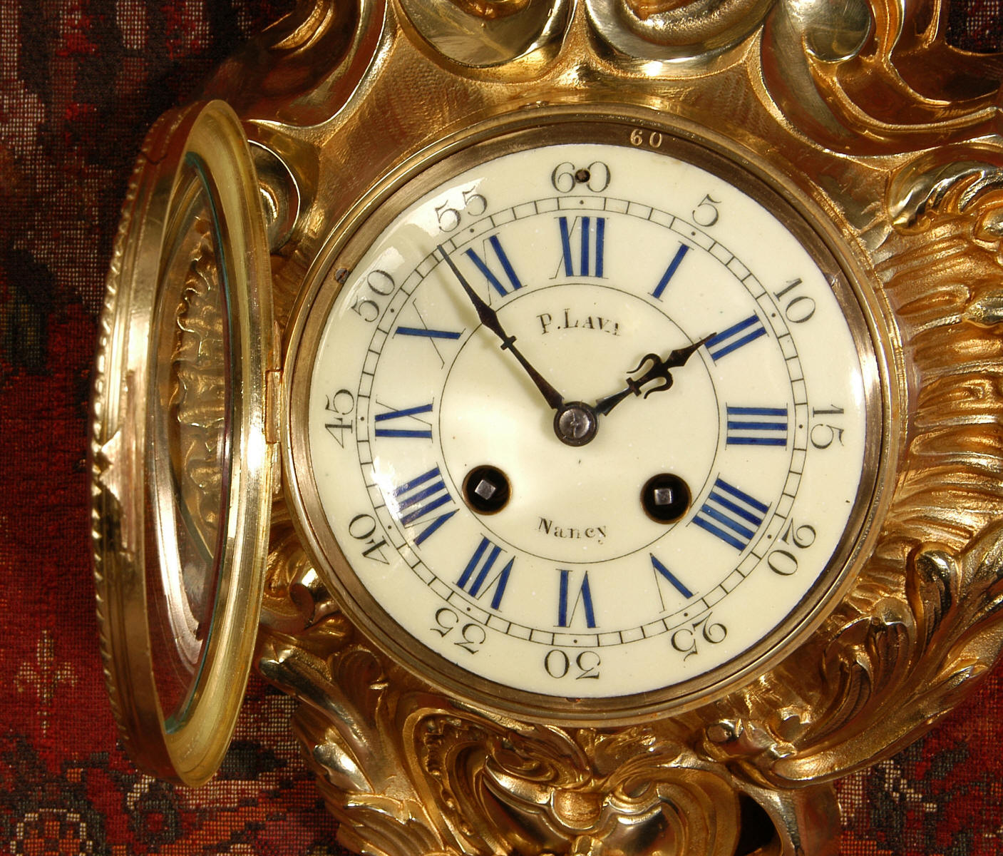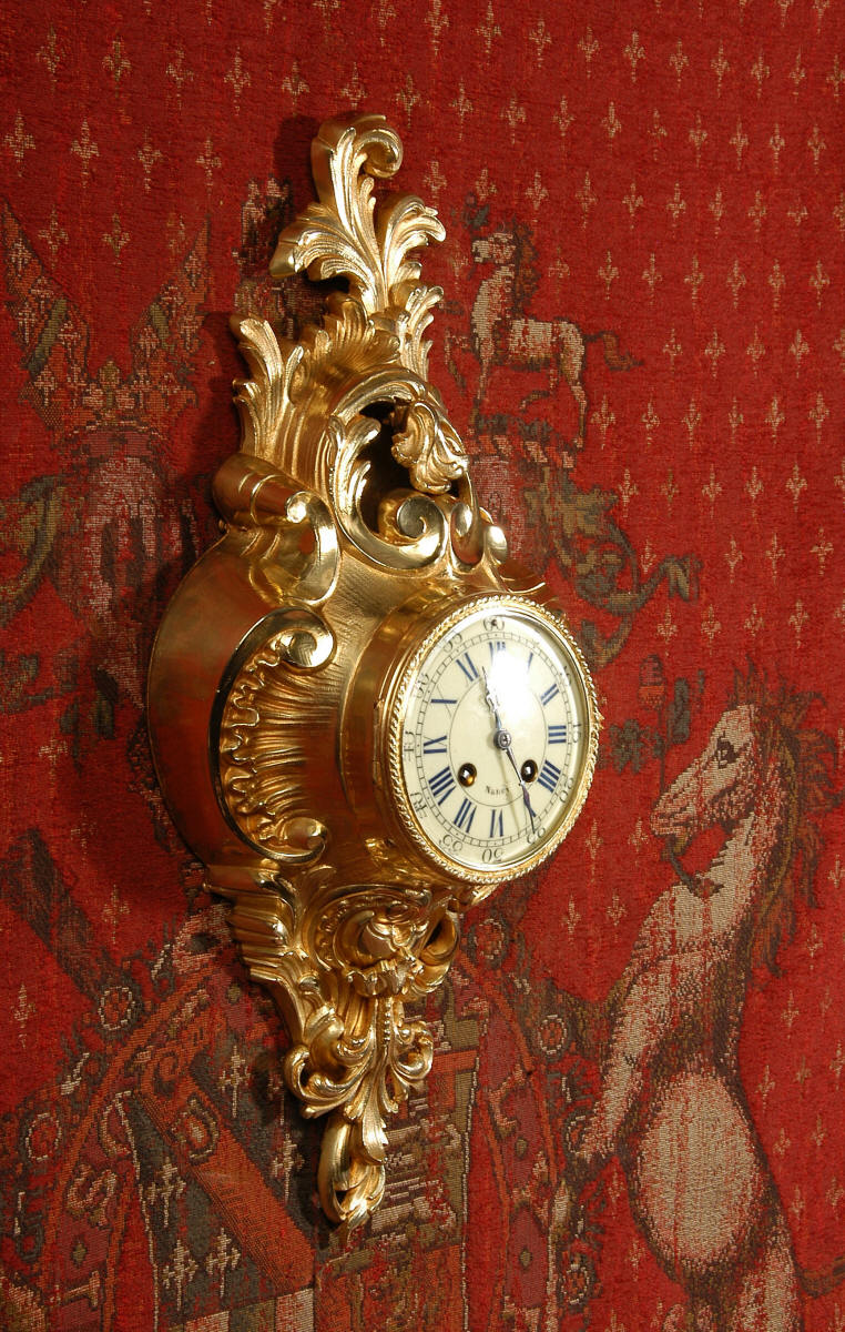 ~ French - Circa 1870 ~ ~~ Excellent condition, fully overhauled ~~ A very decorative antique French gilt brass cartel wall clock. It is Rococo in style, asymmetric with acanthus shoulders and a large acanthus leaf top. Acanthus flowers hang below the dial. It is in stunning condition, finely modelled with good original gilding. The dial is cream with blue lettering and has a separate minute ring and convex glass. The retailers name 'P Lava, Nancy' is on the dial.