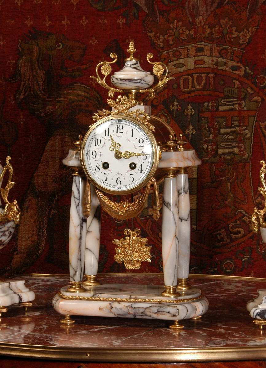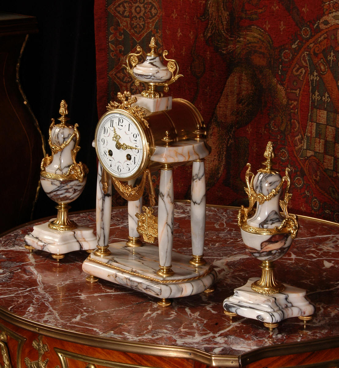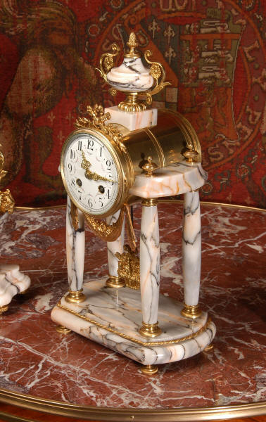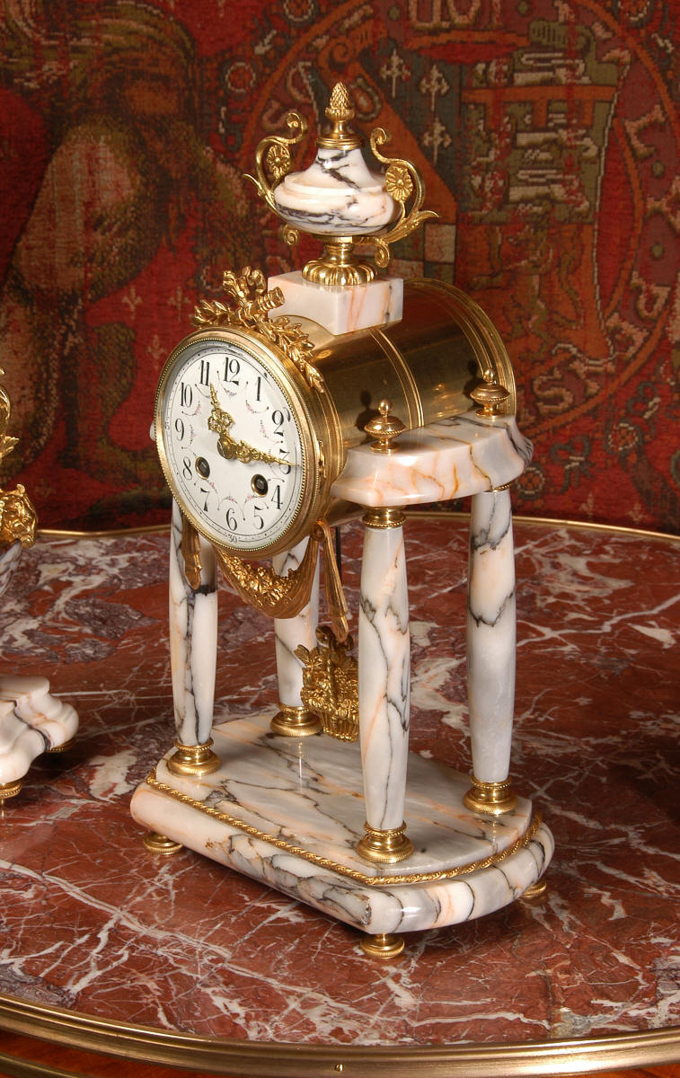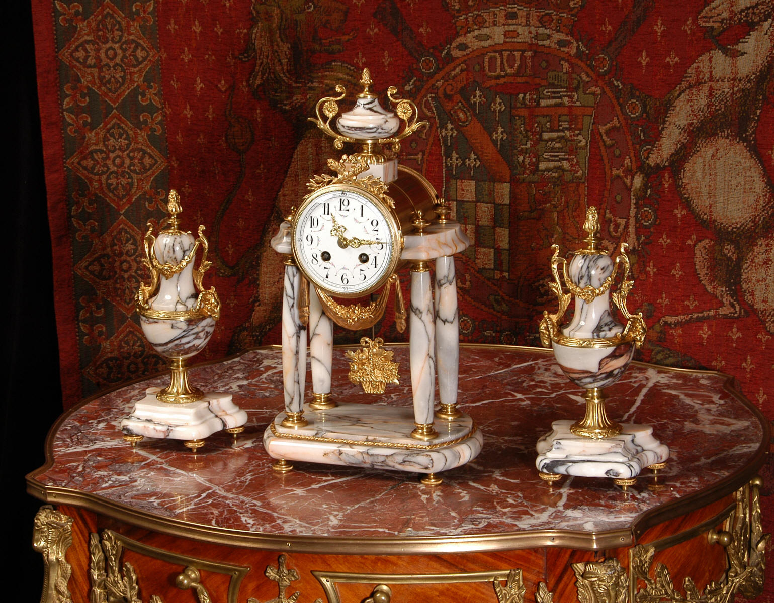 ~ French - Circa 1900 ~ ~~ Excellent condition, fully overhauled ~~ A stunning antique French portico clock set. It is made of the most beautiful variegated specimen marble, with salmon pink and silver veining, mounted with finely finished ormolu (gilded brass/bronze). It is classical in style, the clock is mounted between a four column portico with the pendulum visible swinging below. The original ormolu pendulum depicts a basket abundant with fruit and flowers.