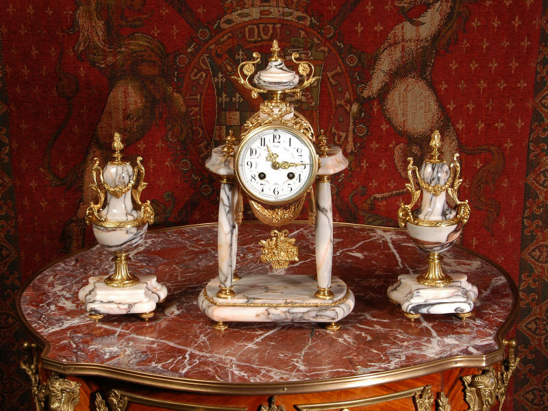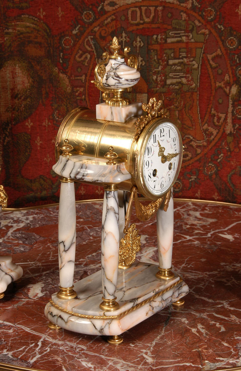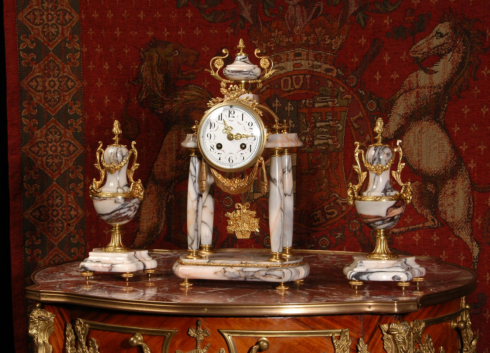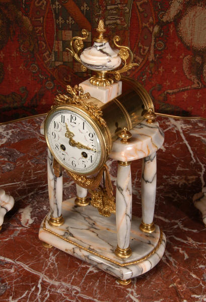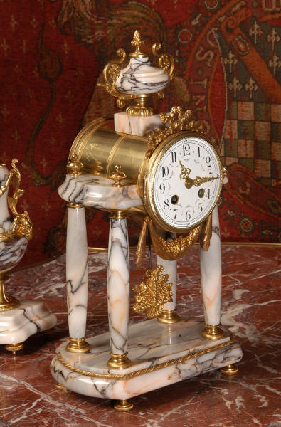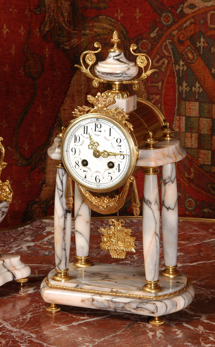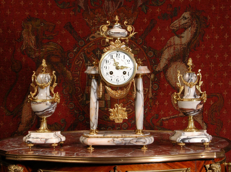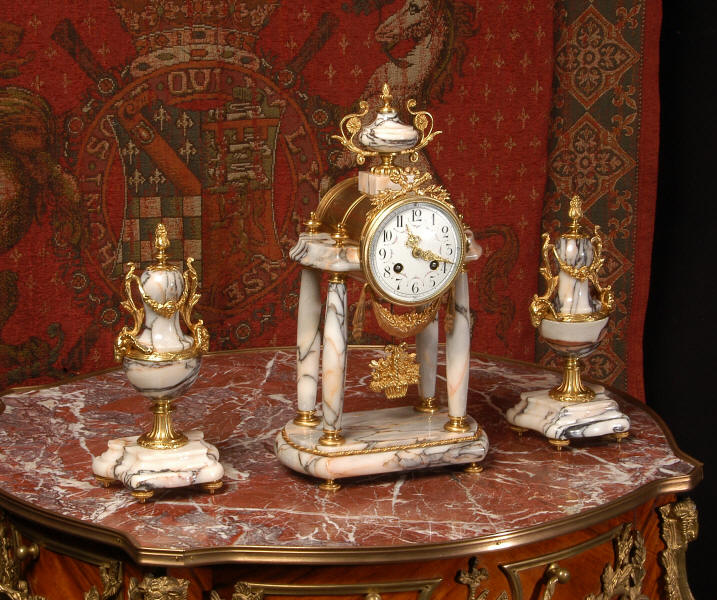 ~ French - Circa 1900 ~ ~~ Excellent condition, fully overhauled ~~ A stunning antique French portico clock set. It is made of the most beautiful variegated specimen marble, with salmon pink and silver veining, mounted with finely finished ormolu (gilded brass/bronze). It is classical in style, the clock is mounted between a four column portico with the pendulum visible swinging below. The original ormolu pendulum depicts a basket abundant with fruit and flowers.