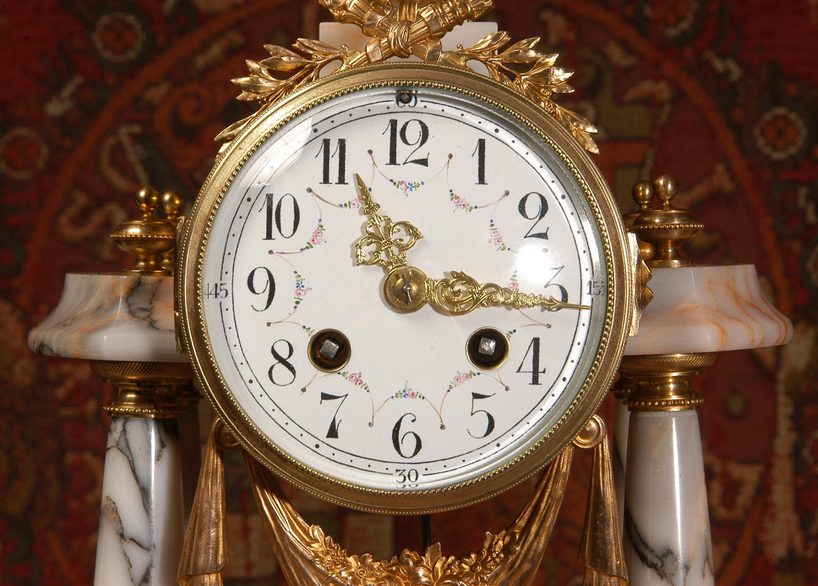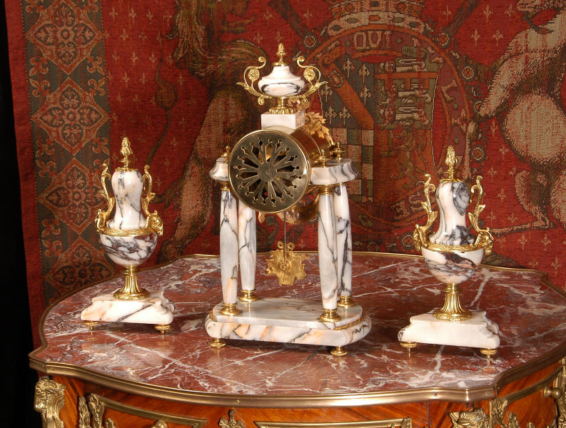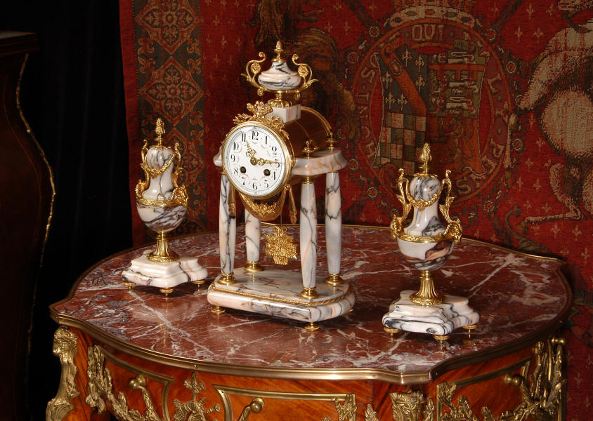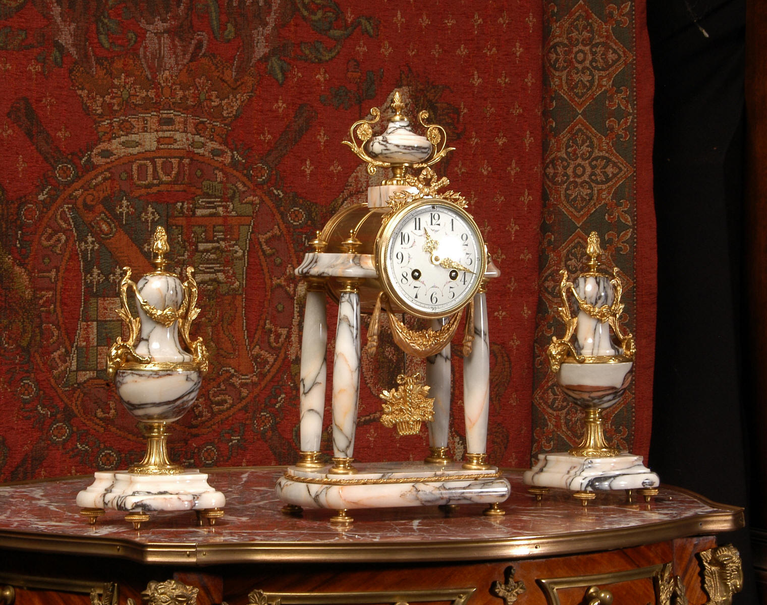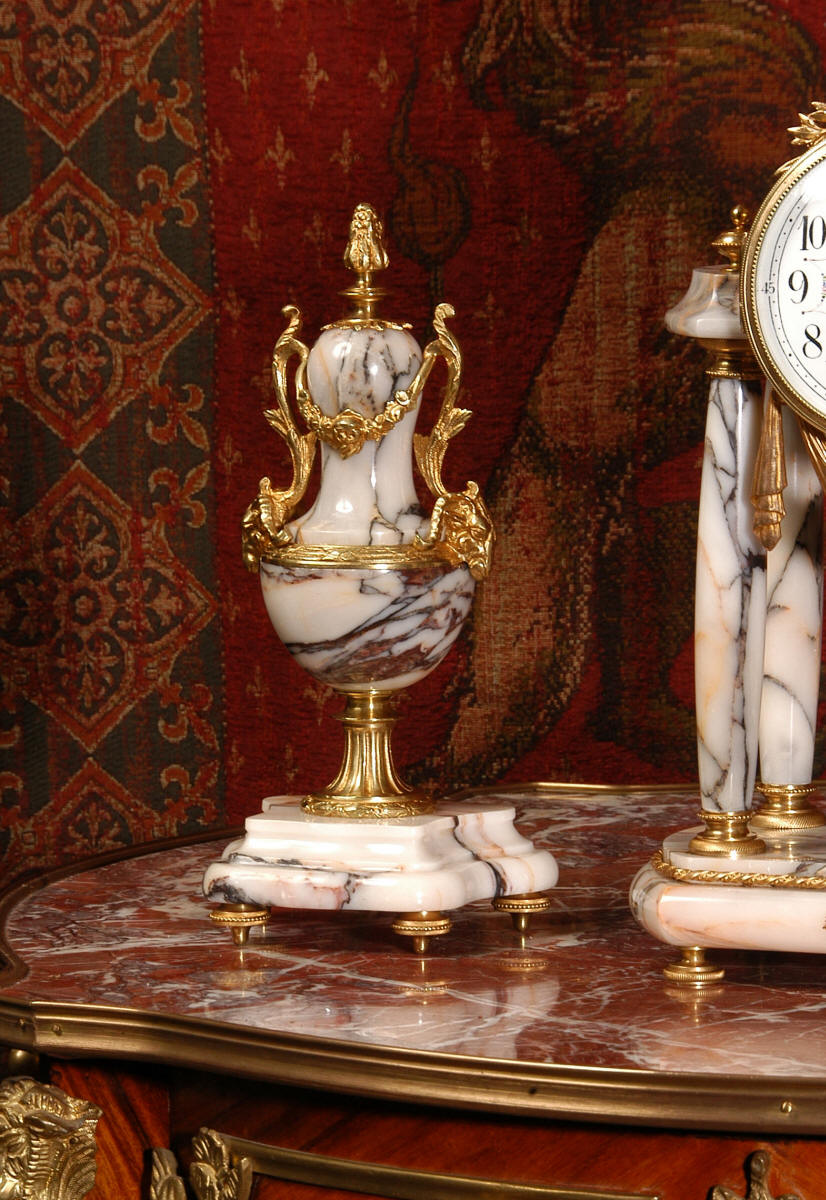~ French - Circa 1900 ~ ~~ Excellent condition, fully overhauled ~~ A stunning antique French portico clock set. It is made of the most beautiful variegated specimen marble, with salmon pink and silver veining, mounted with finely finished ormolu (gilded brass/bronze). It is classical in style, the clock is mounted between a four column portico with the pendulum visible swinging below. The original ormolu pendulum depicts a basket abundant with fruit and flowers.