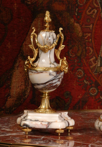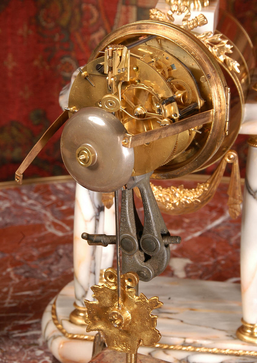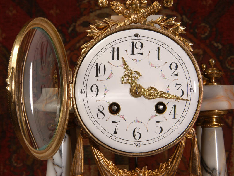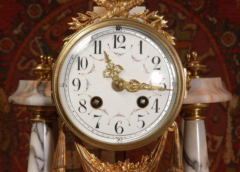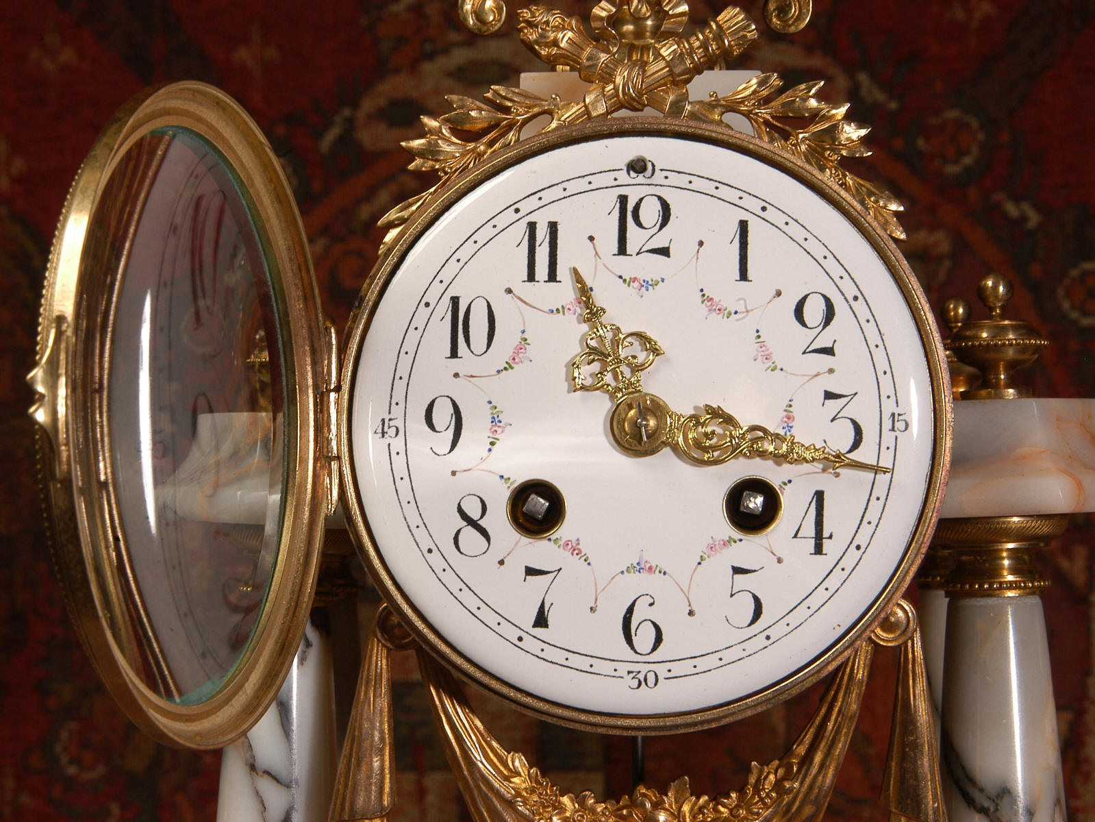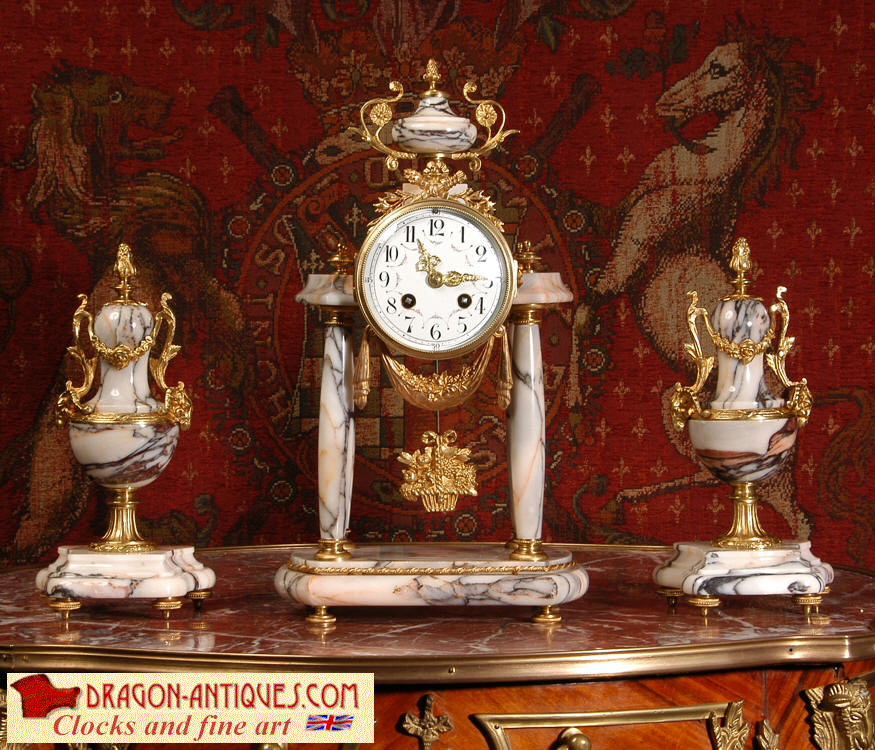 The side vases feature rams head handles and acanthus finials mounted to the same stunning marble as the clock. The dial is enamel on copper, exquisitely decorated with floral swags delicately painted between the numbers of the dial. Hands are gilded, fretted brass. The French movement is by Samuel Marti and has the makers 'gold medal 1900' mark on the back plate. It is of high quality and is in excellent clean and running condition having been fully overhauled by our clockmaker. Pendulum is a original. It runs for 8 days and strikes the hours and halves on a bell. Click the video clip below to hear the bell and watch the clock running! Condition of the case is excellent, marble has a very good polish with no major chips or scratches, just the usual tiny nibbles to the edges and a very small scuff to the corner of the base of one urn. Ormolu is also in very good condition with a bright and clean finish, just some slight wear in places, particularly on the swag below the dial. Dial is in very good condition with no chips or scratches.