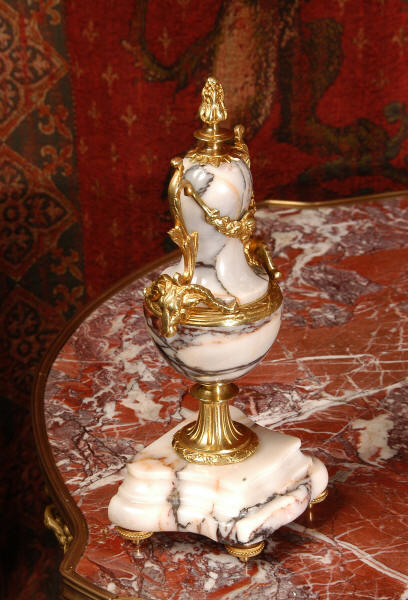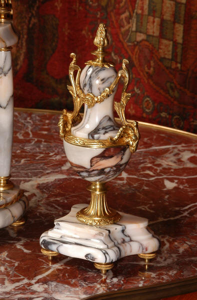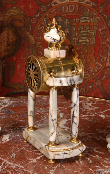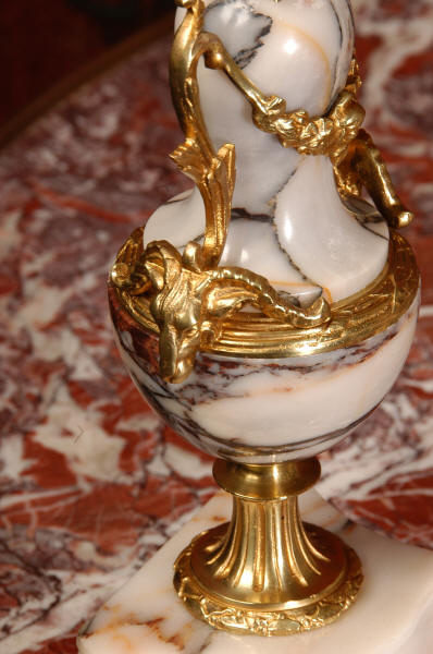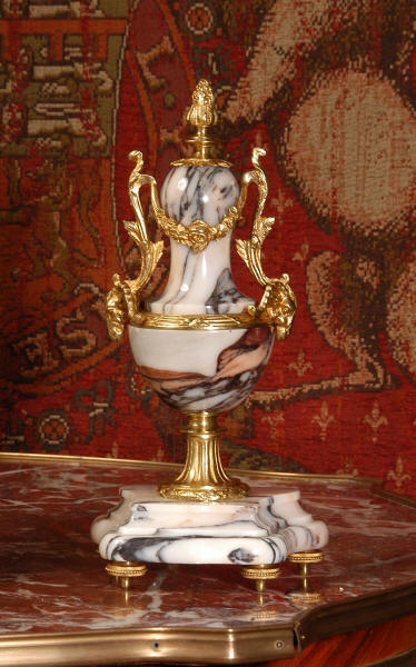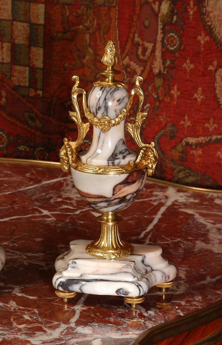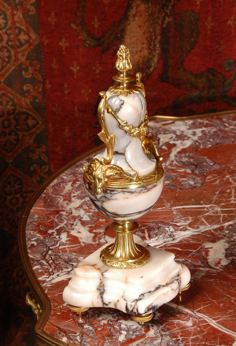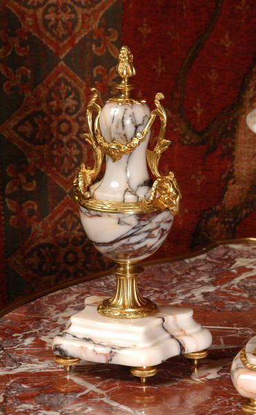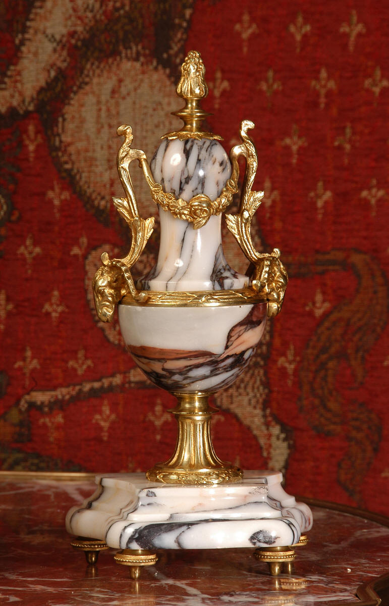 The side vases feature rams head handles and acanthus finials mounted to the same stunning marble as the clock. The dial is enamel on copper, exquisitely decorated with floral swags delicately painted between the numbers of the dial. Hands are gilded, fretted brass. The French movement is by Samuel Marti and has the makers 'gold medal 1900' mark on the back plate. It is of high quality and is in excellent clean and running condition having been fully overhauled by our clockmaker. Pendulum is a original. It runs for 8 days and strikes the hours and halves on a bell. Click the video clip below to hear the bell and watch the clock running! Condition of the case is excellent, marble has a very good polish with no major chips or scratches, just the usual tiny nibbles to the edges and a very small scuff to the corner of the base of one urn. Ormolu is also in very good condition with a bright and clean finish, just some slight wear in places, particularly on the swag below the dial. Dial is in very good condition with no chips or scratches.