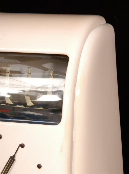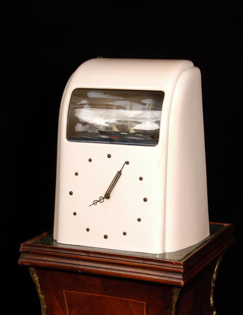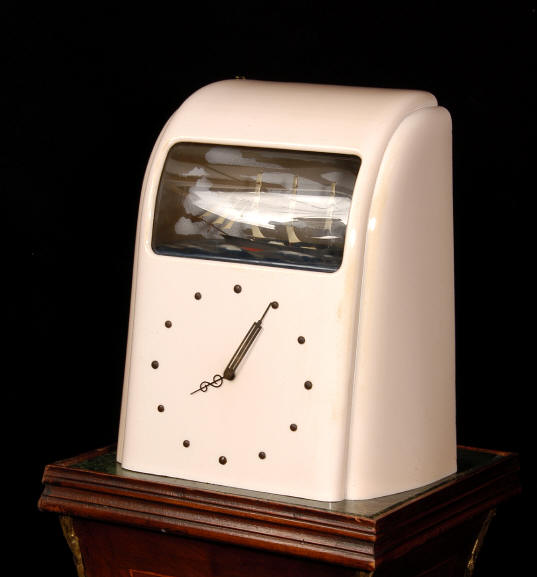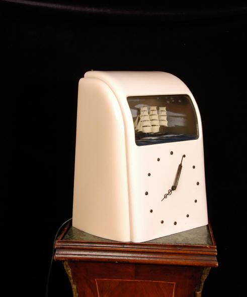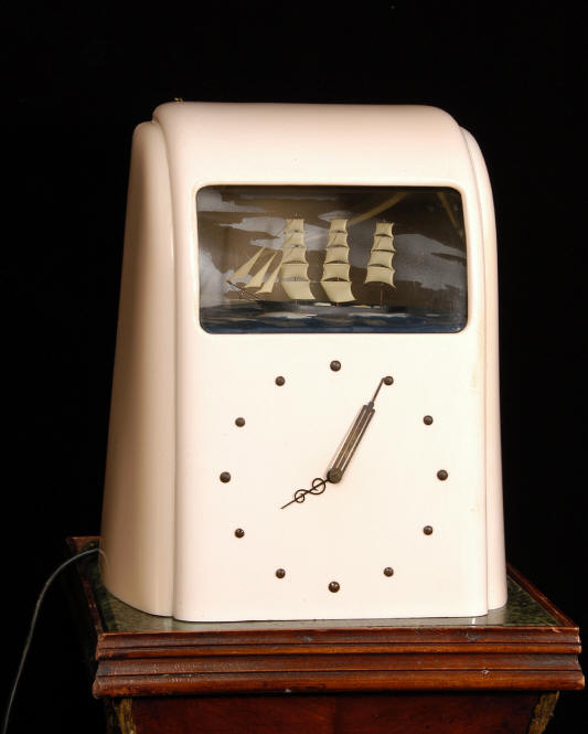 ~ British - Circa 1940 ~ ~~ Excellent condition ~~ A unusual white Bakelite Vitascope clock, mains powered, with an automata rocking ship in the window above the dial. The sky lights up and dims and brightens as if with the rising/setting sun, the ship pitches gently up and down in the waves.... very soothing! See movie below. The first design of this clock was patented in