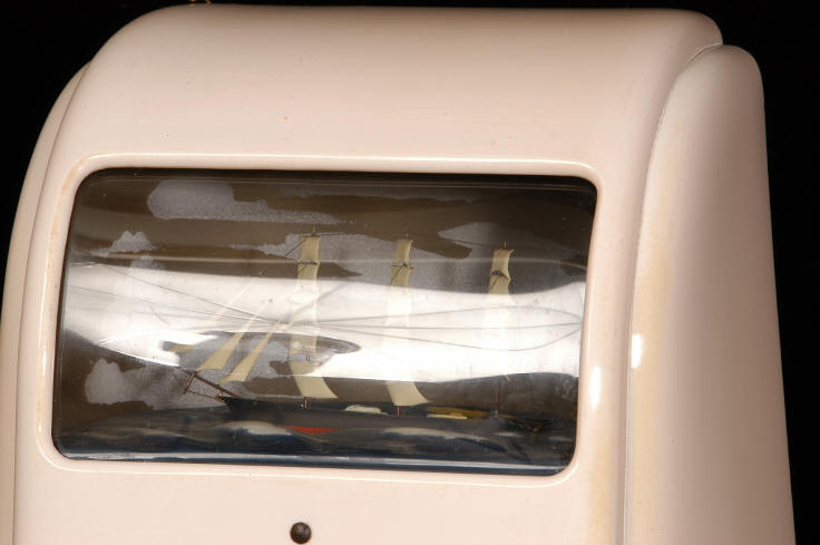 1941 by a Mr. J S Thatcher later amendments by Mr. J F Condition of the case is very good, no cracks or breaks, there is some discolouration as always with early plastic, see the pictures below. The ship and window have been cleaned and are in good, complete condition. The mechanism works well and has been re-wired with the metal parts correctly earthed.