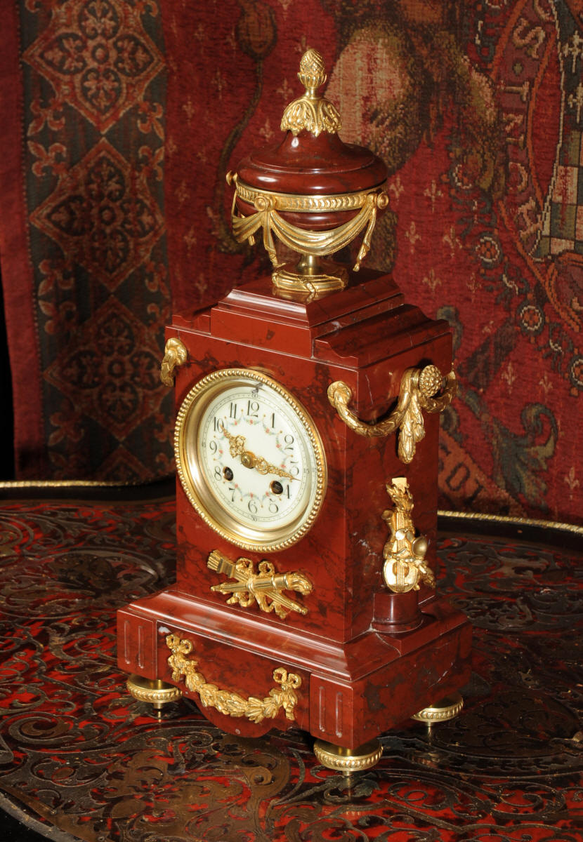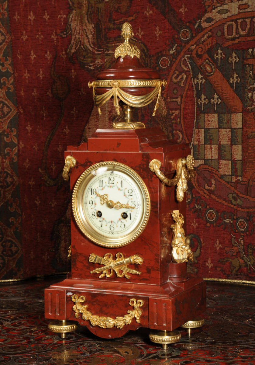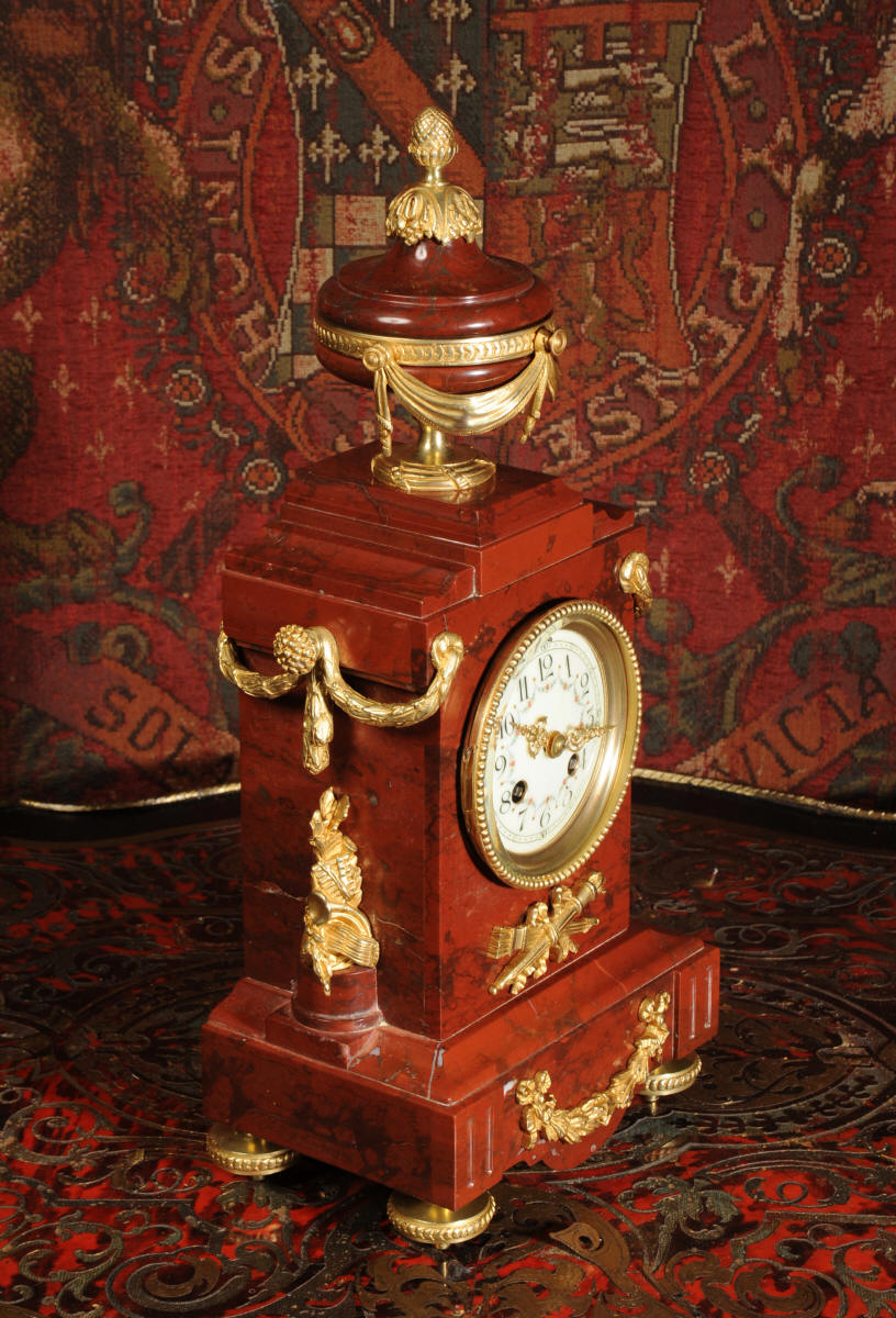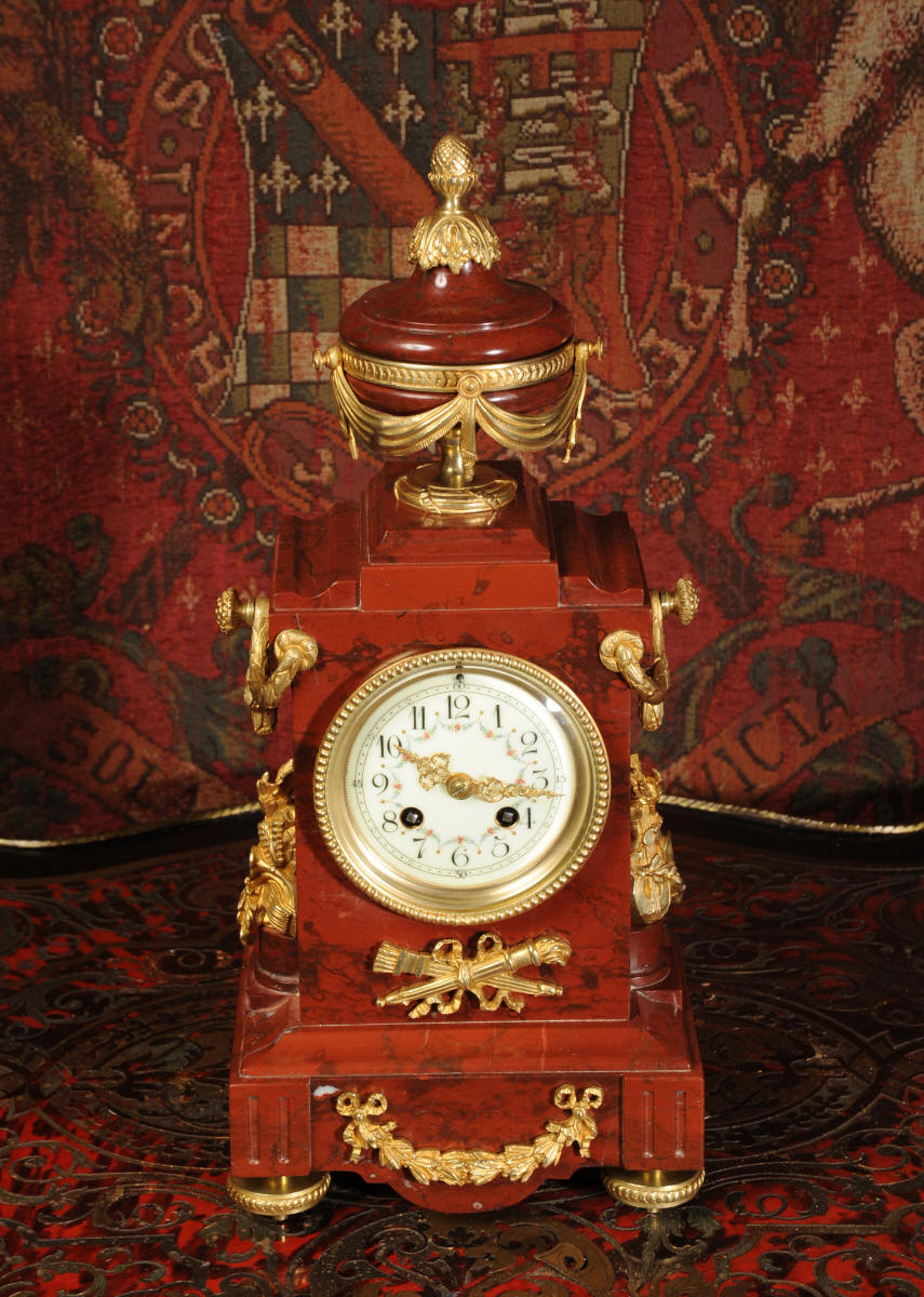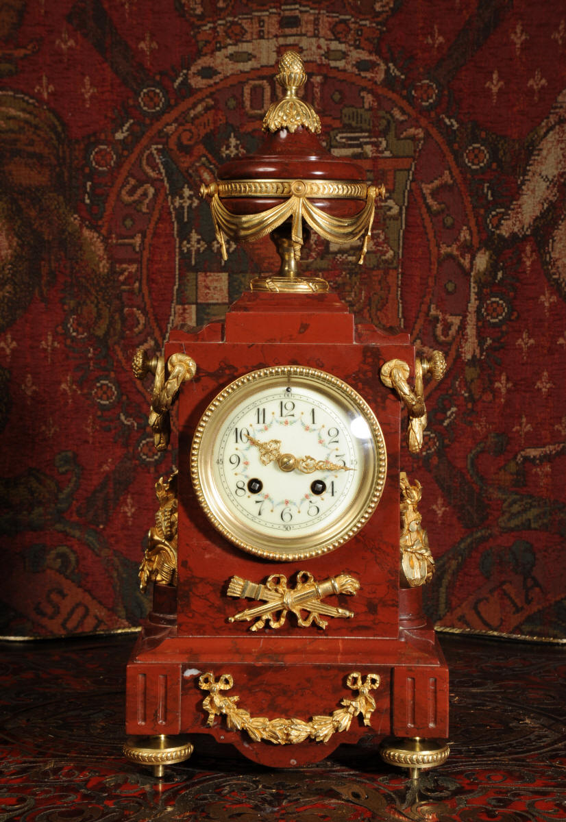 ~ French - Circa 1880 ~ ~~ Excellent condition, fully overhauled ~~ A superb original antique French table clock, made of the most stunning variegated specimen marble, a lovely deep red with dark maroon veining. It is classical in style, mounted with finely modelled and finished ormolu (finely gilded brass). To the front is a torché and quiver of arrows with a floral swag below, musical trophies to the sides and an urn with pineapple final and drapes to the top.
