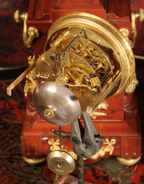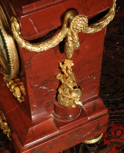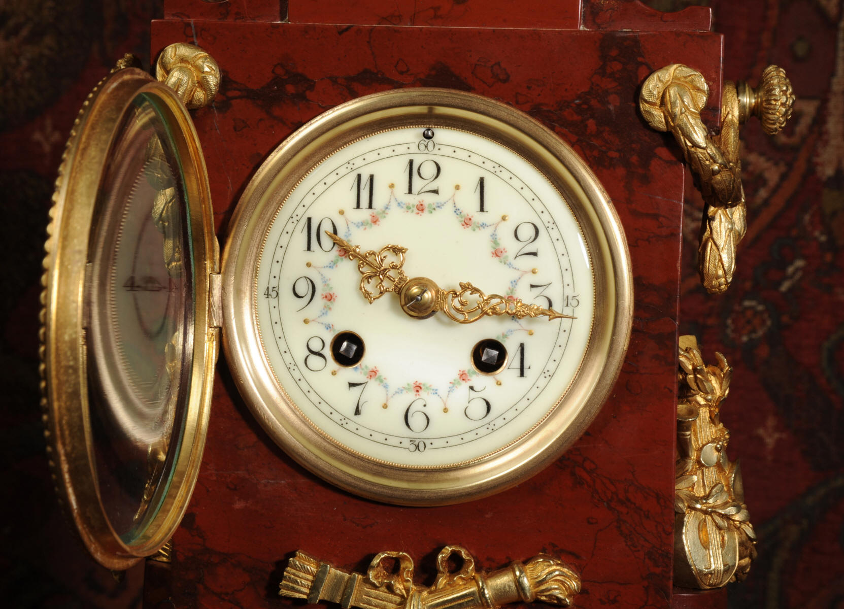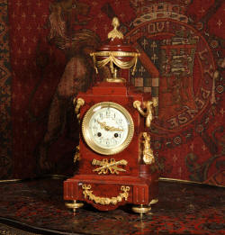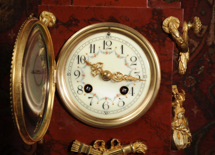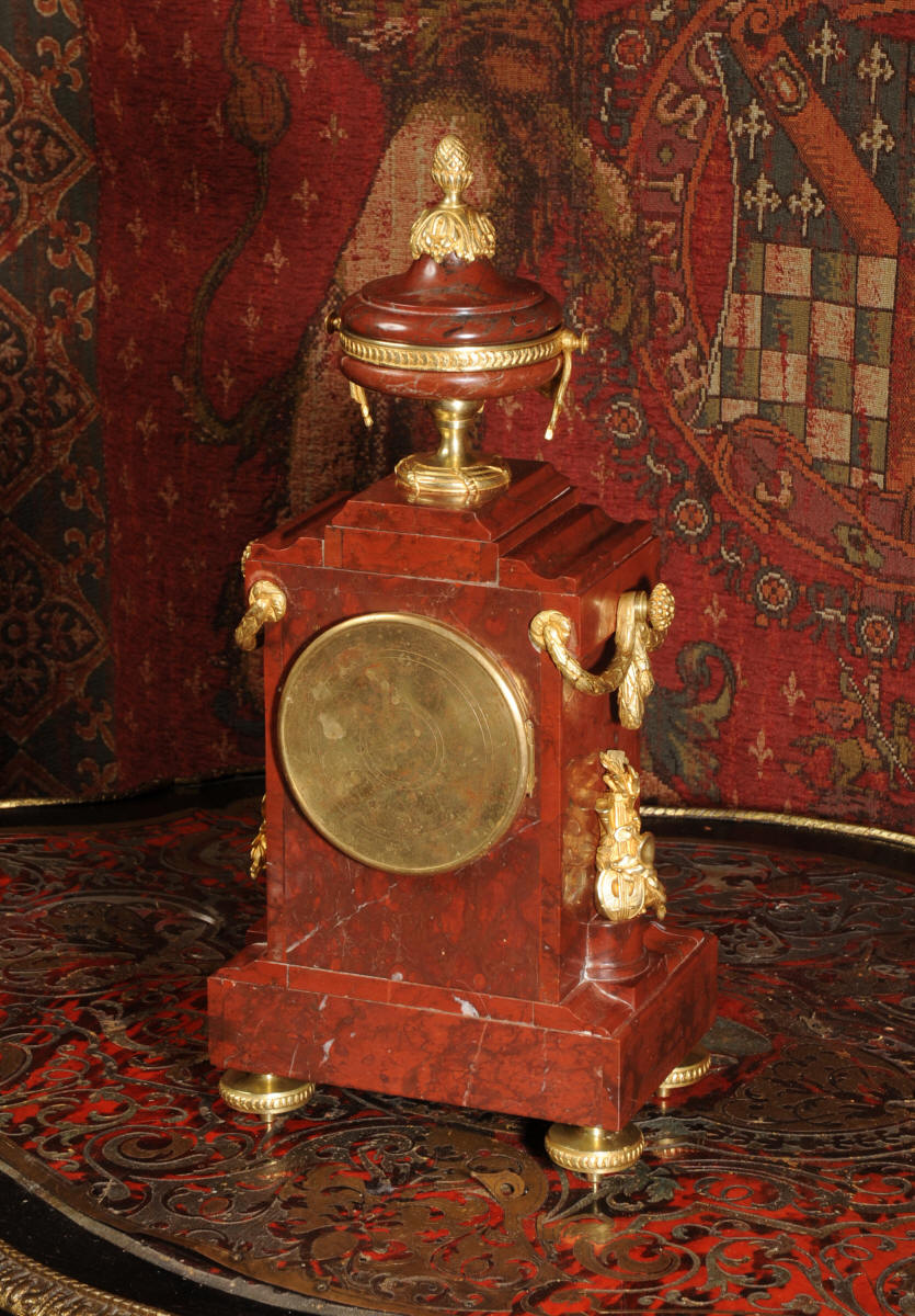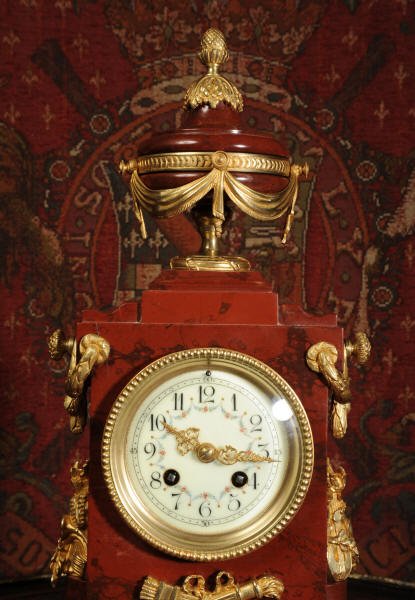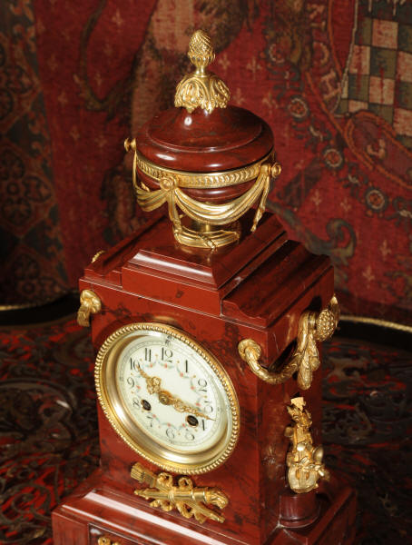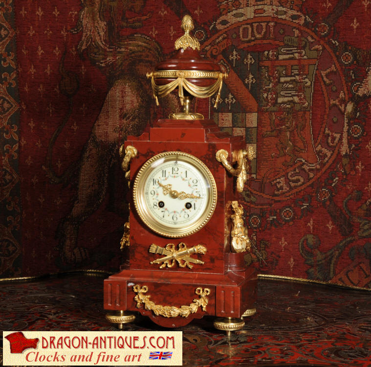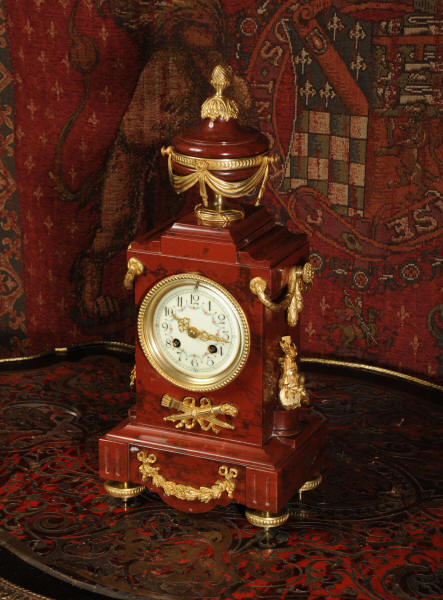 ~ French - Circa 1880 ~ ~~ Excellent condition, fully overhauled ~~ A superb original antique French table clock, made of the most stunning variegated specimen marble, a lovely deep red with dark maroon veining. It is classical in style, mounted with finely modelled and finished ormolu (finely gilded brass). To the front is a torché and quiver of arrows with a floral swag below, musical trophies to the sides and an urn with pineapple final and drapes to the top.