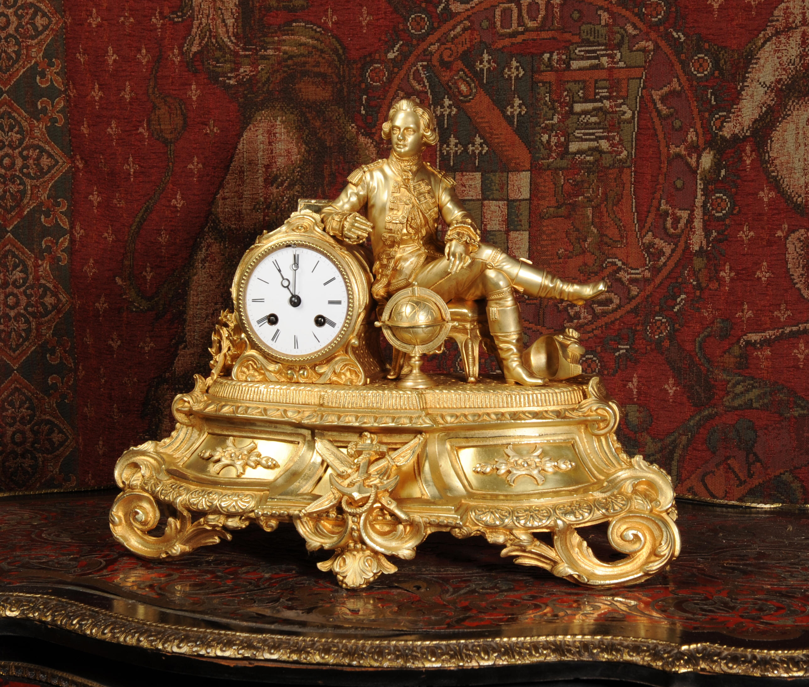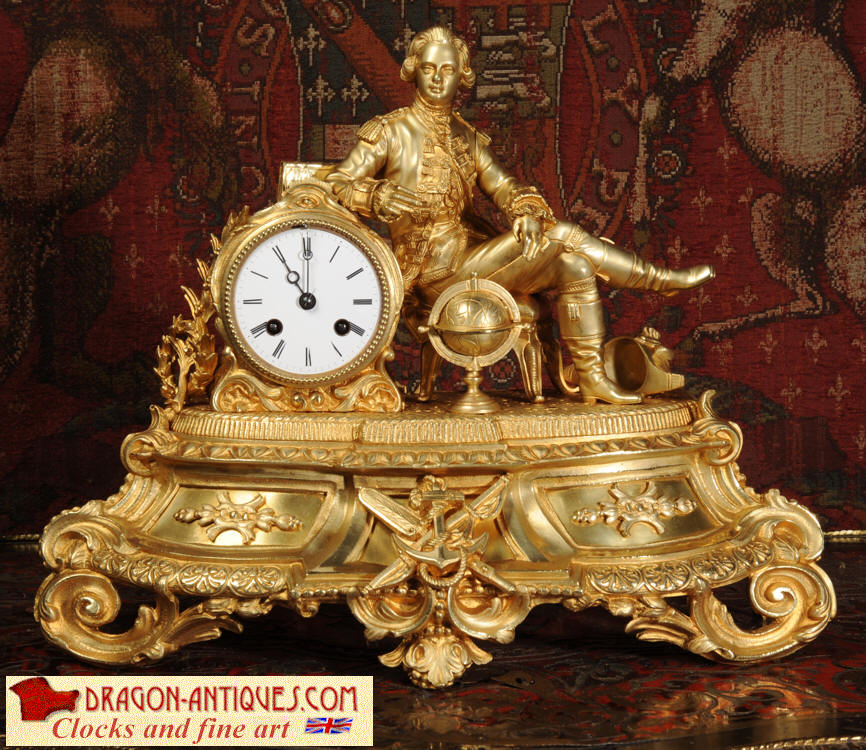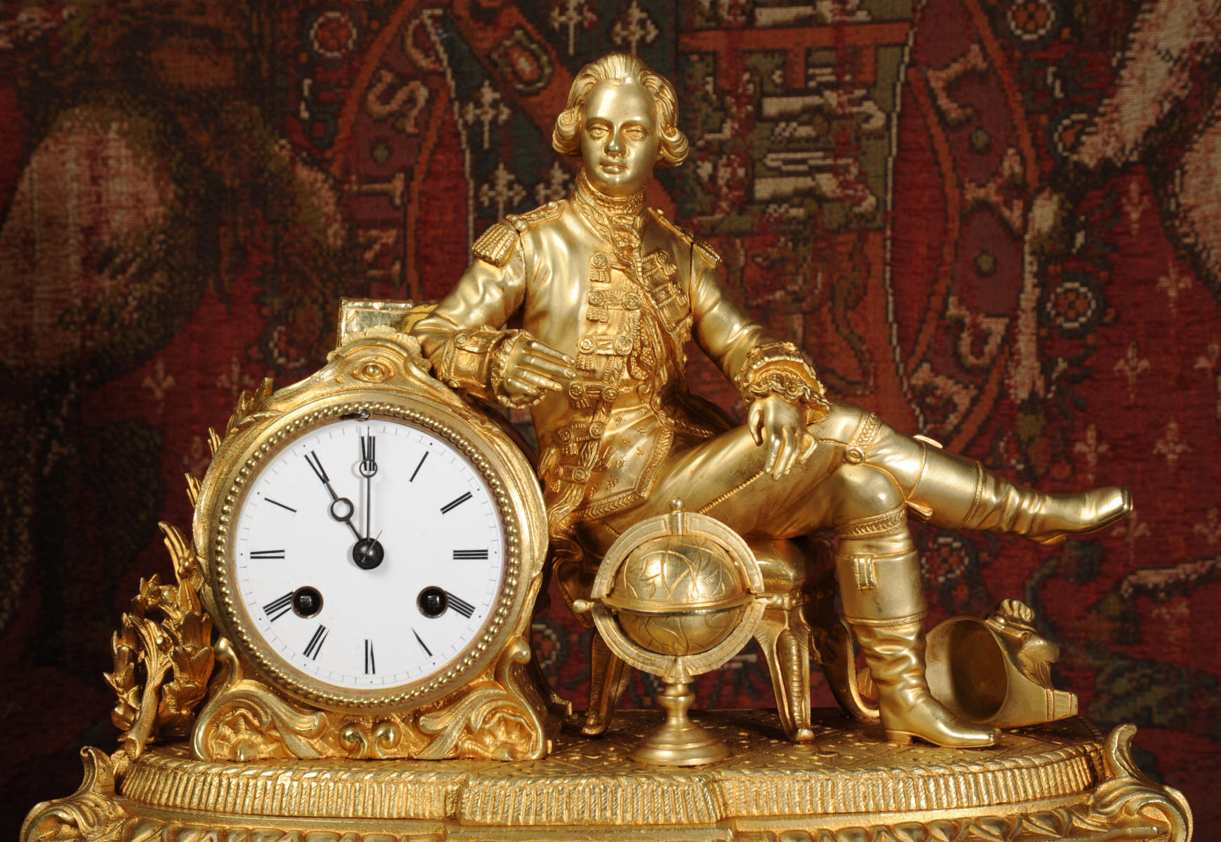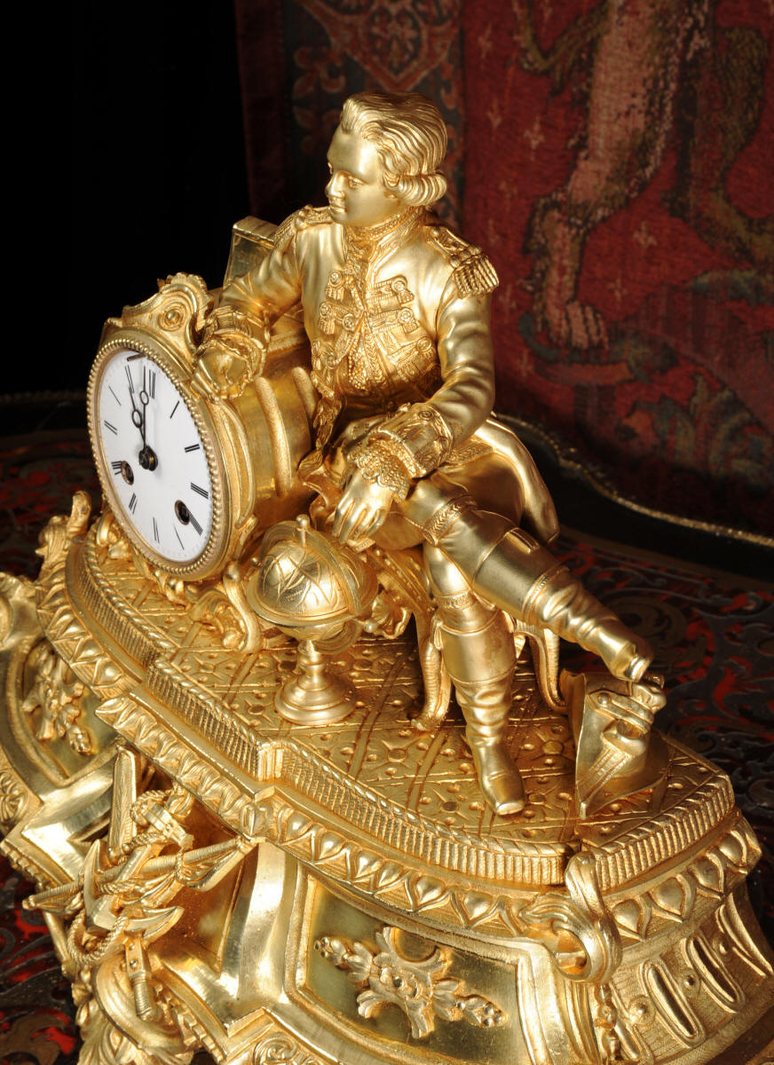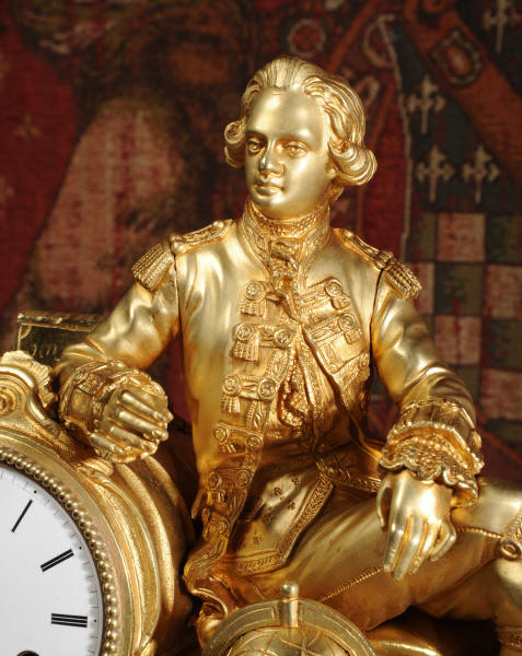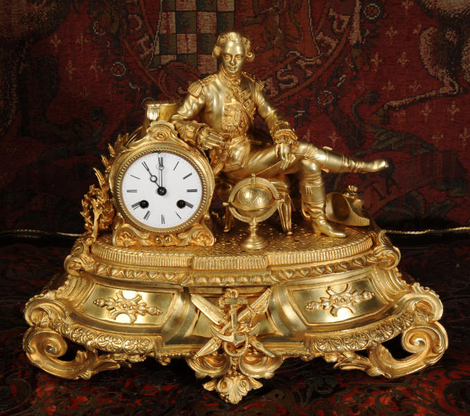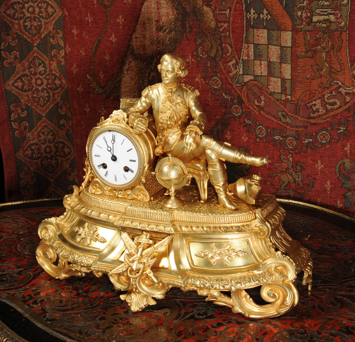 ~ French - Circa 1860 ~ ~~ Excellent condition, fully overhauled ~~ A fine and early original antique French ormolu (gilded bronze) clock depicting the celebrated French explorer Captain Jean-Francois Galaup Lapérouse (1741-1788). It is based loosely on the painting by Nicolas-André Monsiau, currently in the Chateau de Versailles (see below). Lapérouse was appointed in 1785 by Louis XVI to lead an expedition around the world, this ultimately ended in tragedy with his ships wrecked on Vanikoro, part of the islands of Santa Cruz. The Captain is seated next to the clock with a globe in front of him, his log of discoveries is to his right elbow.