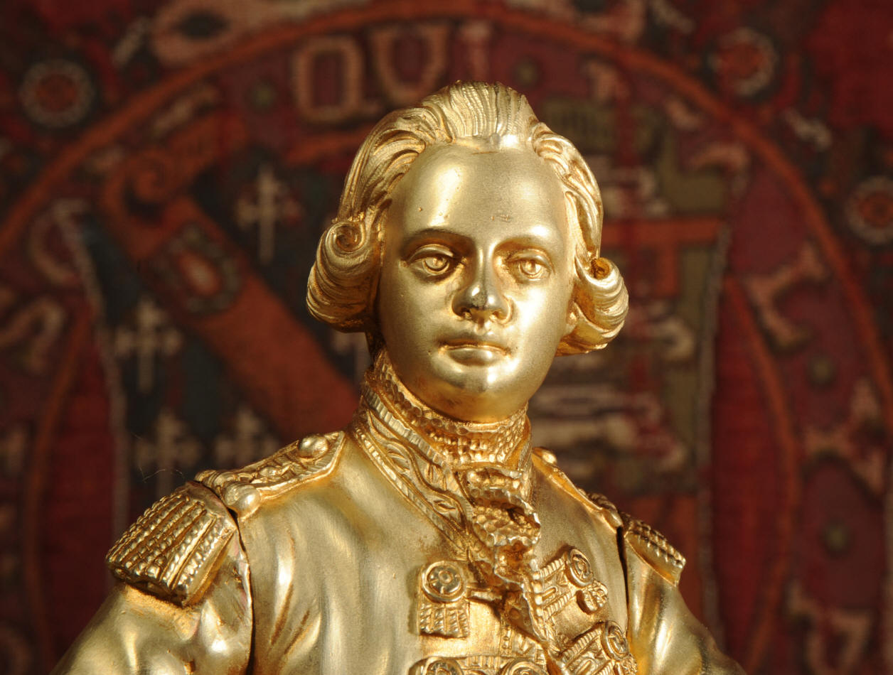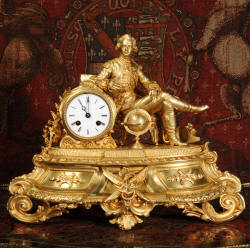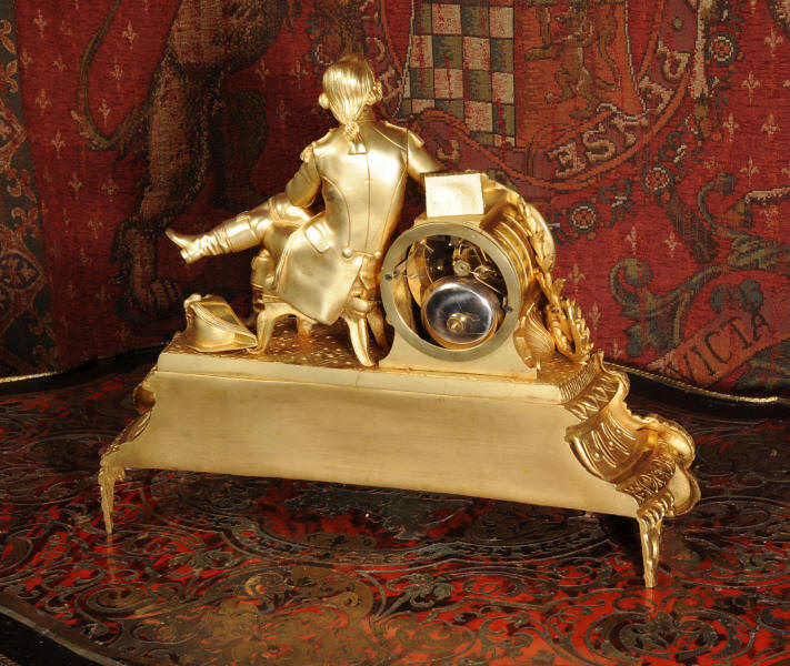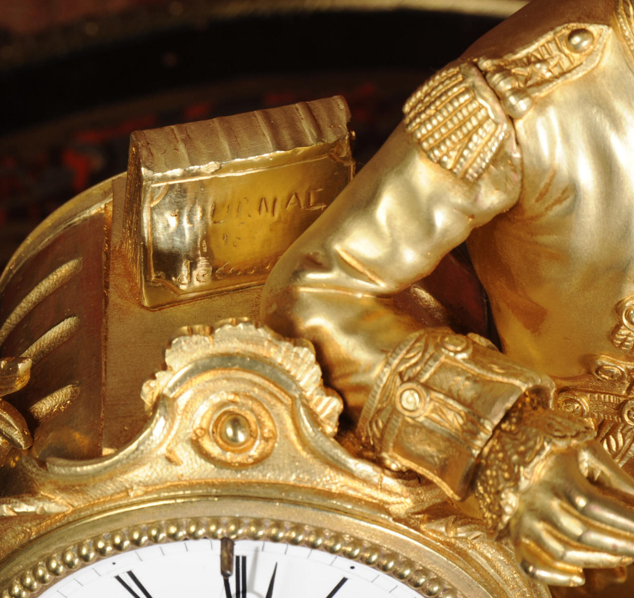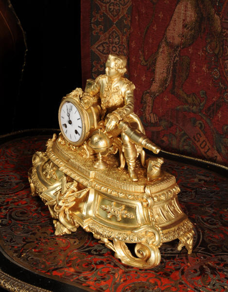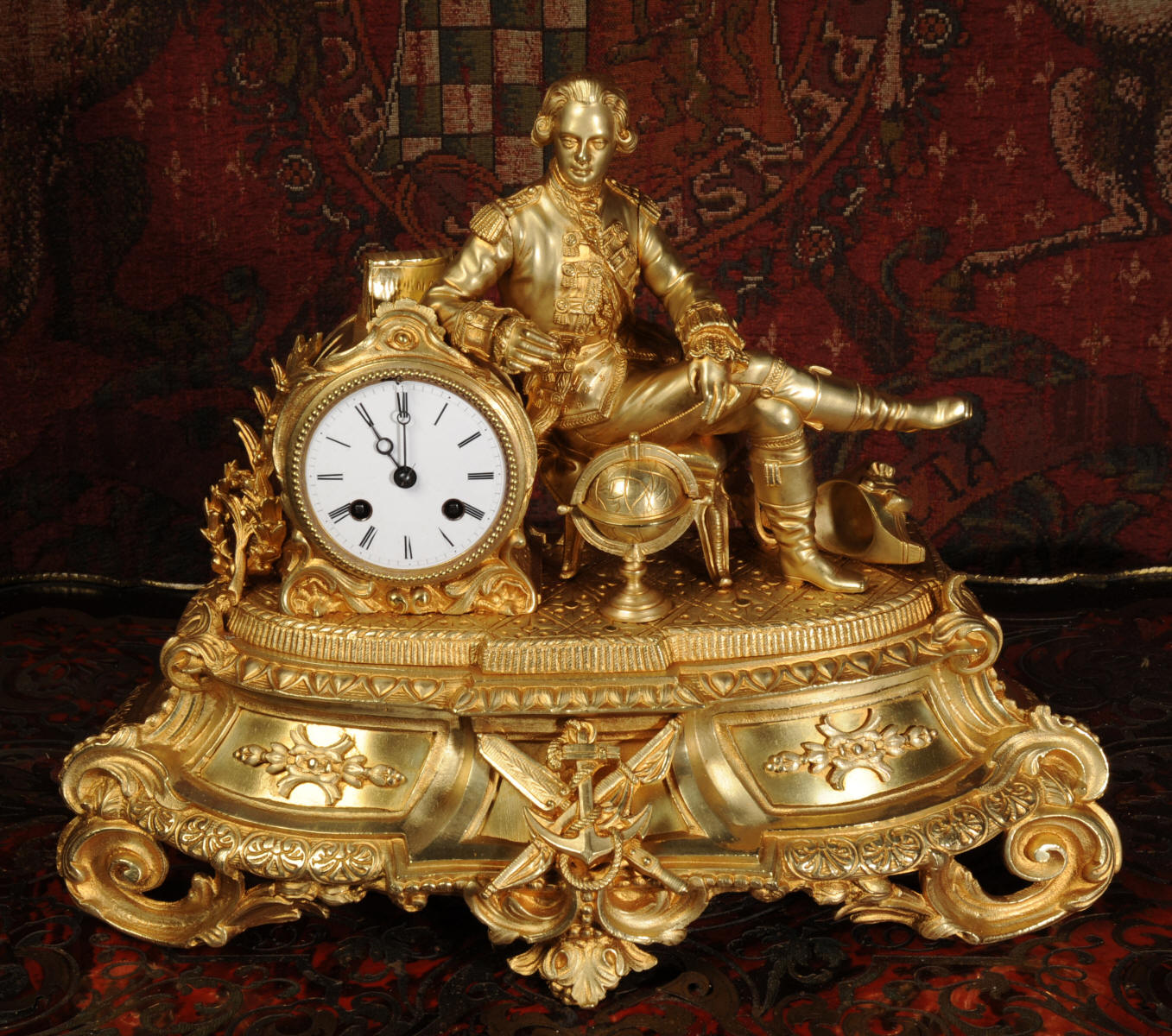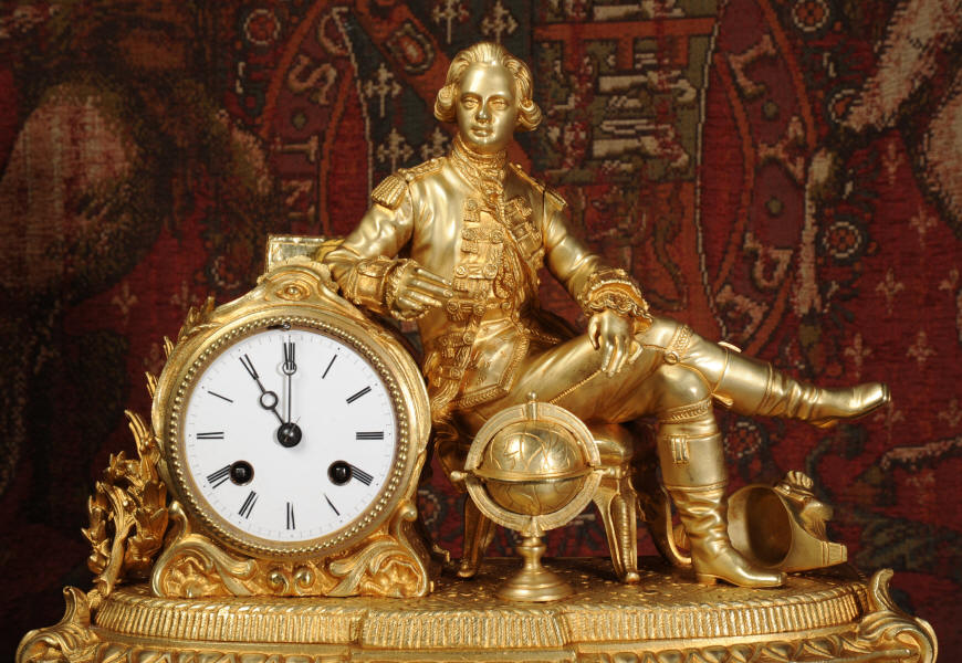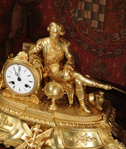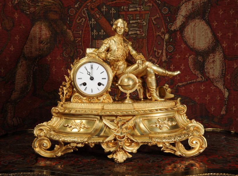 ~ French - Circa 1860 ~ ~~ Excellent condition, fully overhauled ~~ A fine and early original antique French ormolu (gilded bronze) clock depicting the celebrated French explorer Captain Jean-Francois Galaup Lapérouse (1741-1788). It is based loosely on the painting by Nicolas-André Monsiau, currently in the Chateau de Versailles (see below). Lapérouse was appointed in 1785 by Louis XVI to lead an expedition around the world, this ultimately ended in tragedy with his ships wrecked on Vanikoro, part of the islands of Santa Cruz. The Captain is seated next to the clock with a globe in front of him, his log of discoveries is to his right elbow.