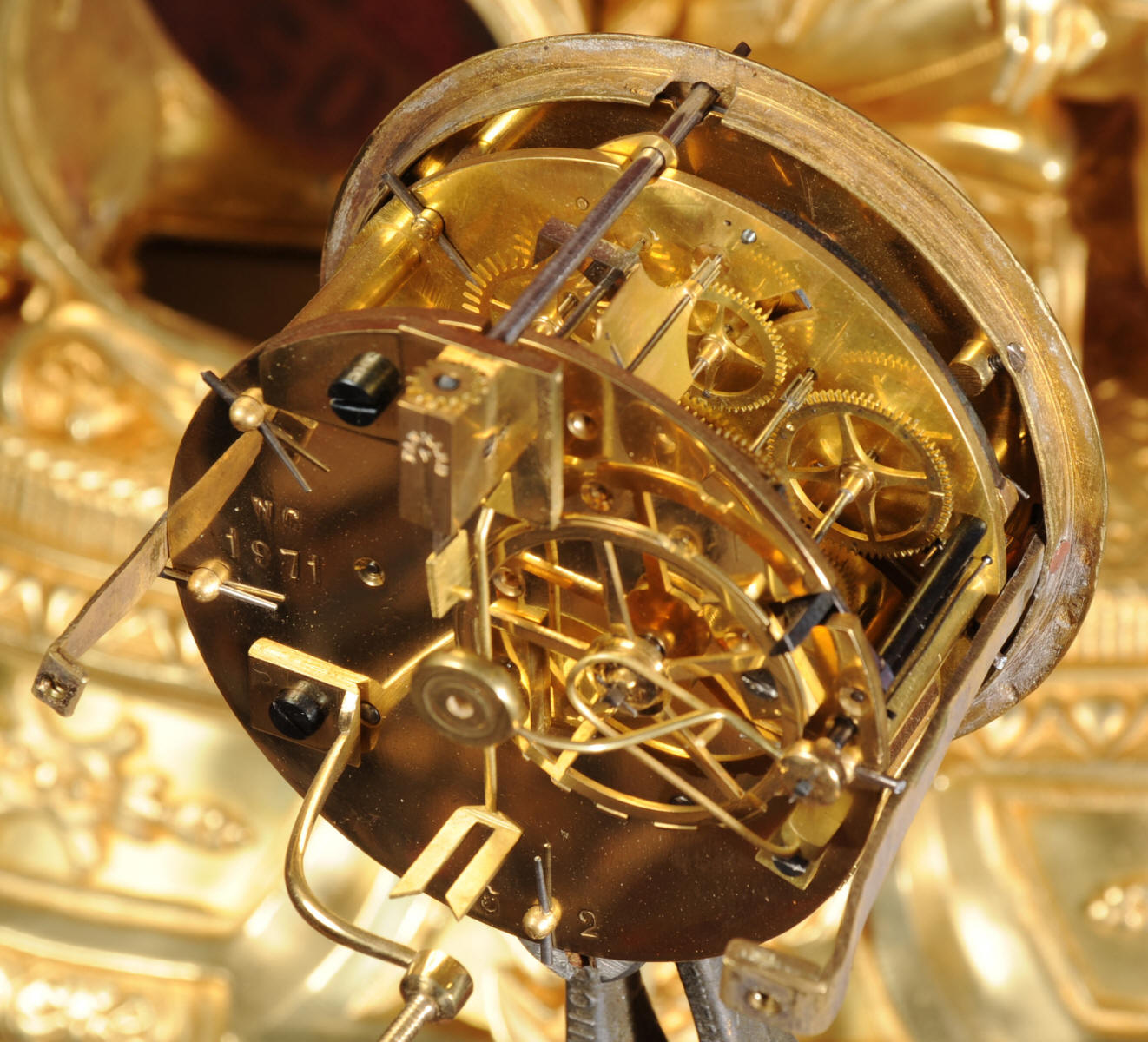 The dial is enamel on copper with original blued steel breguet hands and floral bezel. This type of clock does not have a glazed bezel or a rear door. The French movement is of high quality. It is the earlier version of Pendule De Paris movement with outside hammer return spring. It is in excellent clean and running condition having been fully overhauled by our clockmaker. Pendulum is a replacement. It runs for 8 days and strikes the hours and halves on a bell. Click the video clip below to hear the bell and watch the clock running! Condition of the case is stunning, the original gilding is beautifully clean and bright with hardly any wear or discolouration and there are no losses. We have gently removed years of grime to reveal the original gilding beneath. The dial is also in excellent condition with no damage.