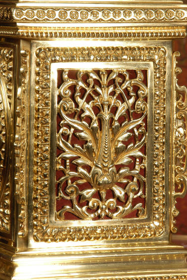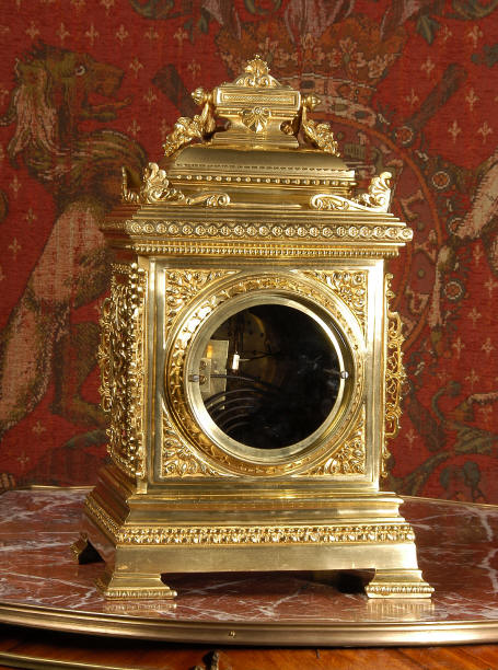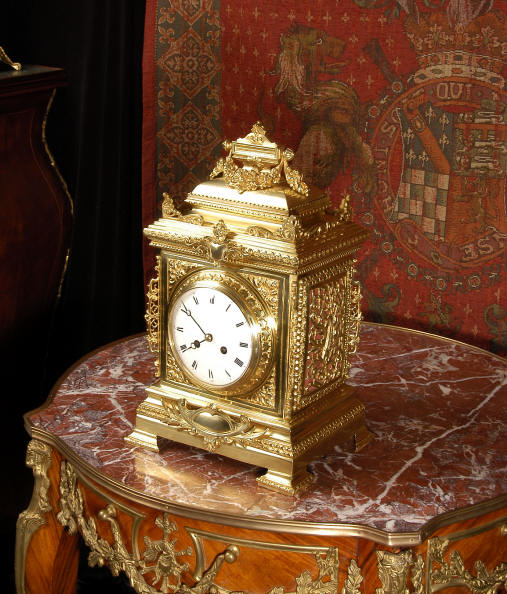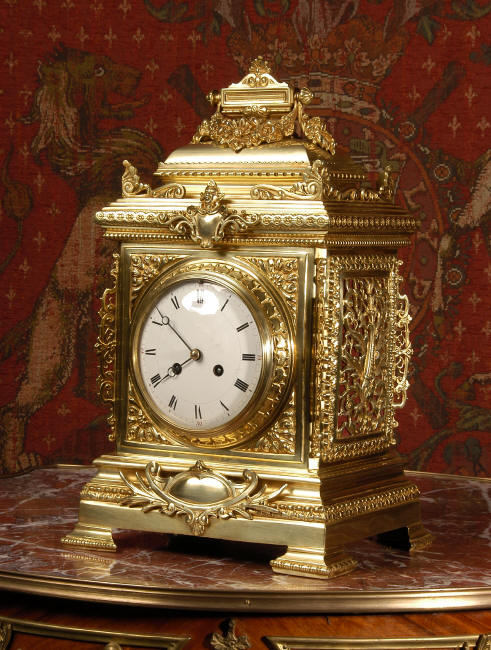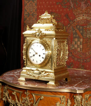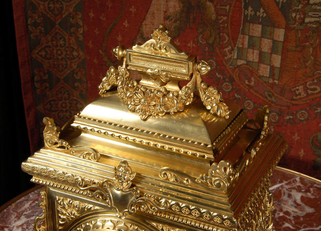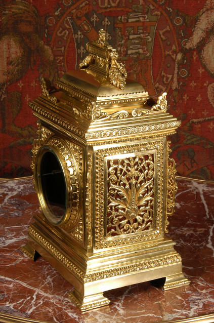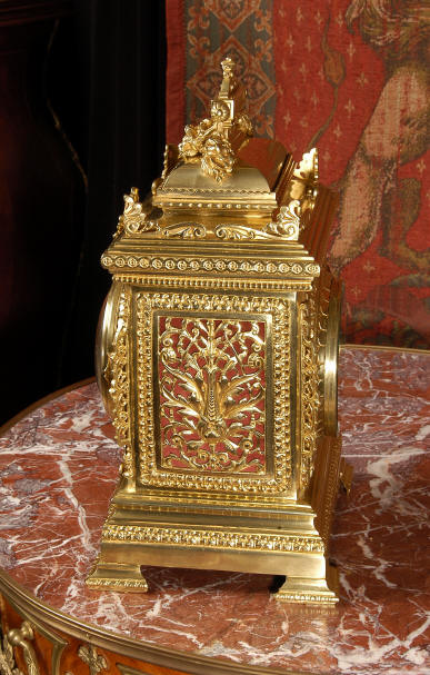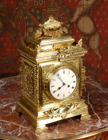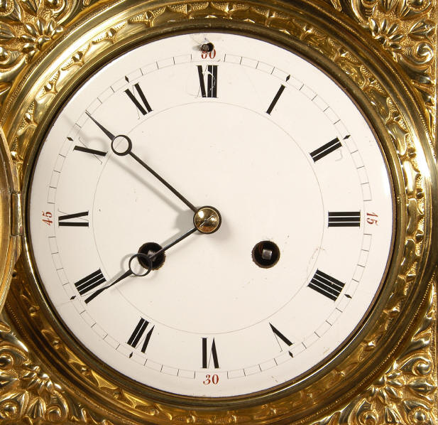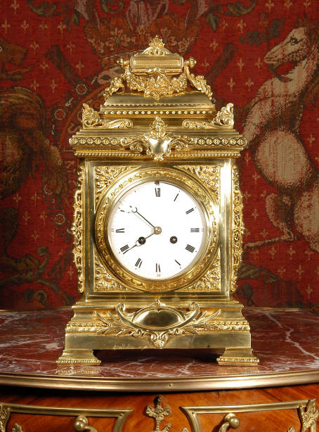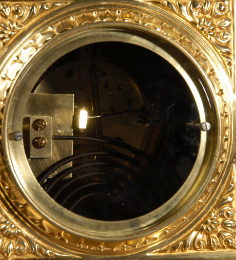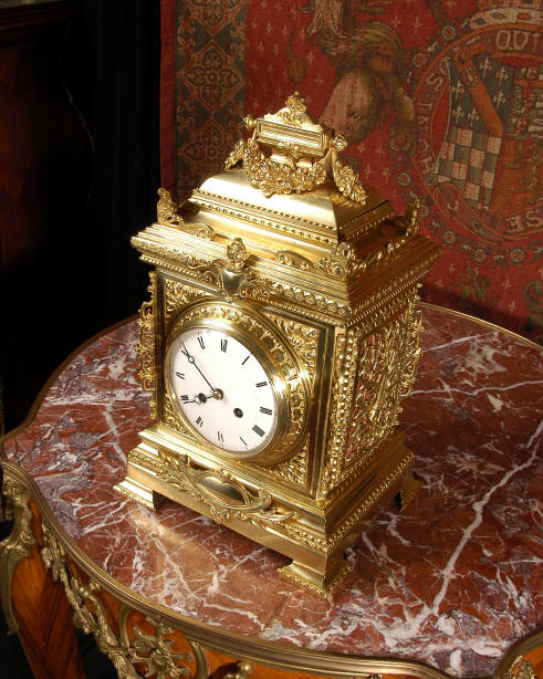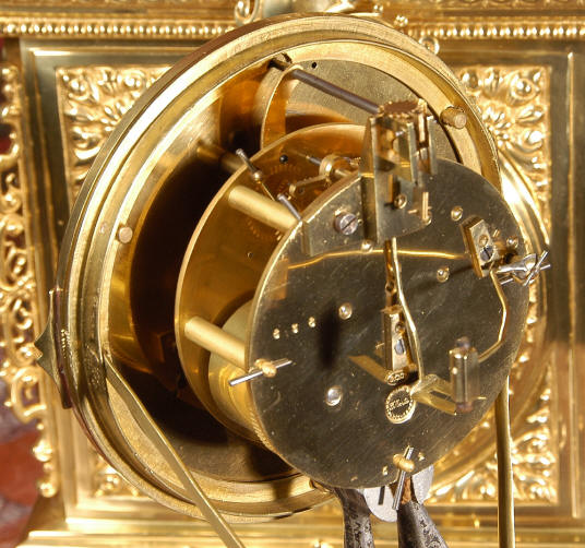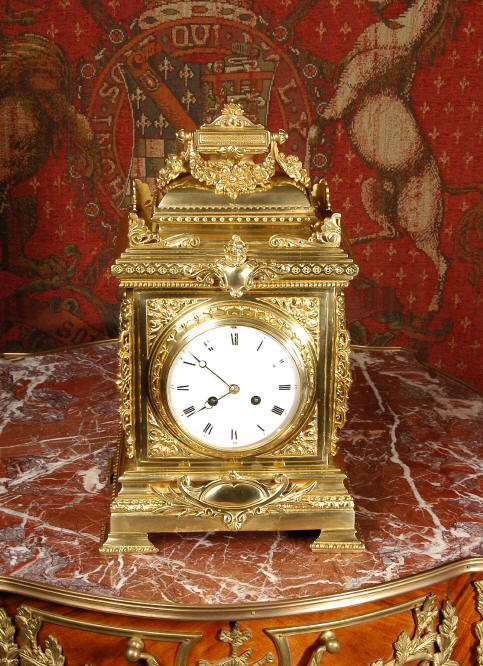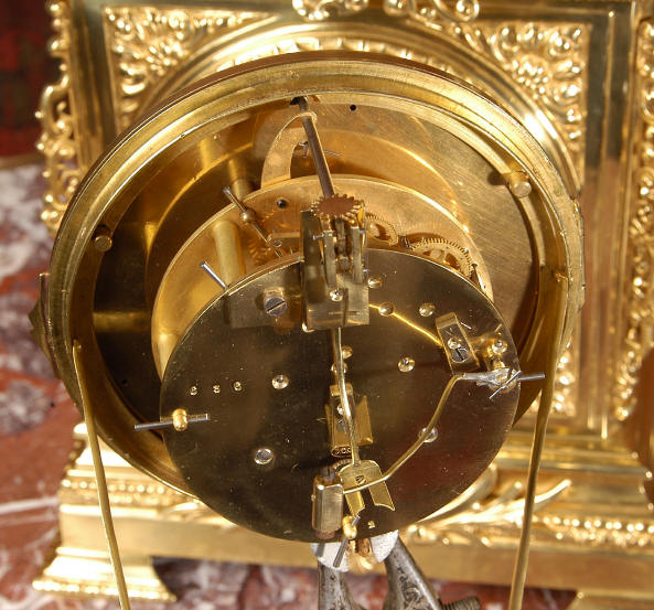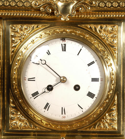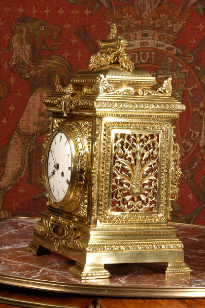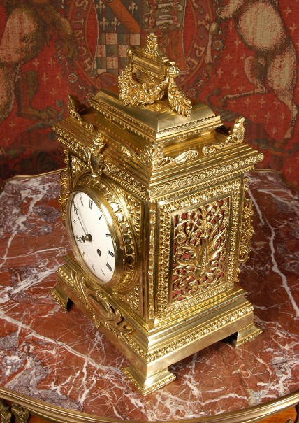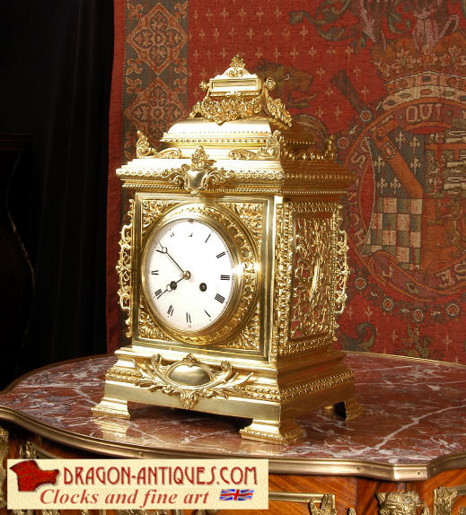 ~ French - Circa 1900 ~ ~~ Excellent condition, full overhauled and working ~~ A very impressive and substantial antique French table clock, modelled in brass in the classical style. It features a beautiful large enamel dial with fine blued steel hands. To the sides are red velvet backed sound frets, finely detailed, to enable the sonorous gong strike to be fully appreciated. The caddy top is draped with floral swags. The French movement by Fritz Marti and is of the highest quality. It is the large plate version of the Pendule de Paris movement and has the superior rack striking and pin-pallet escapement. It is complete with it's original pendulum. We have dismantled the movement, fully cleaned and overhauled it, fitted two new springs and test it thoroughly until satisfied that it runs perfectly. It runs for 8 days on one wind and strikes the hours and half-hours on a sonorous coiled gong. You can watch the clock running in the video clip below. Condition of the case is