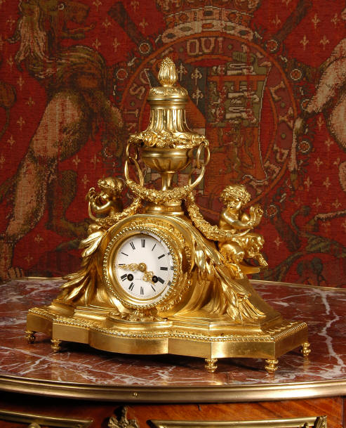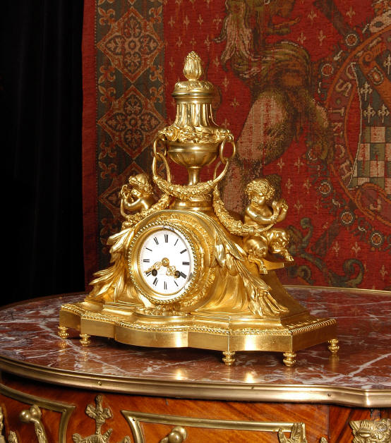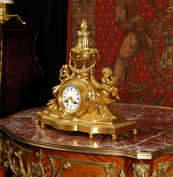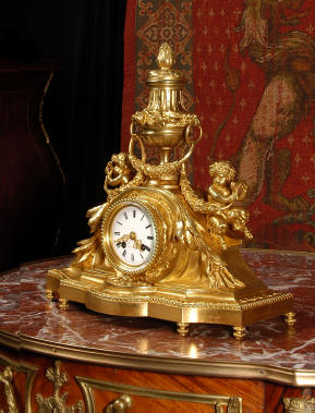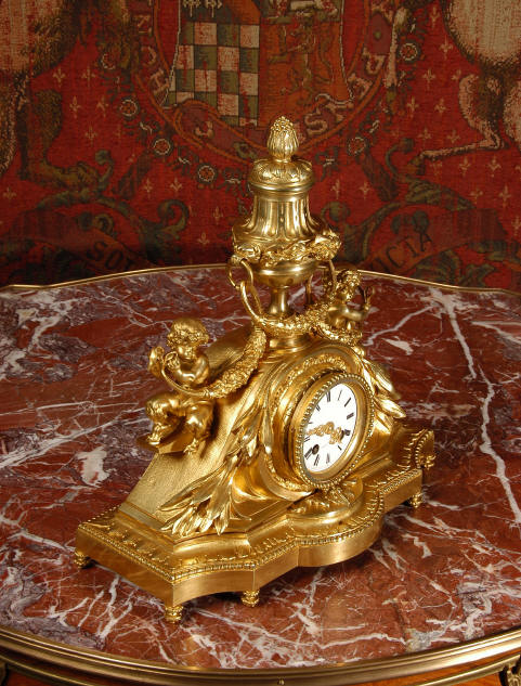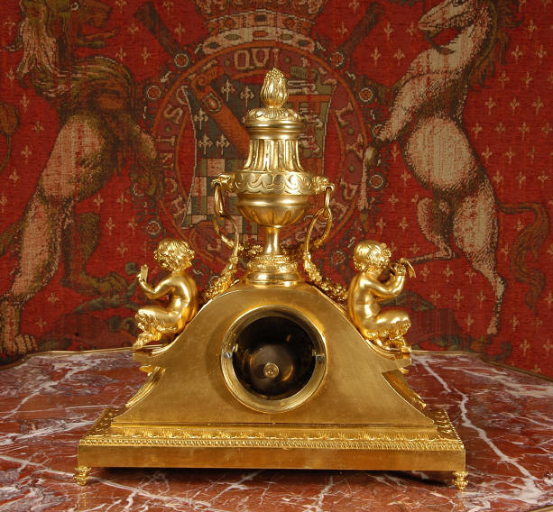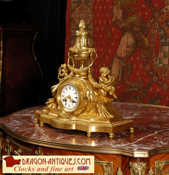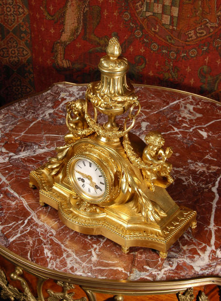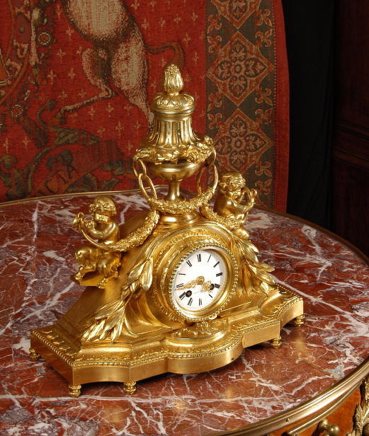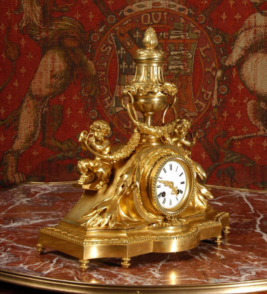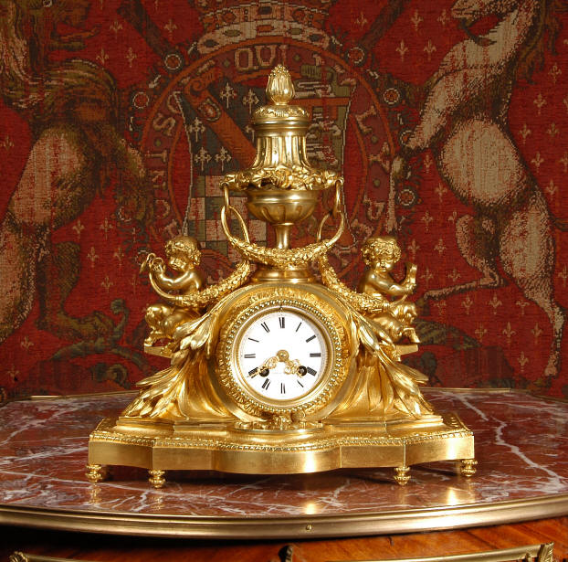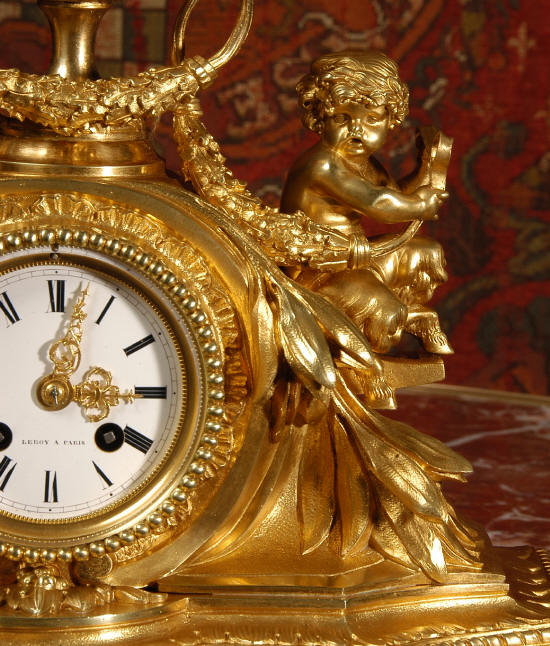 ~ French - Circa 1850 ~ ~~ Excellent condition, fully working ~~ A superb and early ormolu (fine gilded bronze/brass) boudoir clock by the well known maker Leroy, Paris. It features two delightful cherubim seated each side of the clock, holding a laurel wreath which is hung around an urn. The dial is enamel on copper and is signed with the makers name and has the original finely fretted gilt brass hands. Movement is visible through the glazed back door. The case is beautifully made in bronze/brass, hand chased and then gilded, the gilding is in very good condition. The Antique French movement is the early and small type of Pendule de Paris with outside hammer return spring. It features the superior pin-pallet escapement and has the makers signature on the backplate. It is in excellent clean and running condition having been fully overhauled and tested by our clockmaker. We have replaced the missing pendulum. It runs for 8 days on one wind and strikes the hours and half-hours on a bell. See the video clip below to see the clock running and striking. Basile Charles Le Roy was the Master Clockmaker to Napoleon & along with his son Charles-Louis were clockmaker�s to the Princess Pauline and the Duke de Bourbon. Examples of their work are in all the major collections as well in the Ministere de la Guerre, Paris. The Maison de Le Roy was founded in 1785 at Palais Royal & continued until the death of Charles at Versailles in 1865. Condition of the case is