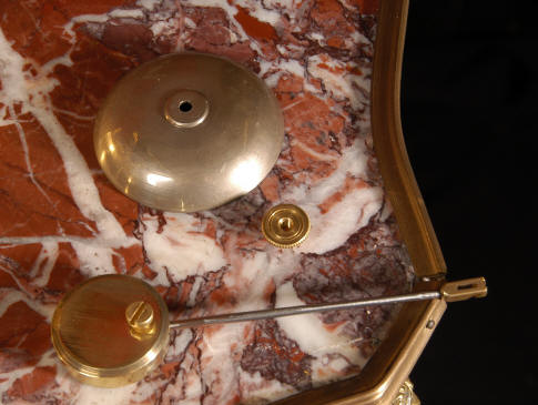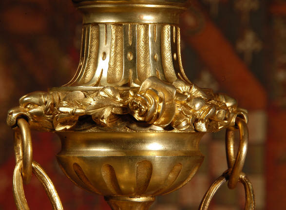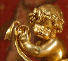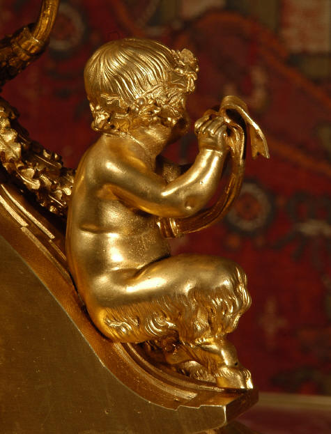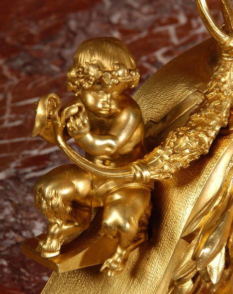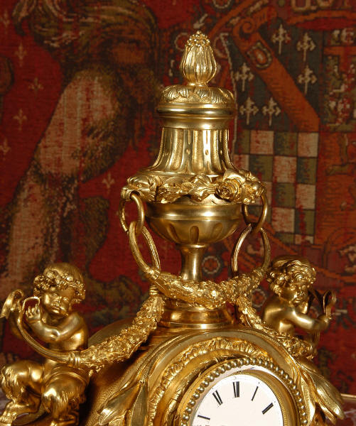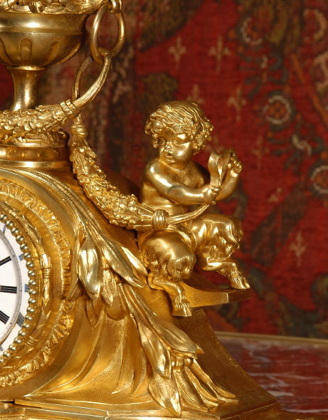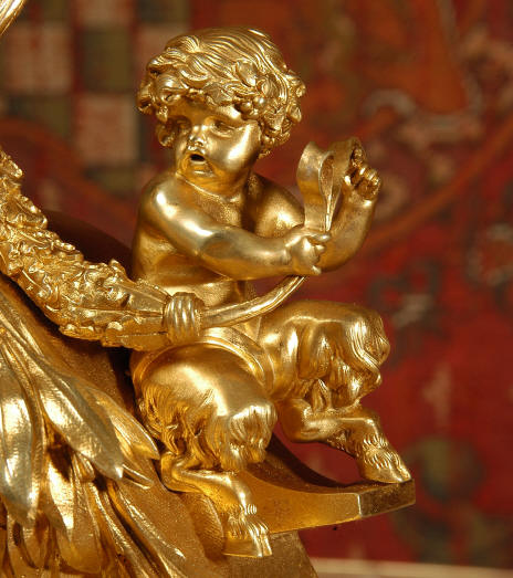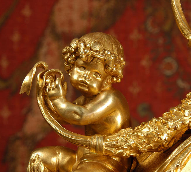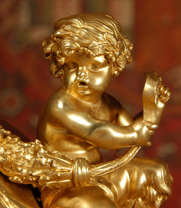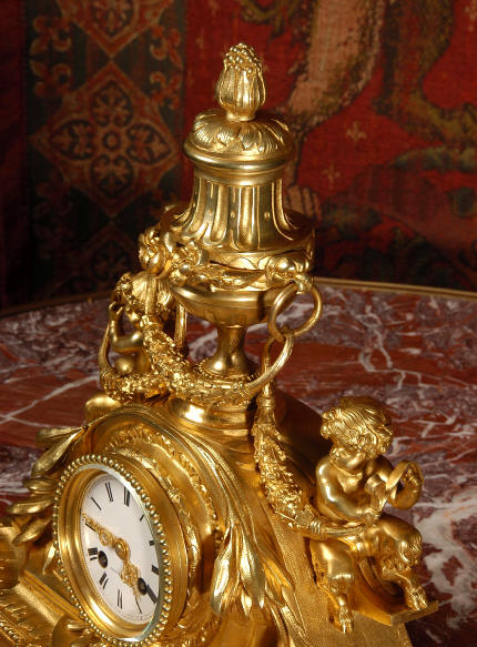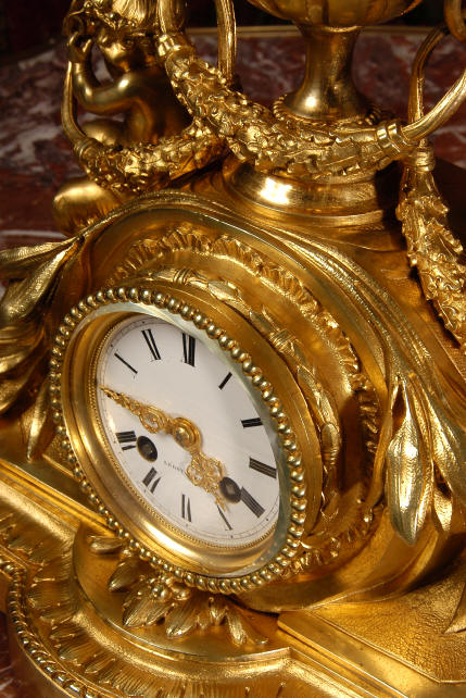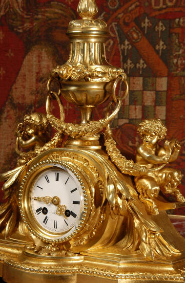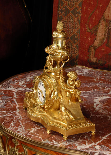 ~ French - Circa 1850 ~ ~~ Excellent condition, fully working ~~ A superb and early ormolu (fine gilded bronze/brass) boudoir clock by the well known maker Leroy, Paris. It features two delightful cherubim seated each side of the clock, holding a laurel wreath which is hung around an urn. The dial is enamel on copper and is signed with the makers name and has the original finely fretted gilt brass hands. Movement is visible through the glazed back door. The case is beautifully made in bronze/brass, hand chased and then gilded, the gilding is in very good condition. The Antique French movement is the early and small type of Pendule de Paris with outside hammer return spring. It features the superior pin-pallet escapement and has the makers signature on the backplate. It is in excellent clean and running condition having been fully overhauled and tested by our clockmaker. We have replaced the missing pendulum. It runs for 8 days on one wind and strikes the hours and half-hours on a bell. See the video clip below to see the clock running and striking. Basile Charles Le Roy was the Master Clockmaker to Napoleon & along with his son Charles-Louis were clockmaker�s to the Princess Pauline and the Duke de Bourbon. Examples of their work are in all the major collections as well in the Ministere de la Guerre, Paris. The Maison de Le Roy was founded in 1785 at Palais Royal & continued until the death of Charles at Versailles in 1865. Condition of the case is
