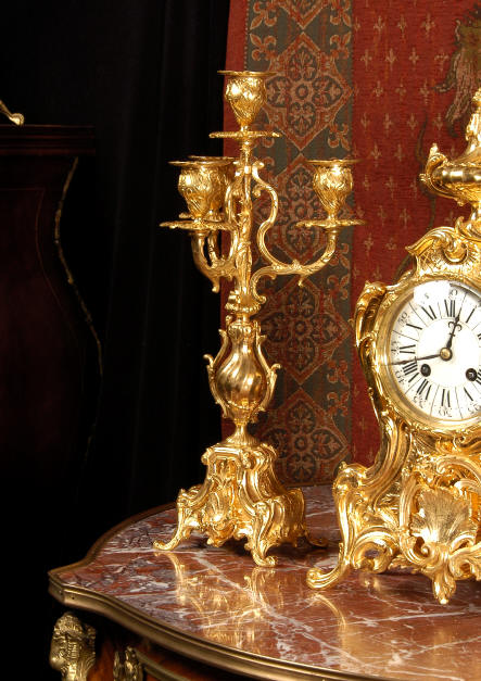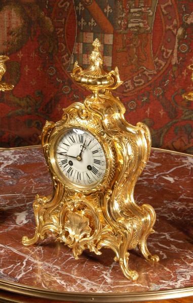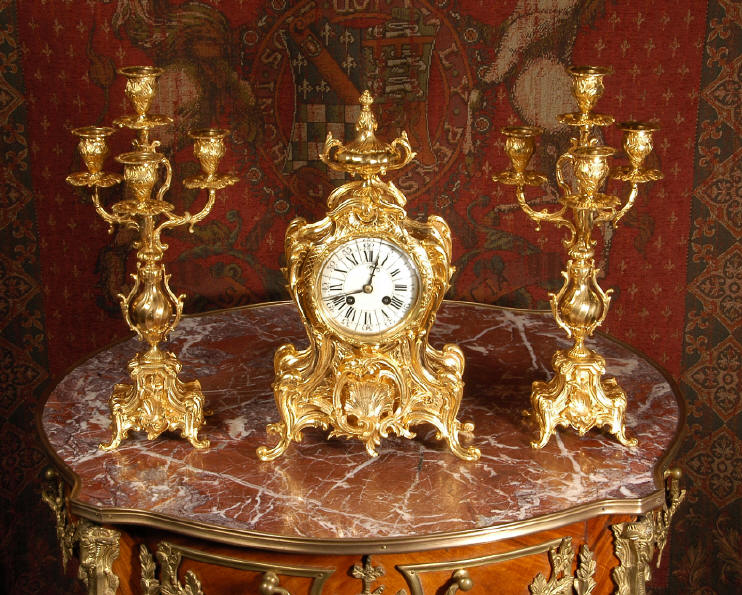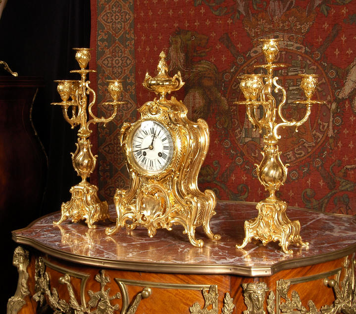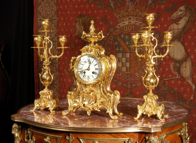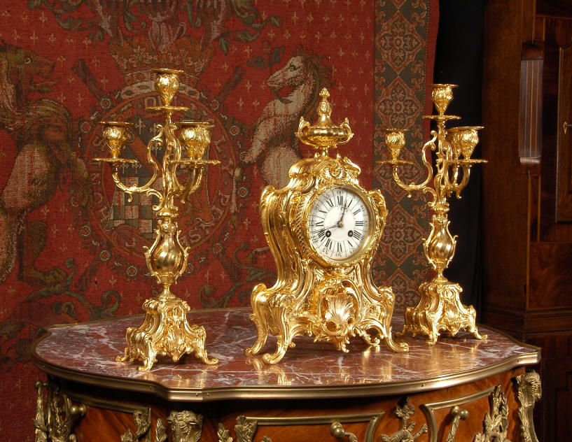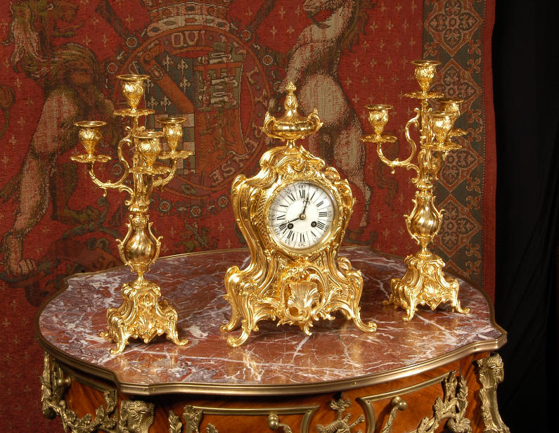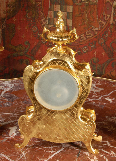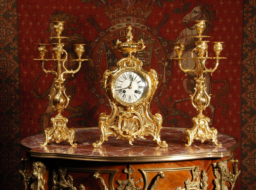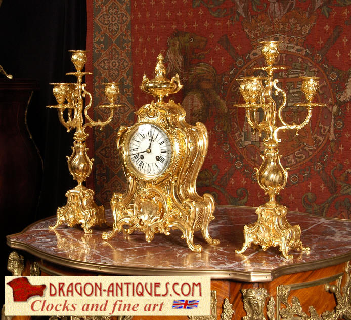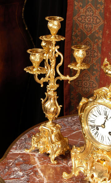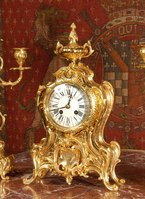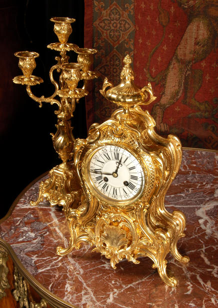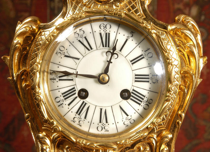 ~ French - Circa 1880 ~ ~~ Excellent condition, fully overhauled and tested ~~ An Antique French Rococo boudoir clock, stunning in its original gilding which is bright and clean. The case is boldly modelled in typical Rococo style, a waisted key hole shape decorated with fine 'c' scrolls, shells, acanthus leaves and floral swags. To the front of the case beneath the dial is a panel of shell and floral swags. Candelabra have matching bases which are surmounted by ovoid urns and 3 branch candelabra. The dial is enamel on copper with a separate Arabic minute ring and is complete with original blued steel hands. The back door is glazed with frosted glass. Movement is of the highest quality and has been fully cleaned and serviced in our workshop including a new pendulum and is in excellent clean and running condition. It runs for 8 days and strikes the hours and halves on a bell. Click the movie below to hear the bell and watch the clock running! Condition of the case is