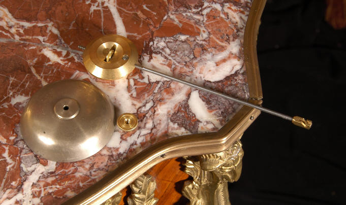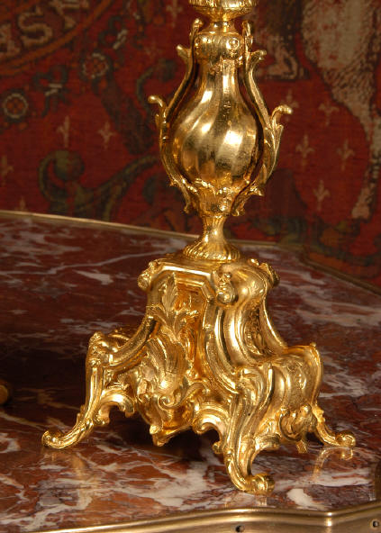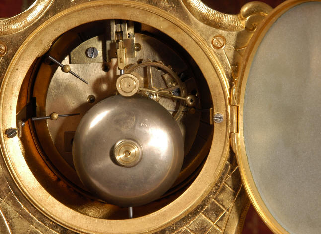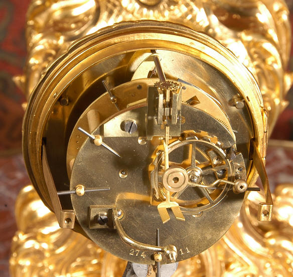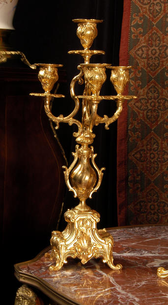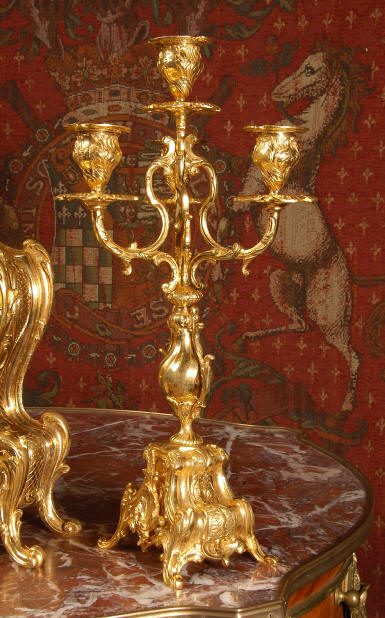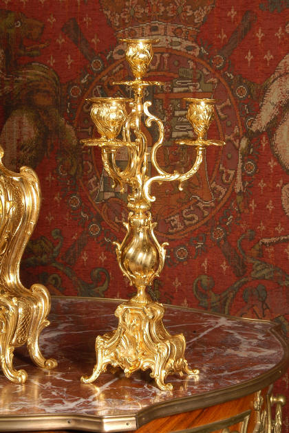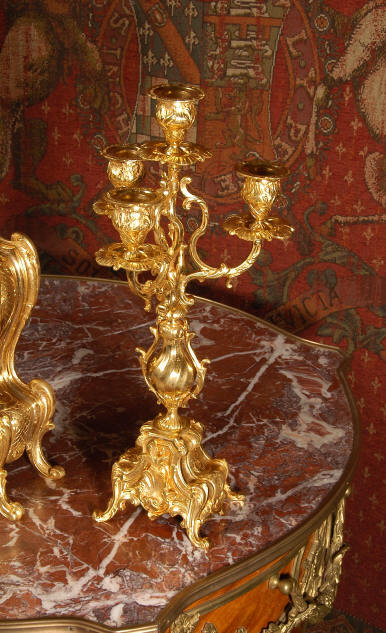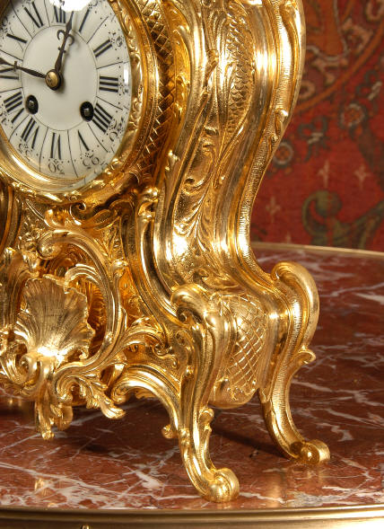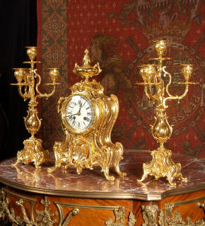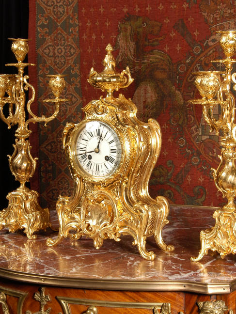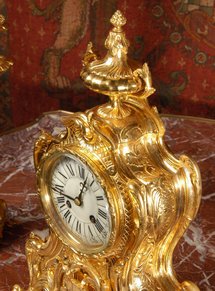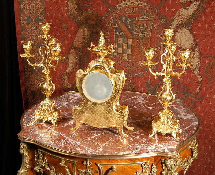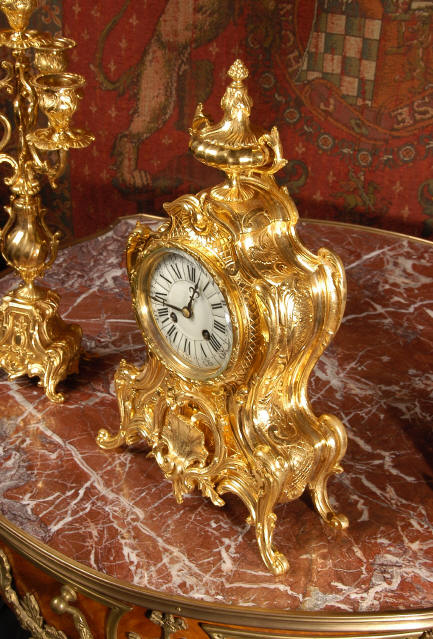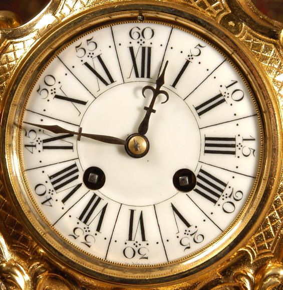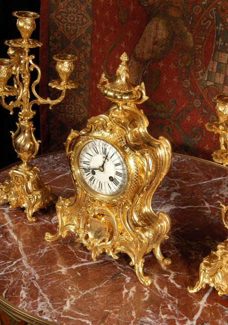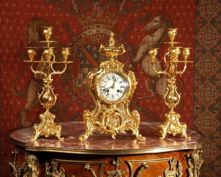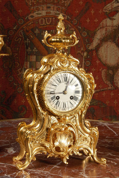 ~ French - Circa 1880 ~ ~~ Excellent condition, fully overhauled and tested ~~ An Antique French Rococo boudoir clock, stunning in its original gilding which is bright and clean. The case is boldly modelled in typical Rococo style, a waisted key hole shape decorated with fine 'c' scrolls, shells, acanthus leaves and floral swags. To the front of the case beneath the dial is a panel of shell and floral swags. Candelabra have matching bases which are surmounted by ovoid urns and 3 branch candelabra. The dial is enamel on copper with a separate Arabic minute ring and is complete with original blued steel hands. The back door is glazed with frosted glass. Movement is of the highest quality and has been fully cleaned and serviced in our workshop including a new pendulum and is in excellent clean and running condition. It runs for 8 days and strikes the hours and halves on a bell. Click the movie below to hear the bell and watch the clock running! Condition of the case is