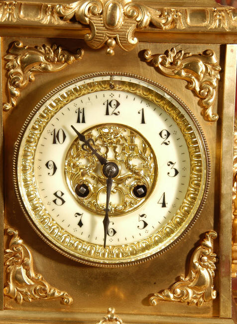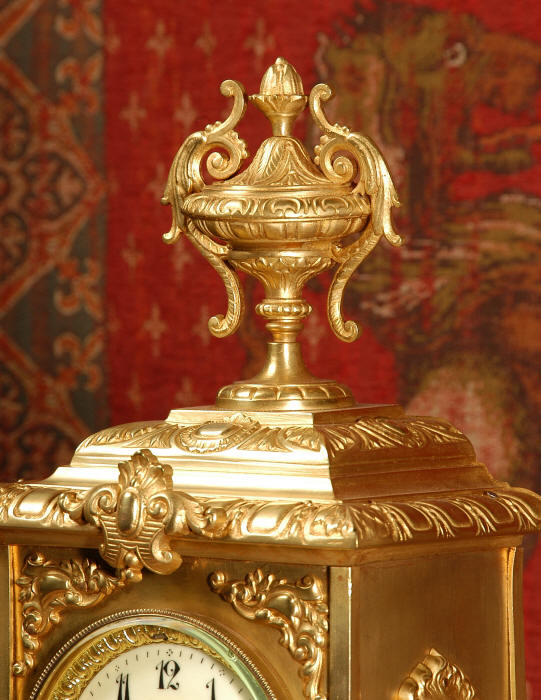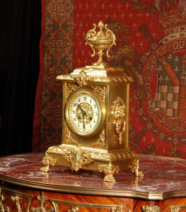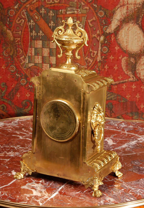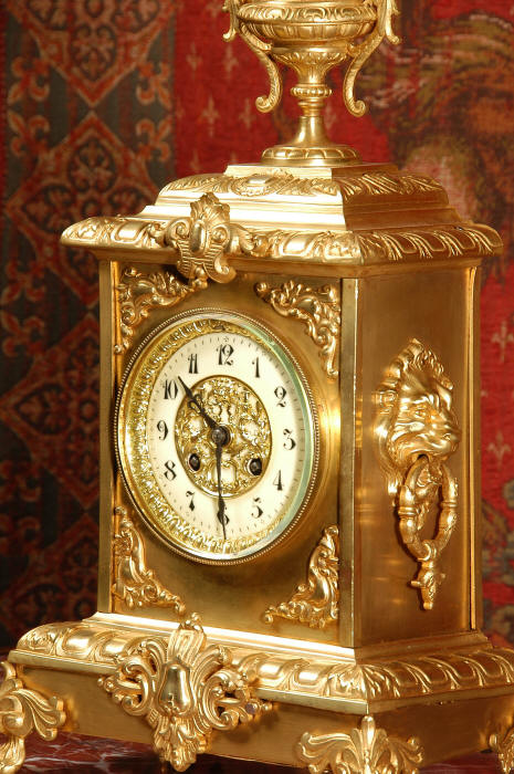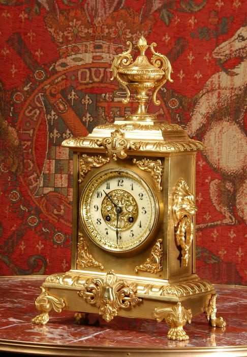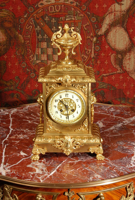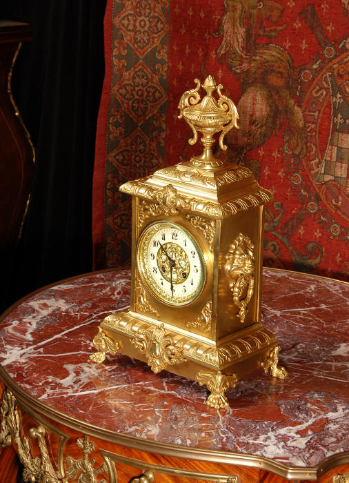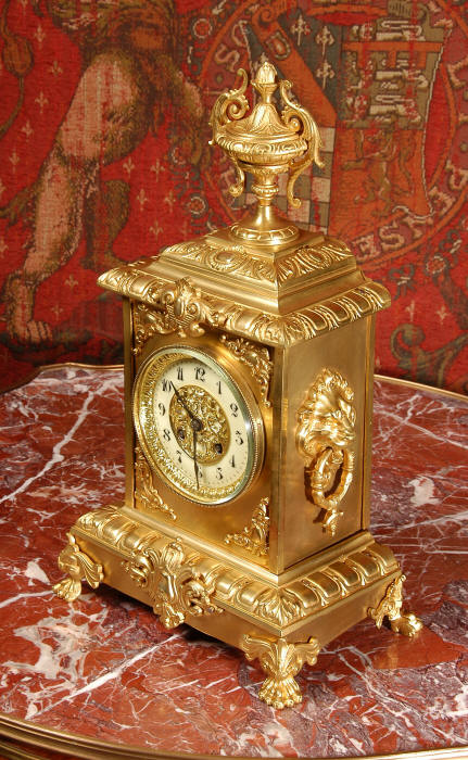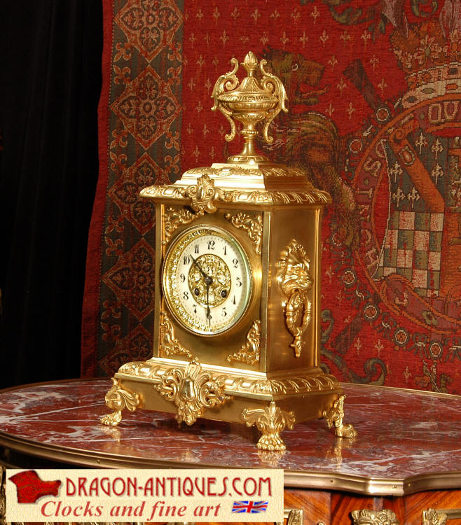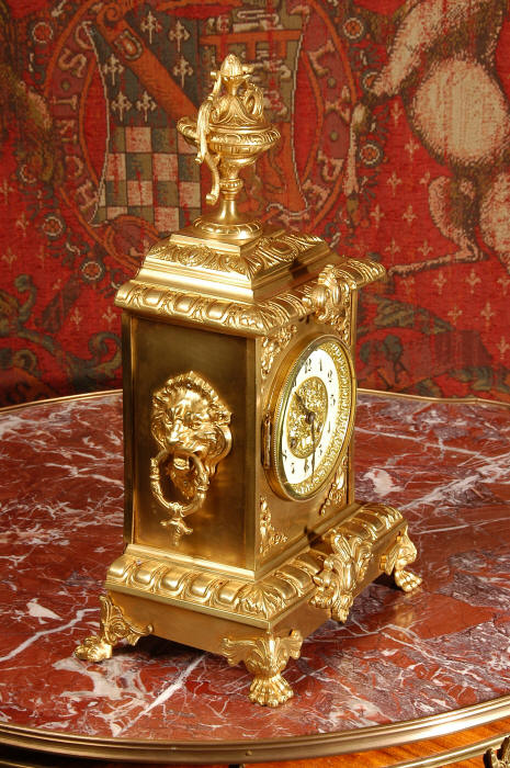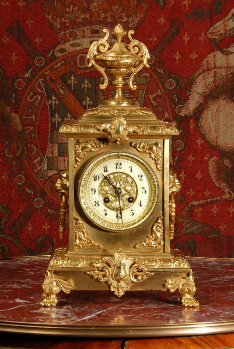 ~ French - Circa 1860 ~ ~~ Excellent condition ~~ An early and very decorative French Gothic table clock by the famous maker Japy Freres. It features lions mask handles to the sides, a hairy paw feet and is surmounted by an urn. This is the earlier design with a timber carcass mounted with brass. The detailing is sharp and finely executed and the clock has a very good, clean and bright finish. The dial is cream enamel on copper with a gilt brass centre and is complete with original blued steel hands. The Japy Freres French movement is of the highest quality and has the clockmakers 'Grand Medaille D'Honour' mark on the backplate. It is in excellent clean and running condition having been fully serviced by our clockmaker. Pendulum is an old replacement. It runs for 8 days on one wind and strikes the hours and halves on a bell. Click the video clip below to see the clock running! Condition of the case is excellent with clean and bright finish. The timber carcass has moved slightly over time. The back feet look like replacements. The urn is ever so slightly distorted. The dial is in excellent condition with no chips or scratches. Complete with pendulum, bell and a suitable key. Full setting up instructions supplied if required