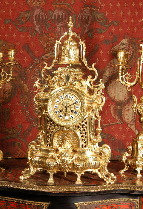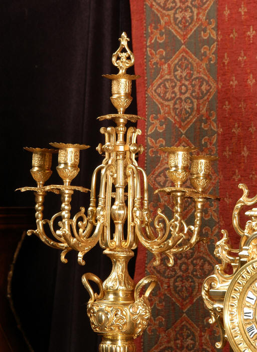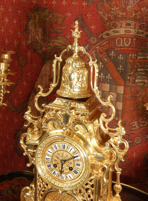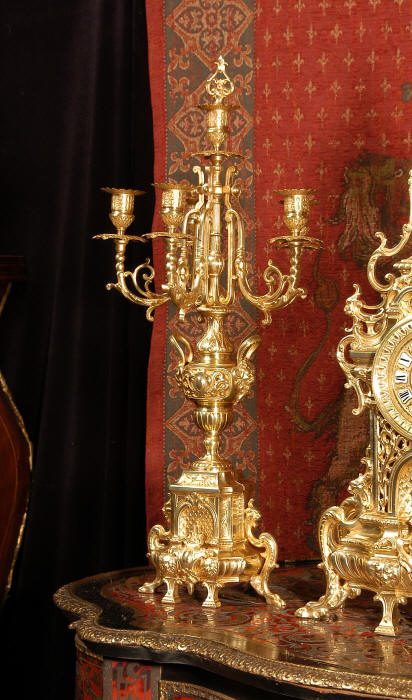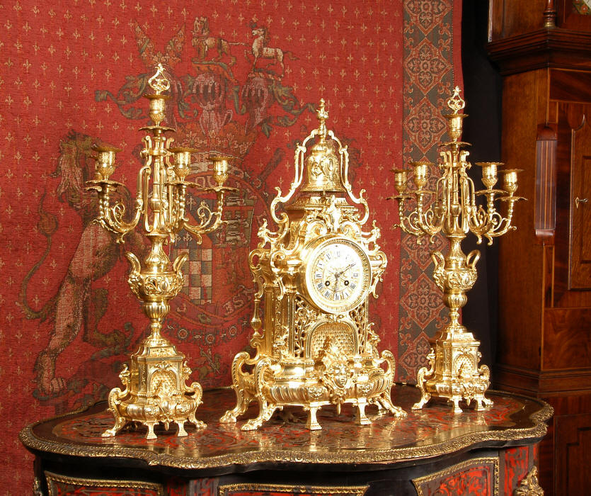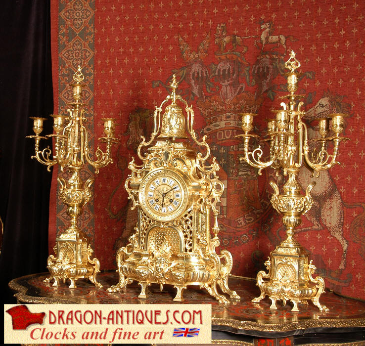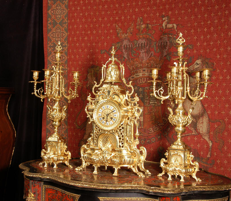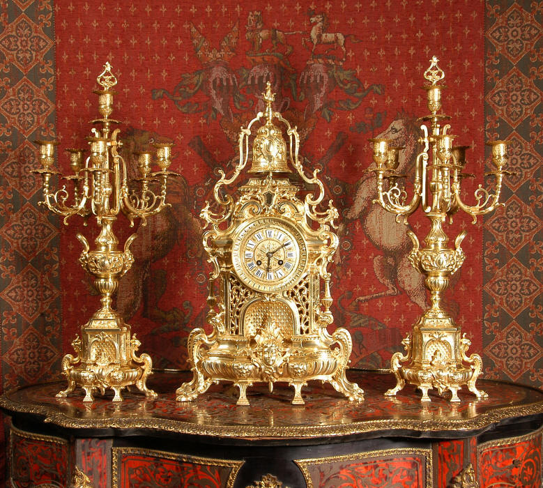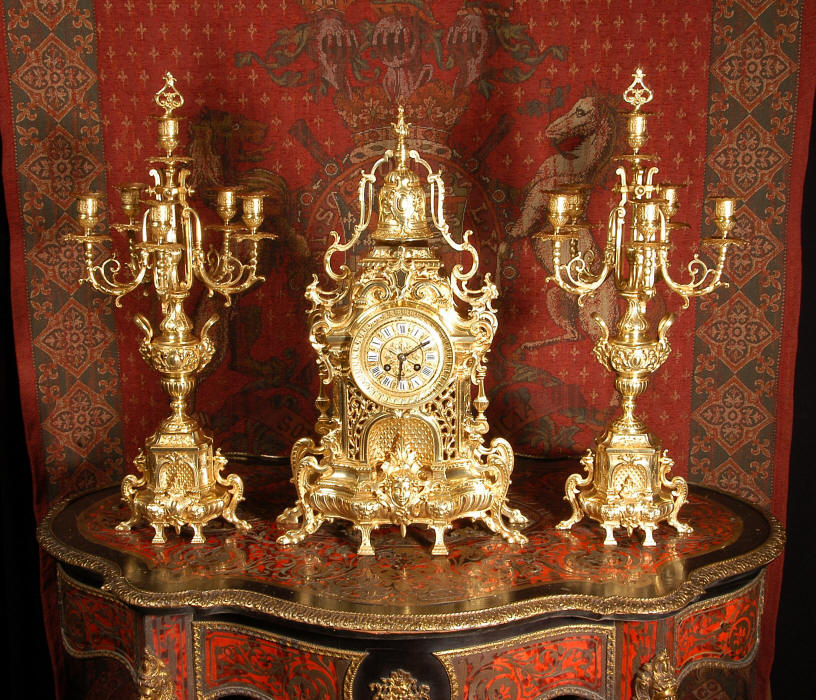 ~ French - Circa 1880 ~ ~~ Excellent condition, fully overhauled & working ~~ A Large and impressive antique French Gothic clock set, beautifully made in gilt brass, very heavy and crisply modelled and with much of the original gilding remaining. The style is typically French gothic, architecturally designed with lions masks, hairy paw feet, flowing foliage and surmounted by a bell. The body of the clock is fretted and modelled as a niche embedded in the overgrown foliage. The pendulum can be glimpsed swinging through the fretwork. The matching candelabra are 6 light and the bases are modelled to compliment the design of the clock, they are complete with snuffers. Dial is also brass, mounted with 12 individual enamel cartouches for the hours. Antique French movement is is of excellent quality, runs for 8 days on one wind and strikes half-hourly on a bell. It has been fully restored in our workshop and is on excellent clean and running condition. The pendulum is a replacement. Click the video clip below to see and hear the movement working! Condition of the case is