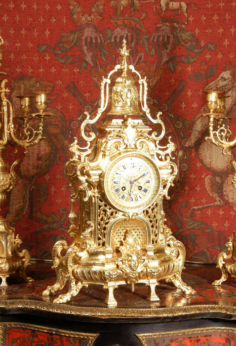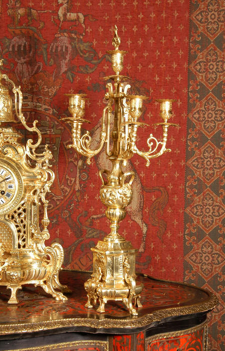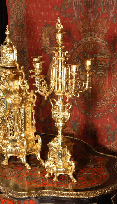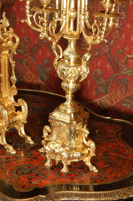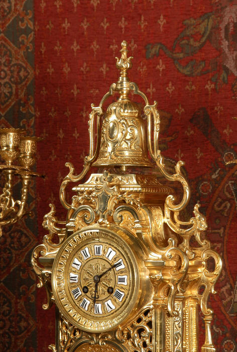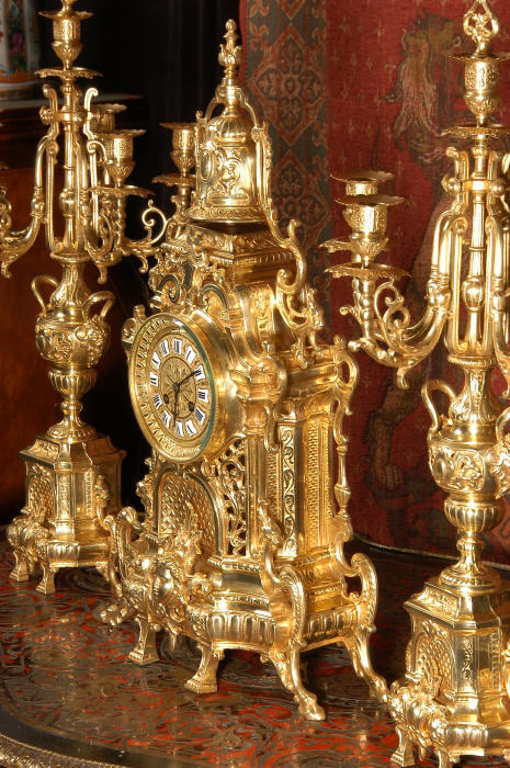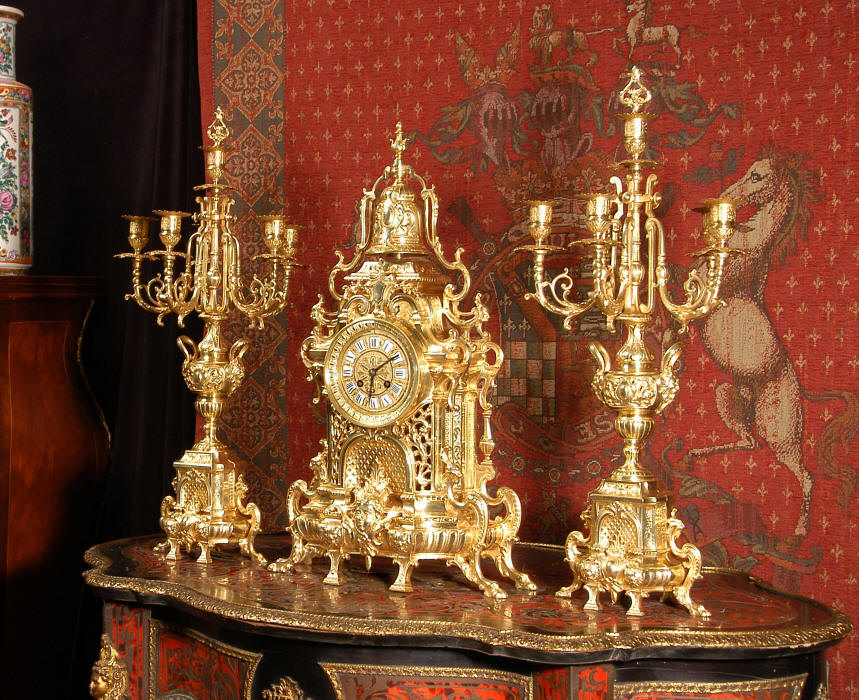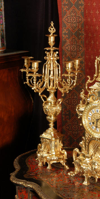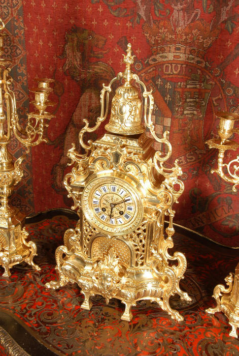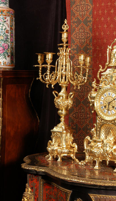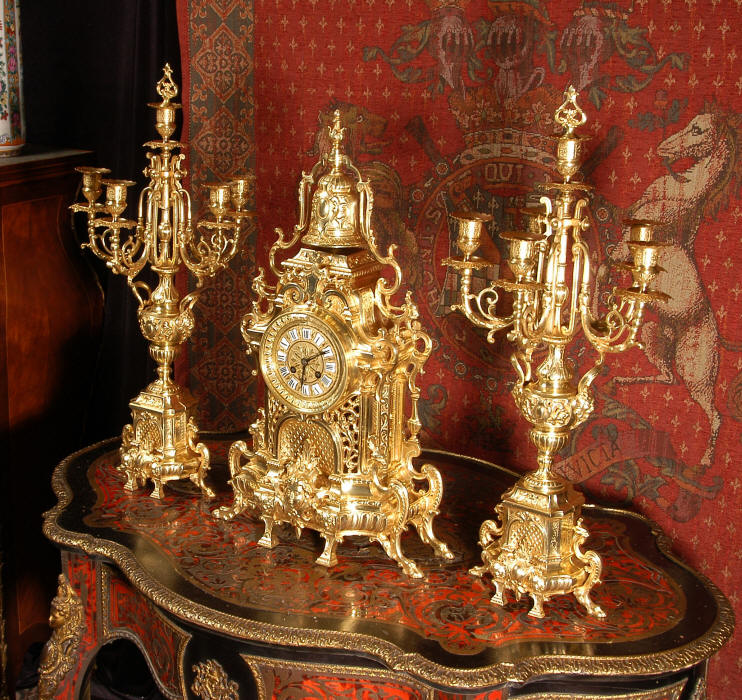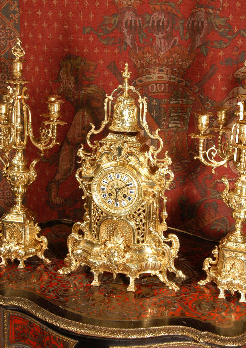~ French - Circa 1880 ~ ~~ Excellent condition, fully overhauled & working ~~ A Large and impressive antique French Gothic clock set, beautifully made in gilt brass, very heavy and crisply modelled and with much of the original gilding remaining. The style is typically French gothic, architecturally designed with lions masks, hairy paw feet, flowing foliage and surmounted by a bell. The body of the clock is fretted and modelled as a niche embedded in the overgrown foliage. The pendulum can be glimpsed swinging through the fretwork. The matching candelabra are 6 light and the bases are modelled to compliment the design of the clock, they are complete with snuffers. Dial is also brass, mounted with 12 individual enamel cartouches for the hours. Antique French movement is is of excellent quality, runs for 8 days on one wind and strikes half-hourly on a bell. It has been fully restored in our workshop and is on excellent clean and running condition. The pendulum is a replacement. Click the video clip below to see and hear the movement working! Condition of the case is