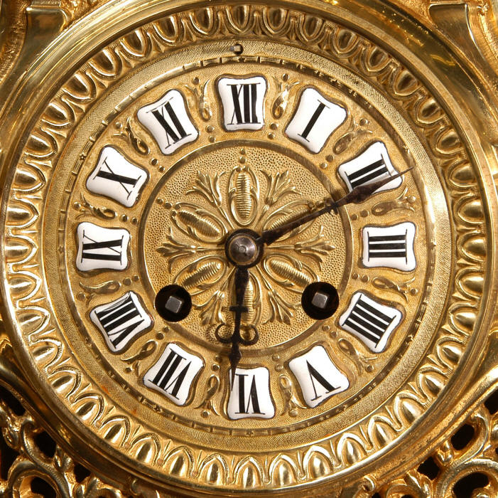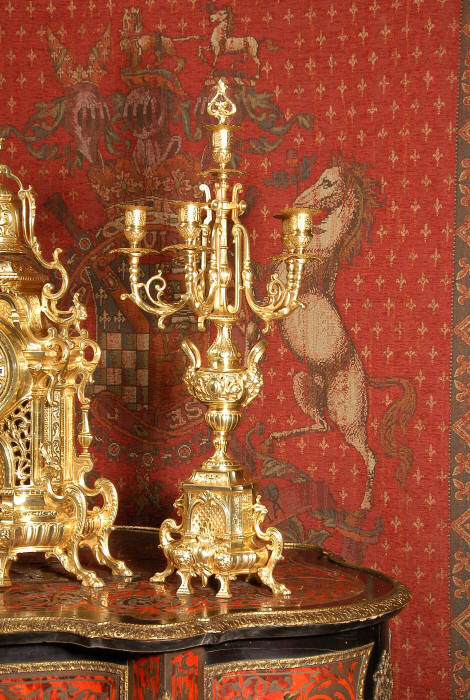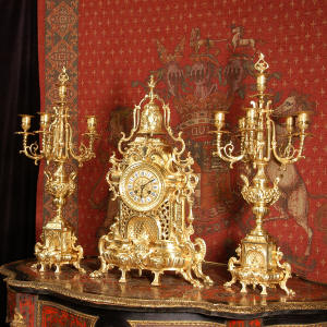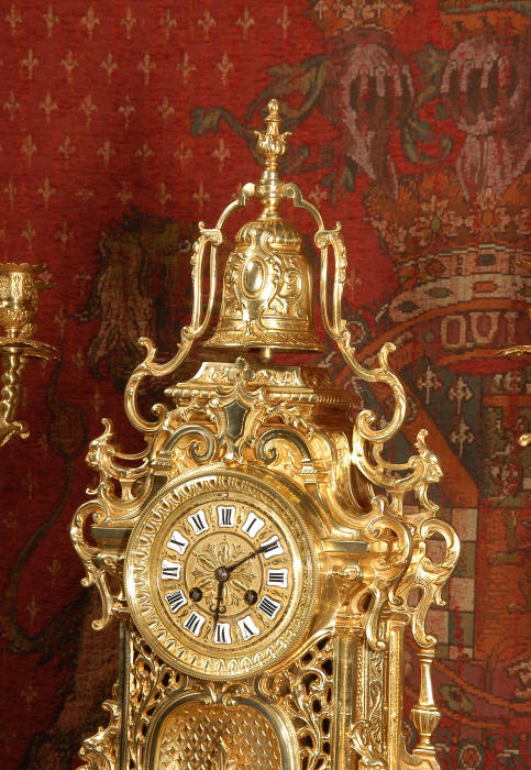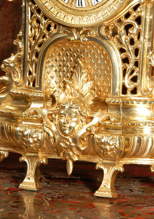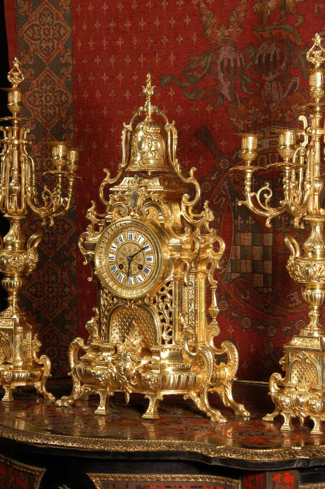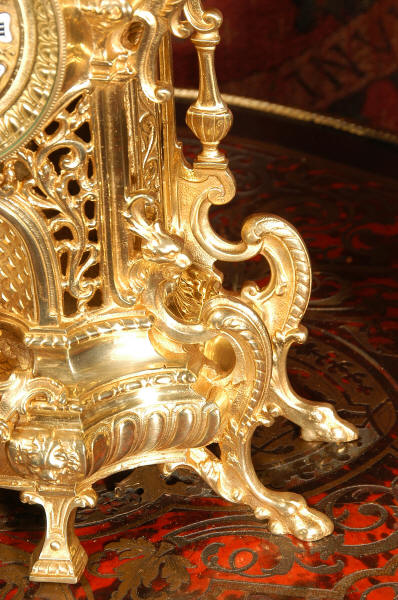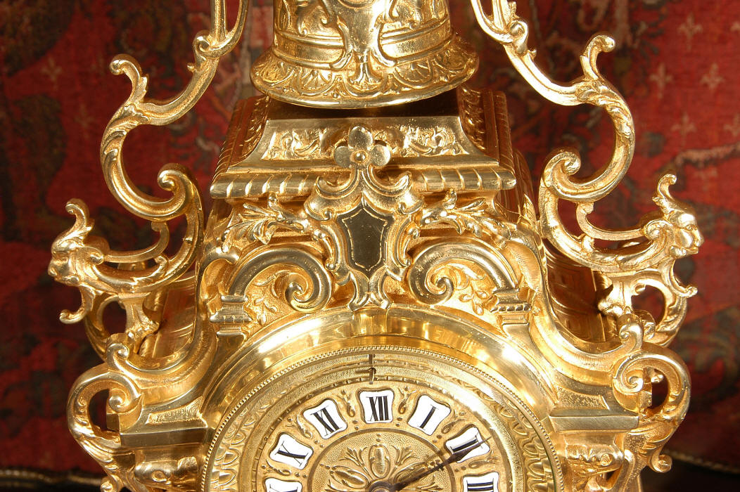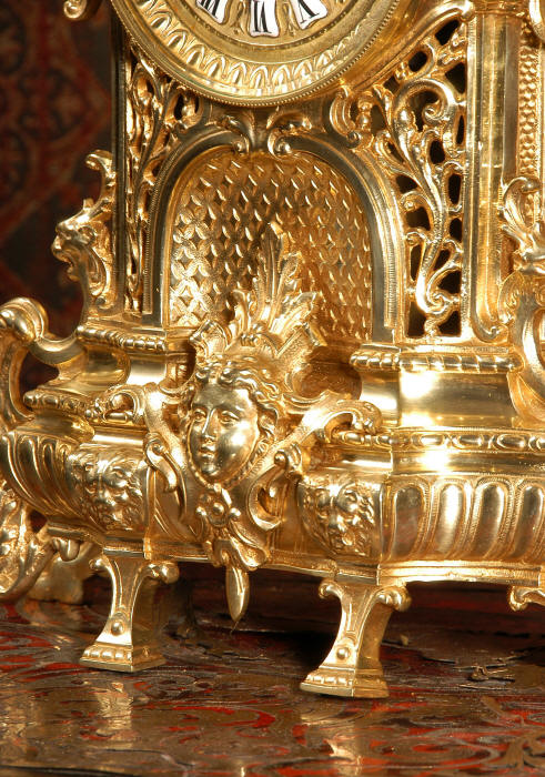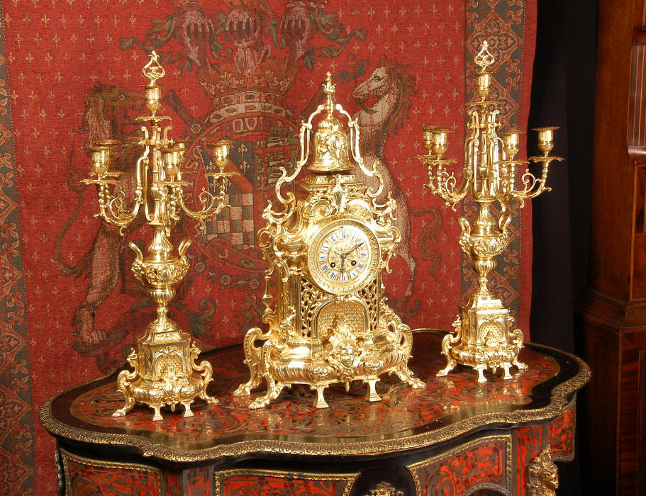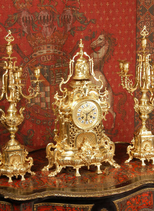 ~ French - Circa 1880 ~ ~~ Excellent condition, fully overhauled & working ~~ A Large and impressive antique French Gothic clock set, beautifully made in gilt brass, very heavy and crisply modelled and with much of the original gilding remaining. The style is typically French gothic, architecturally designed with lions masks, hairy paw feet, flowing foliage and surmounted by a bell. The body of the clock is fretted and modelled as a niche embedded in the overgrown foliage. The pendulum can be glimpsed swinging through the fretwork. The matching candelabra are 6 light and the bases are modelled to compliment the design of the clock, they are complete with snuffers. Dial is also brass, mounted with 12 individual enamel cartouches for the hours. Antique French movement is is of excellent quality, runs for 8 days on one wind and strikes half-hourly on a bell. It has been fully restored in our workshop and is on excellent clean and running condition. The pendulum is a replacement. Click the video clip below to see and hear the movement working! Condition of the case is