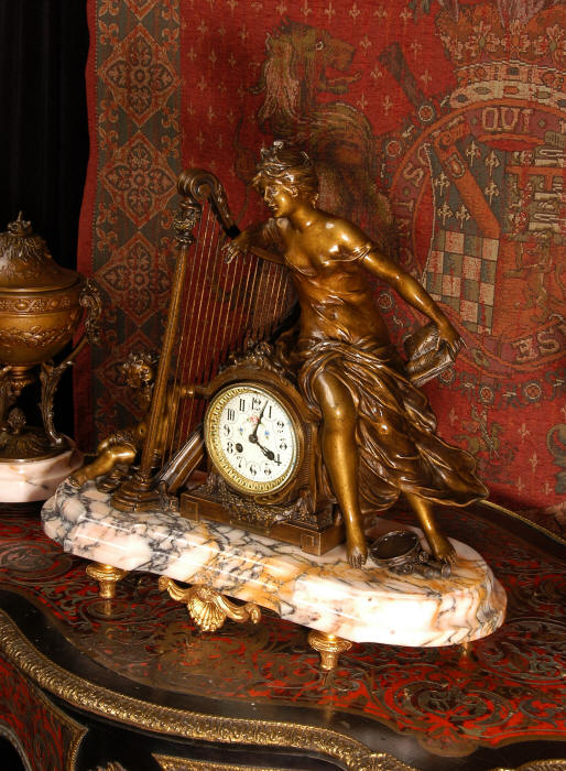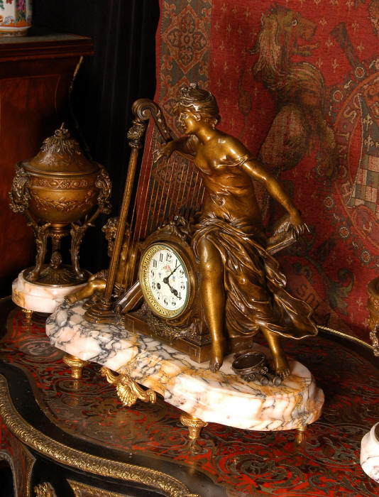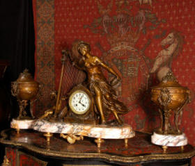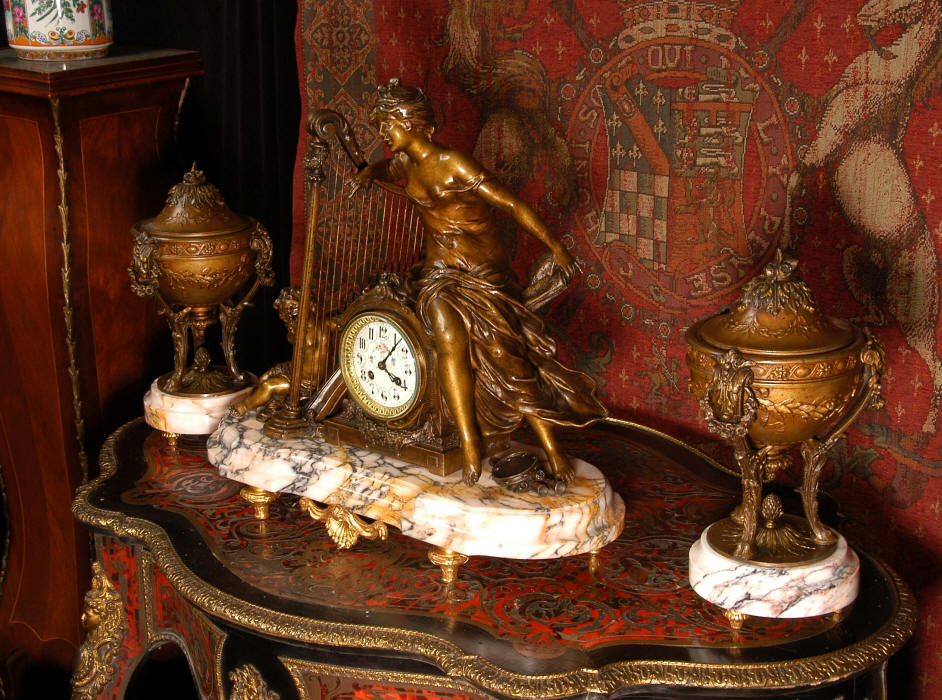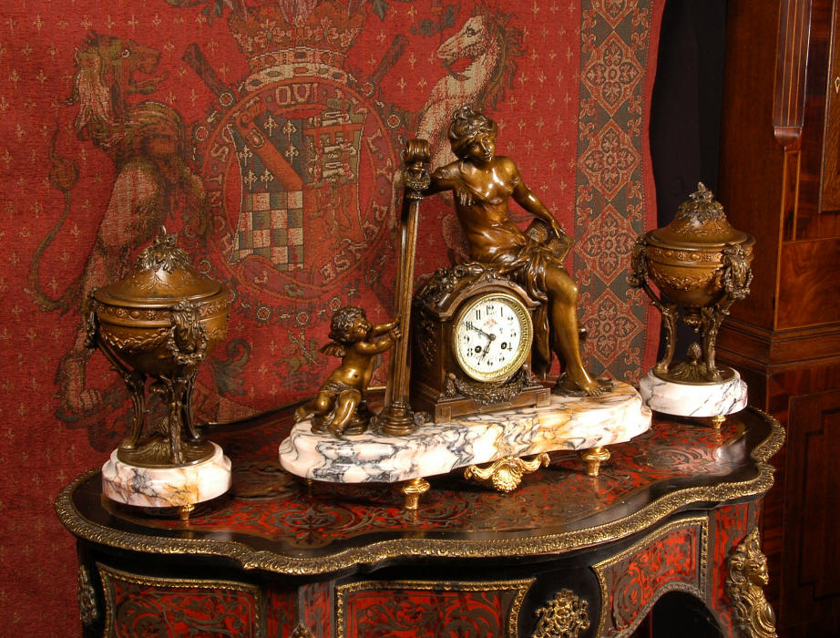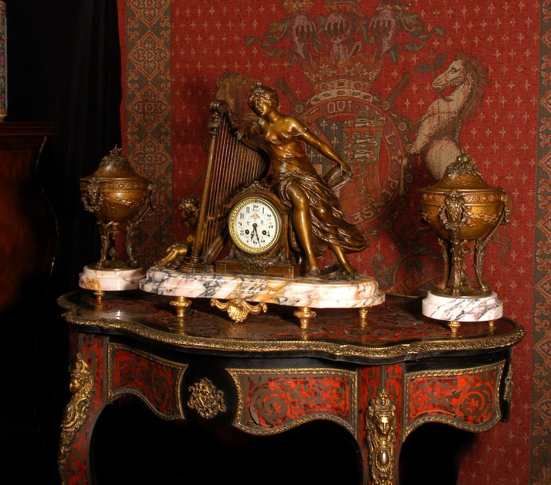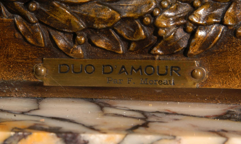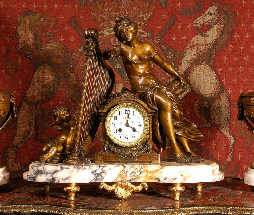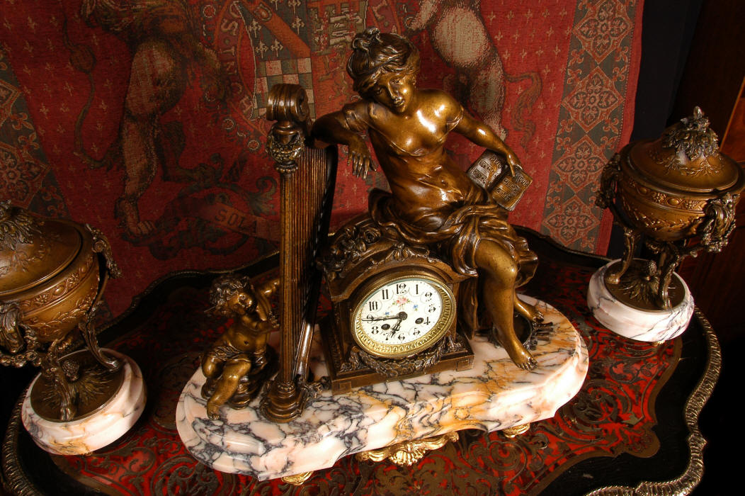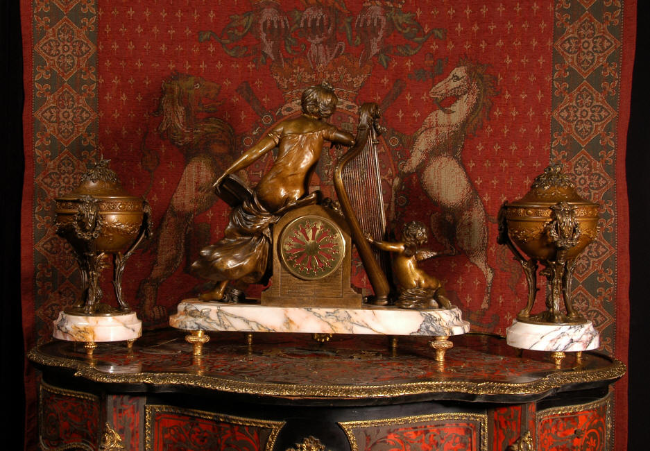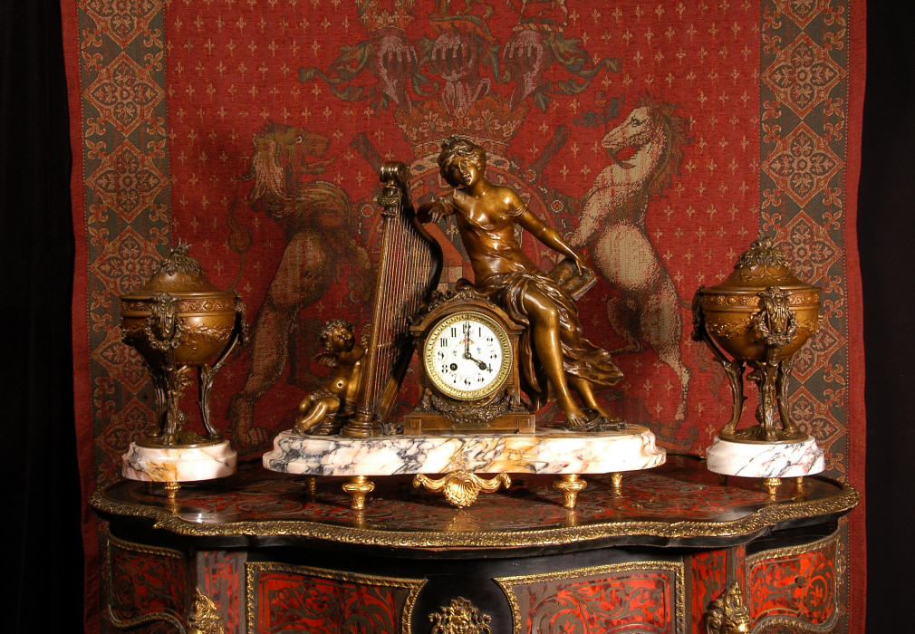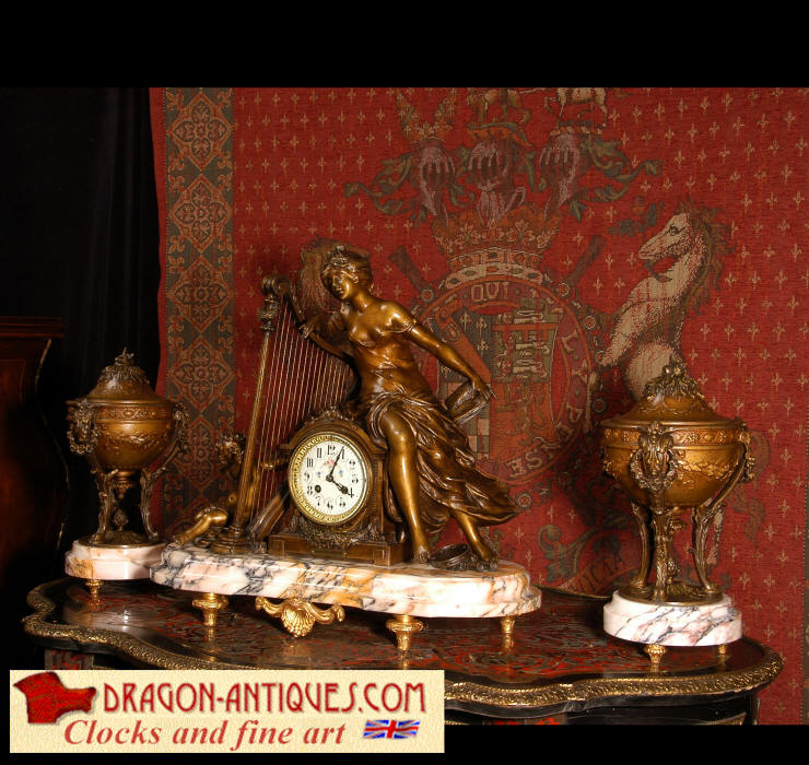 ~ French - Circa 1900 ~ ~~ Excellent condition, fully overhauled and working ~~ A Stunning, Large Antique French clock set by the sculptor Hippolyte François Moreau entitled Duo D'Amour (love duet). It features a beautifully modelled muse of music singing with a putto playing a harp. To her feet is a tambourine and pipes. The lidded side urns are classical in style with hoof feet and laurel wreaths and are mounted on matching marble bases. The set is beautifully made in patinated bronzed metal mounted on variegated specimen marble bases, it is in excellent condition. A plaque is mounted on the front of the case with the artist and the title of the piece. The movement has the clockmakers mark 'gold medal Paris 1900' on the backplate. Hippolyte François Moreau (1832-1927) was the second son of Jean-Baptiste Moreau, Hippolyte Moreau went to work in Paris under the direction of Jouffroy and exhibited his first work at the Salon in 1859. The best of his work includes charming full figures of children and young women, mostly allegorical, often with the same subjects as used by Hippolyte's brother Auguste. He is well listed and known, see the Artprice database for more information. The French movement by Fritz Marti, it is of excellent quality and has been fully overhauled by our clockmaker. Pendulum is original. It runs for 8 days on one wind and strikes the hours and halves on a bell. Click the video clip below to hear the bell and watch the clock running! Condition of the case is