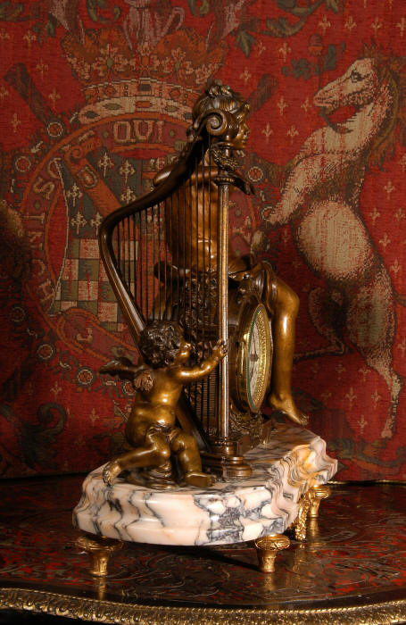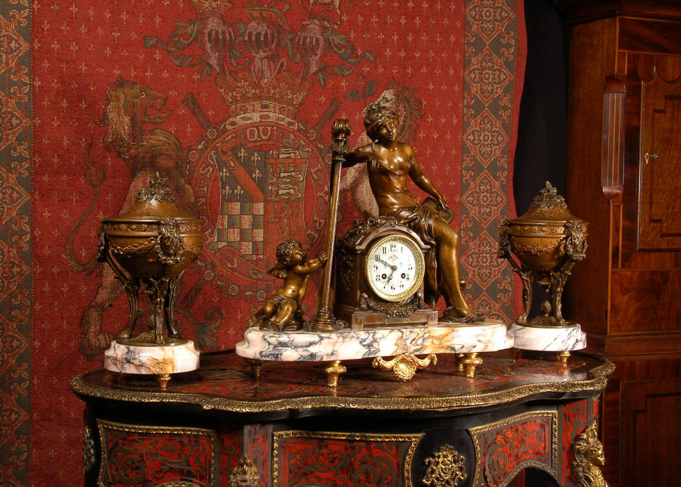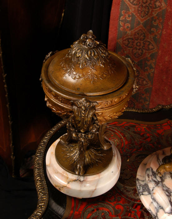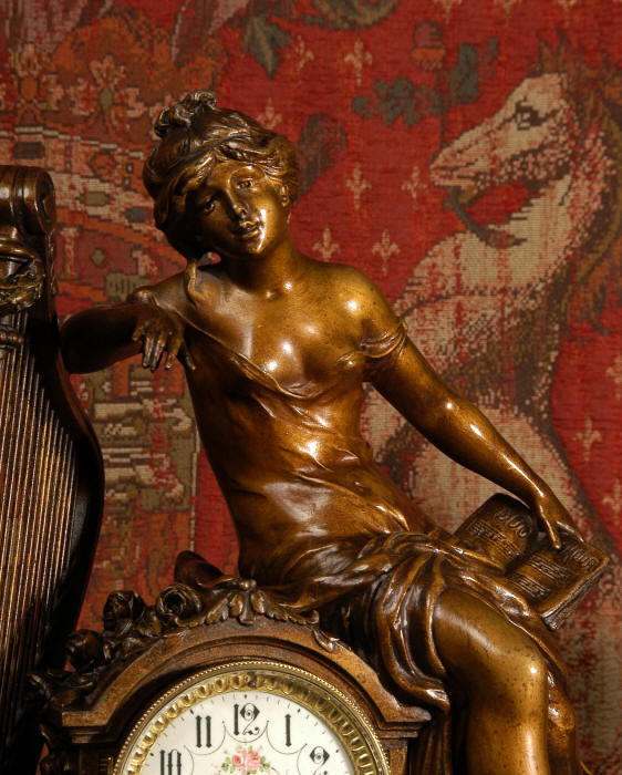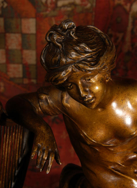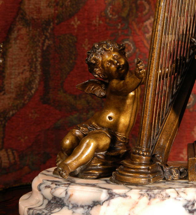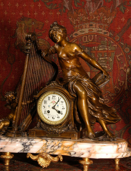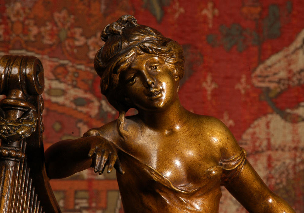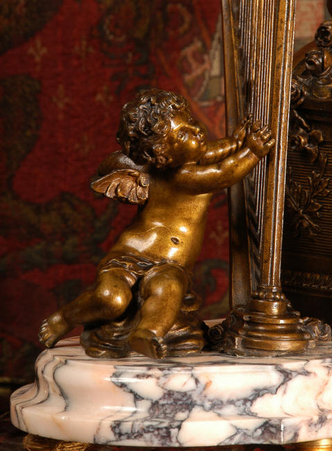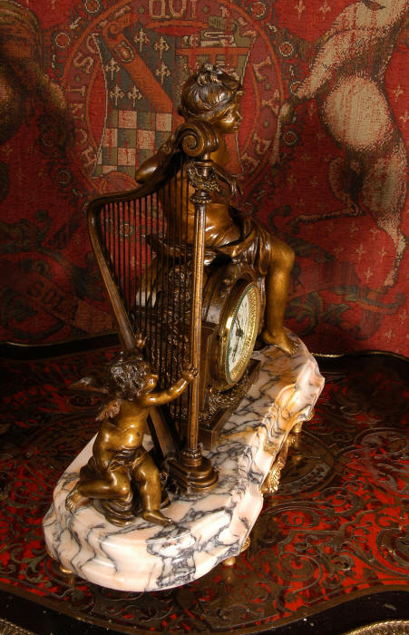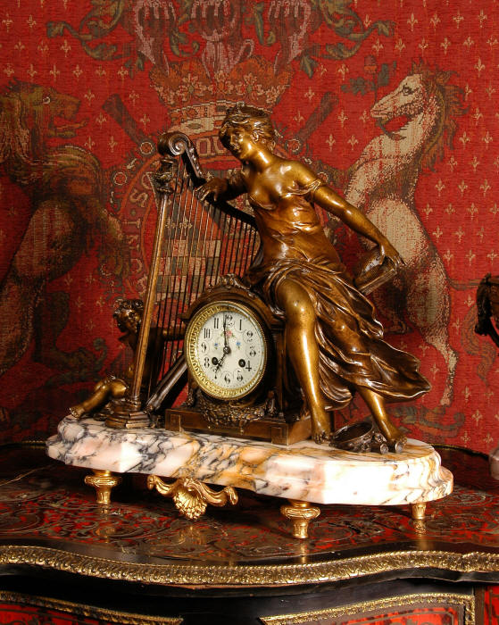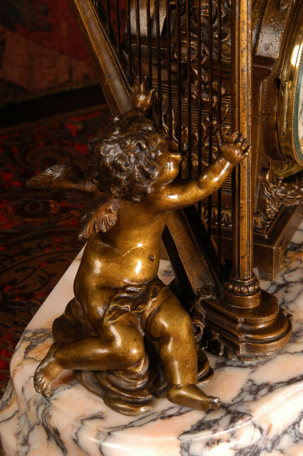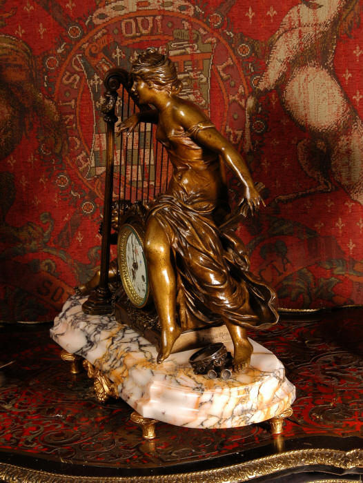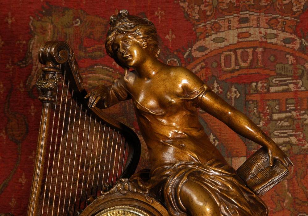 ~ French - Circa 1900 ~ ~~ Excellent condition, fully overhauled and working ~~ A Stunning, Large Antique French clock set by the sculptor Hippolyte François Moreau entitled Duo D'Amour (love duet). It features a beautifully modelled muse of music singing with a putto playing a harp. To her feet is a tambourine and pipes. The lidded side urns are classical in style with hoof feet and laurel wreaths and are mounted on matching marble bases. The set is beautifully made in patinated bronzed metal mounted on variegated specimen marble bases, it is in excellent condition. A plaque is mounted on the front of the case with the artist and the title of the piece. The movement has the clockmakers mark 'gold medal Paris 1900' on the backplate. Hippolyte François Moreau (1832-1927) was the second son of Jean-Baptiste Moreau, Hippolyte Moreau went to work in Paris under the direction of Jouffroy and exhibited his first work at the Salon in 1859. The best of his work includes charming full figures of children and young women, mostly allegorical, often with the same subjects as used by Hippolyte's brother Auguste. He is well listed and known, see the Artprice database for more information. The French movement by Fritz Marti, it is of excellent quality and has been fully overhauled by our clockmaker. Pendulum is original. It runs for 8 days on one wind and strikes the hours and halves on a bell. Click the video clip below to hear the bell and watch the clock running! Condition of the case is