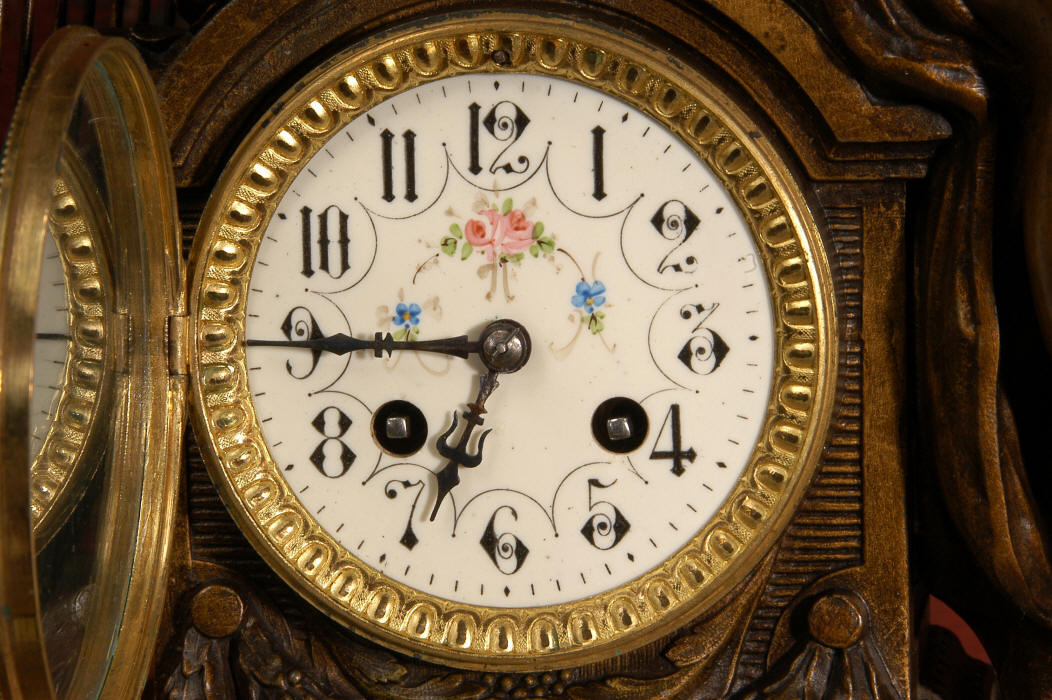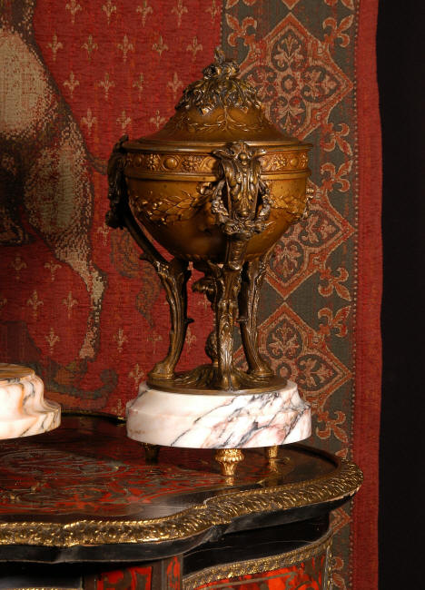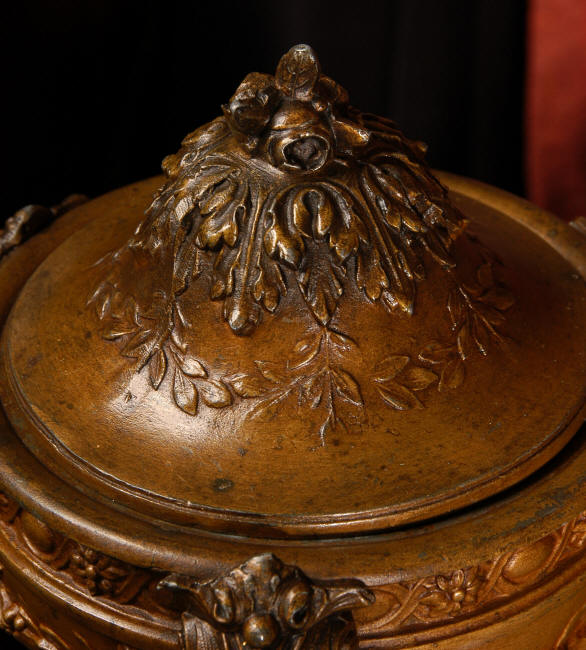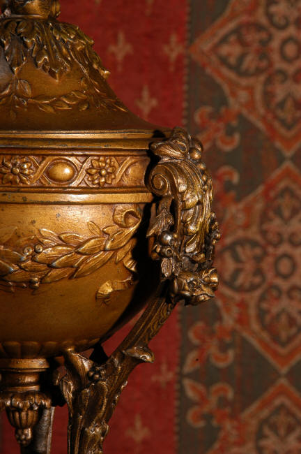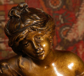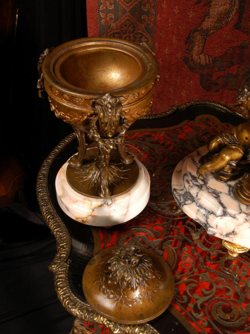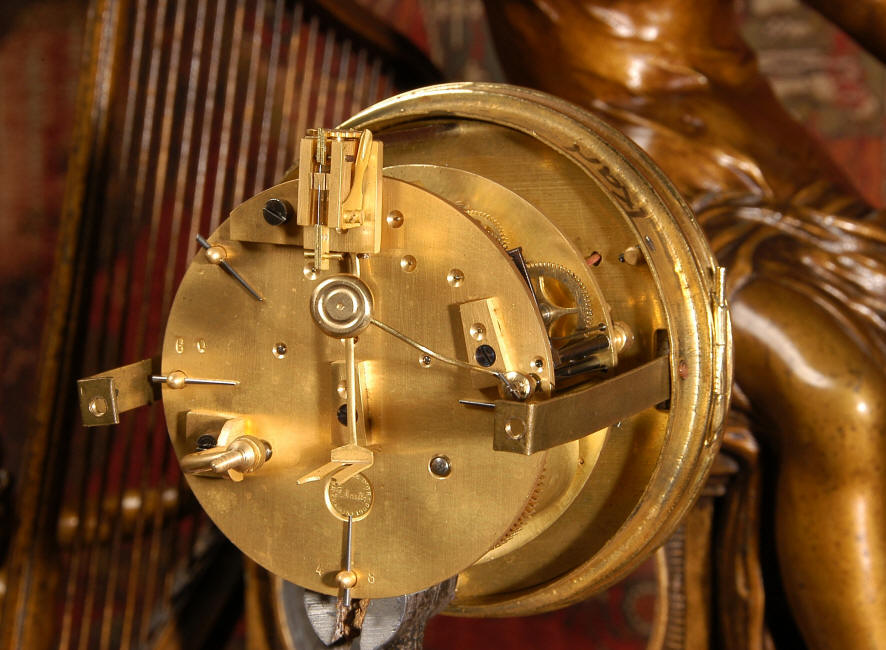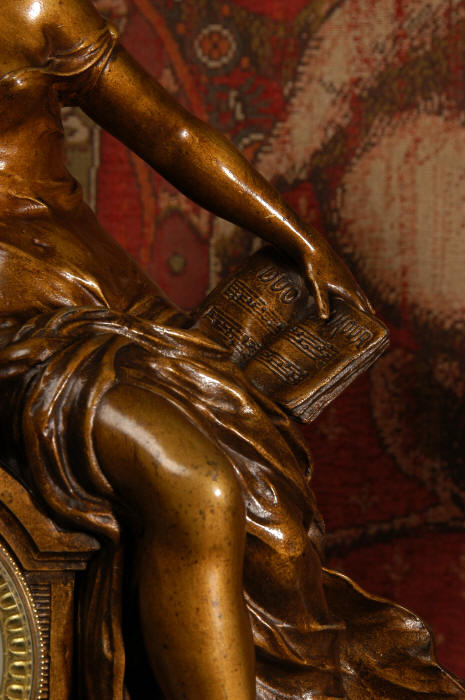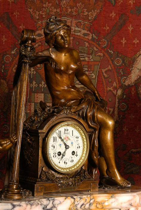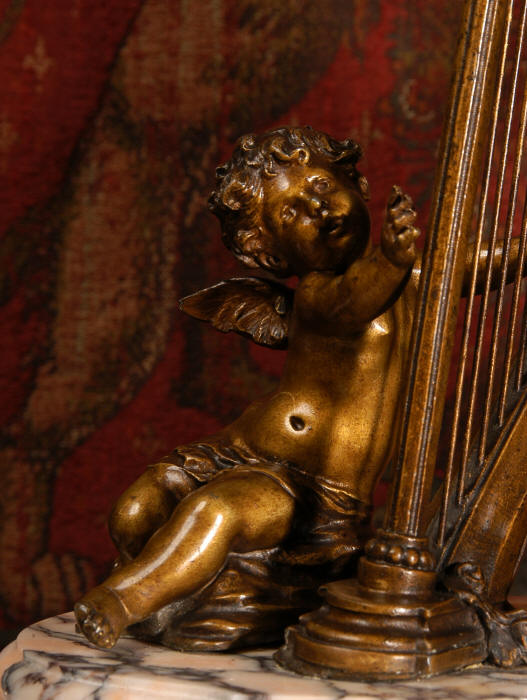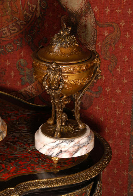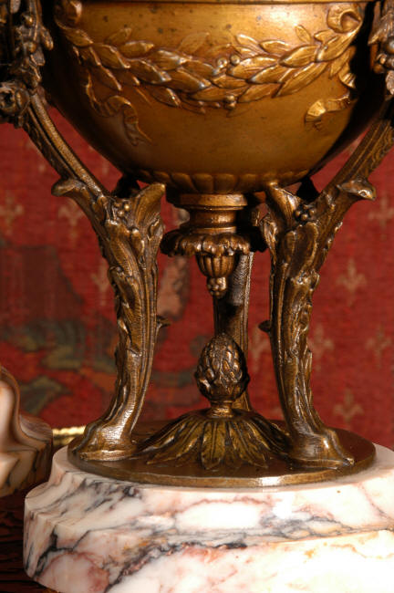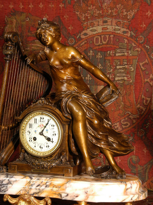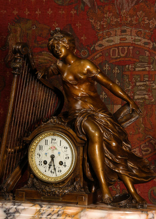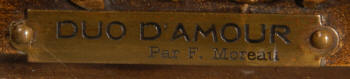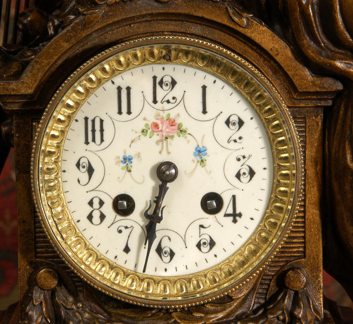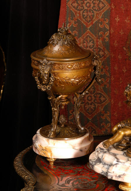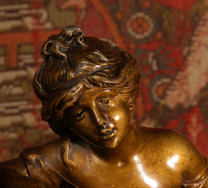 ~ French - Circa 1900 ~ ~~ Excellent condition, fully overhauled and working ~~ A Stunning, Large Antique French clock set by the sculptor Hippolyte François Moreau entitled Duo D'Amour (love duet). It features a beautifully modelled muse of music singing with a putto playing a harp. To her feet is a tambourine and pipes. The lidded side urns are classical in style with hoof feet and laurel wreaths and are mounted on matching marble bases. The set is beautifully made in patinated bronzed metal mounted on variegated specimen marble bases, it is in excellent condition. A plaque is mounted on the front of the case with the artist and the title of the piece. The movement has the clockmakers mark 'gold medal Paris 1900' on the backplate. Hippolyte François Moreau (1832-1927) was the second son of Jean-Baptiste Moreau, Hippolyte Moreau went to work in Paris under the direction of Jouffroy and exhibited his first work at the Salon in 1859. The best of his work includes charming full figures of children and young women, mostly allegorical, often with the same subjects as used by Hippolyte's brother Auguste. He is well listed and known, see the Artprice database for more information. The French movement by Fritz Marti, it is of excellent quality and has been fully overhauled by our clockmaker. Pendulum is original. It runs for 8 days on one wind and strikes the hours and halves on a bell. Click the video clip below to hear the bell and watch the clock running! Condition of the case is