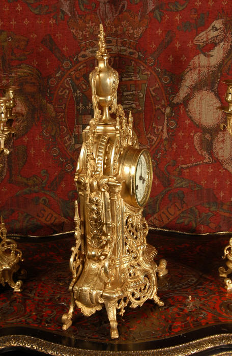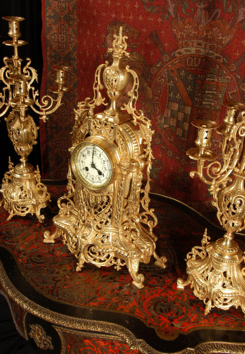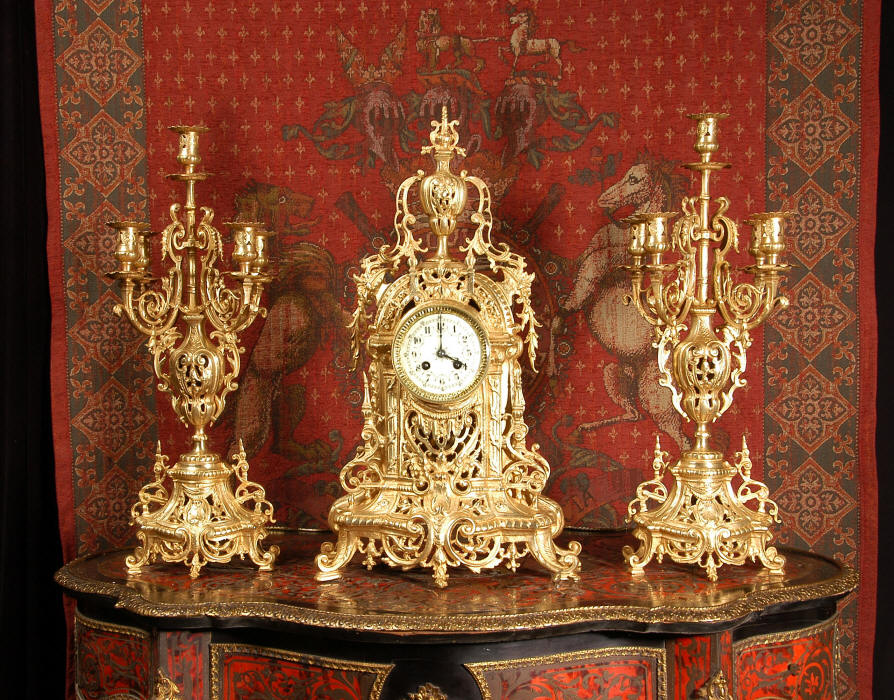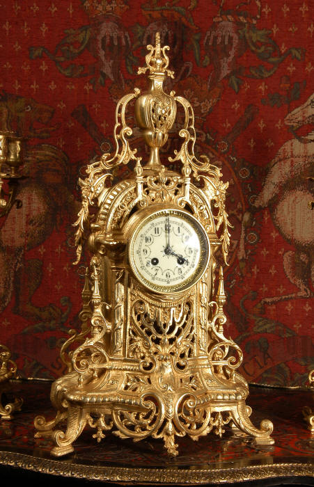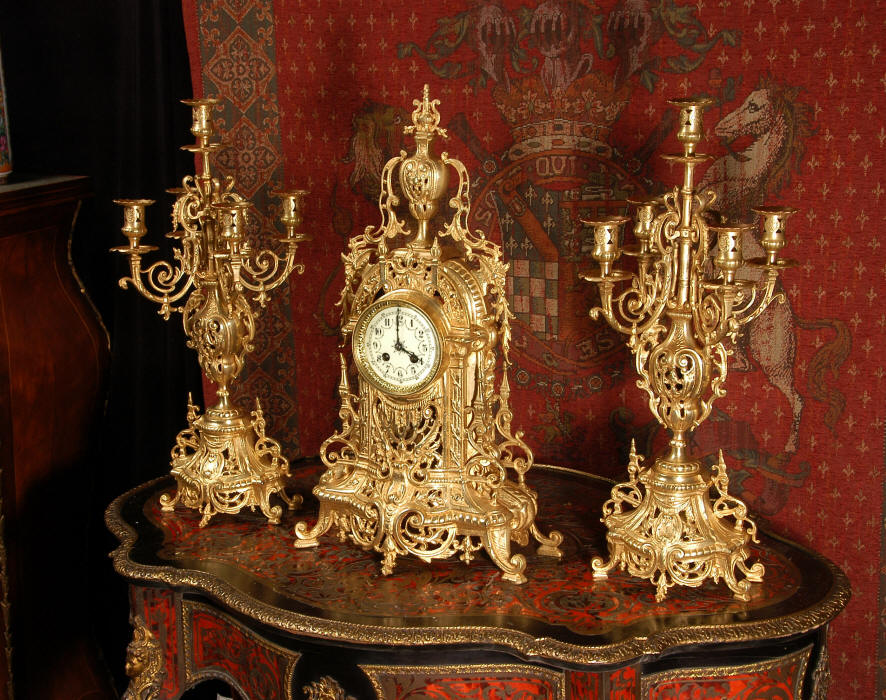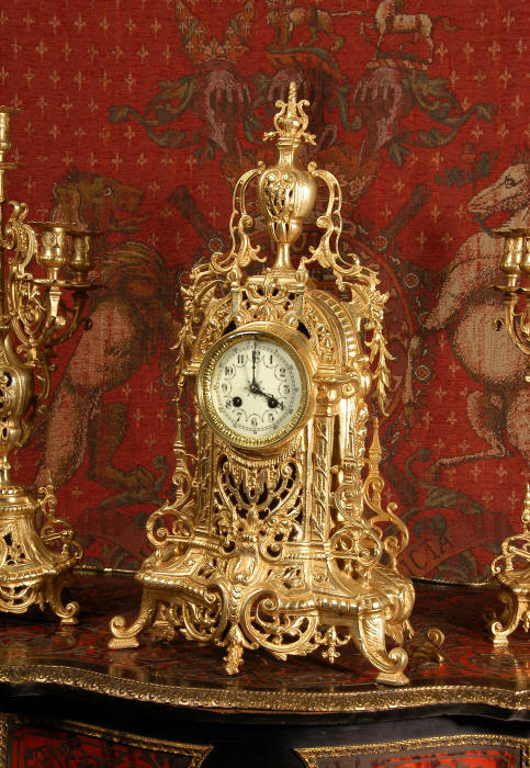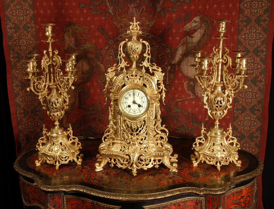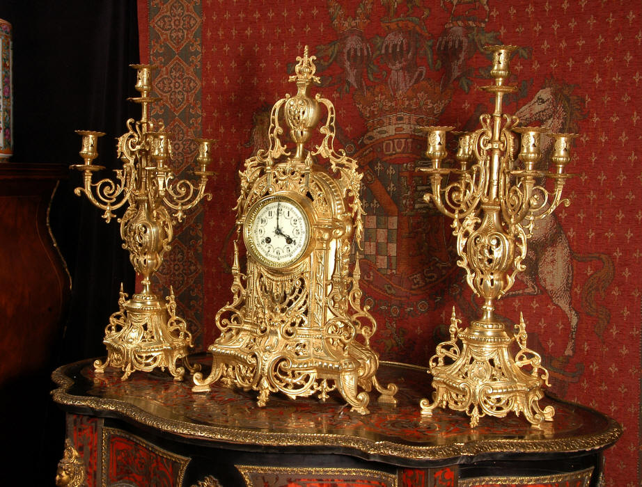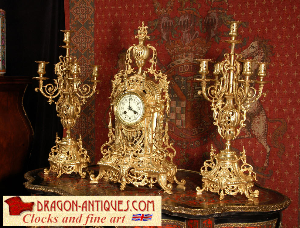 ~ French - Circa 1880 ~ ~~ Excellent condition fully working ~~ A beautiful antique French clock set, well made in brass. The clock is architecturally styled as a gothic ruin, covered in entwined foliage. It is surmounted by an urn and stands on scroll feet. The front of the clock is delicately fretted to allow the pendulum to be seen swinging within the case. Candelabra are similarly bold and large and have four branches. The dial is cream enamel on copper and is complete with original blued steel hands. The back door is glazed to allow the movement to be seen. The French movement is by Louis Japy and has the clockmakers 1878 mark on the movement backplate. It is of high quality and is clean and running condition having been fully serviced by our clockmaker. Pendulum is original. It runs for 8 days on one wind and strikes the hours and halves on a bell. Click the video clip below to hear the bell and watch the clock running! Condition of the case is