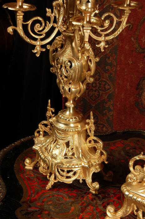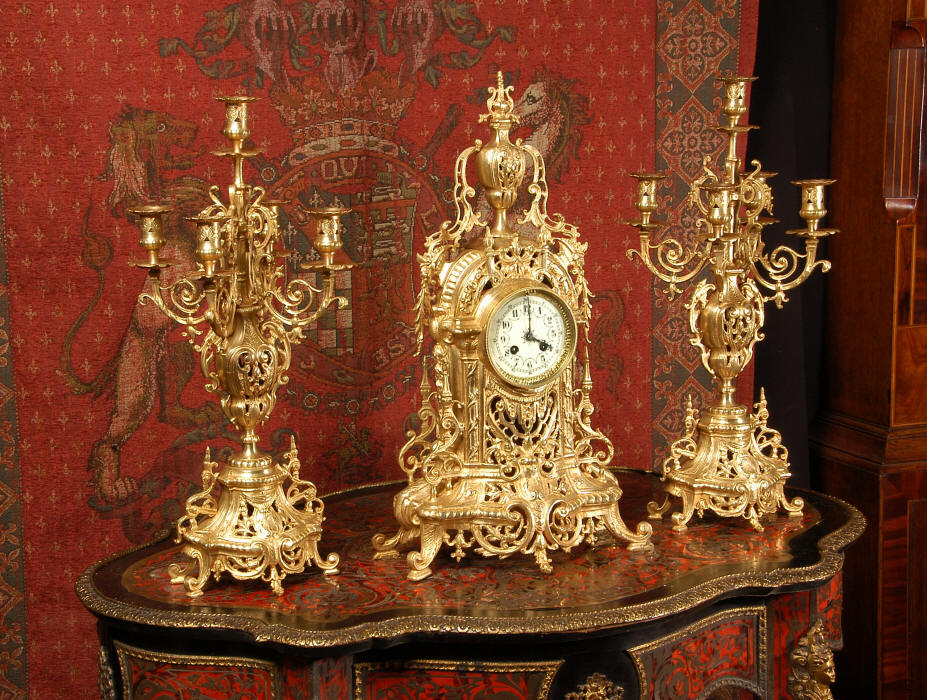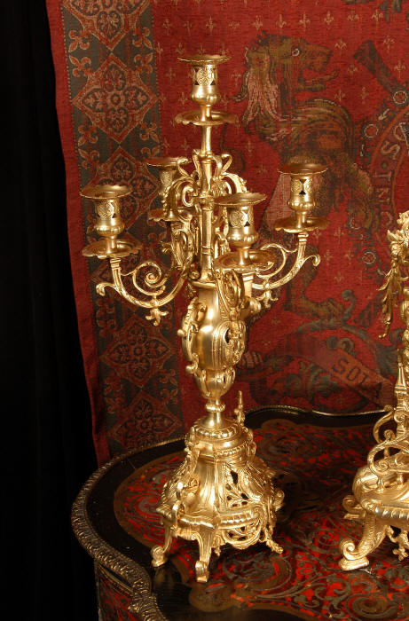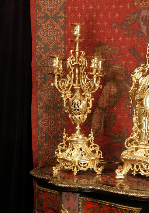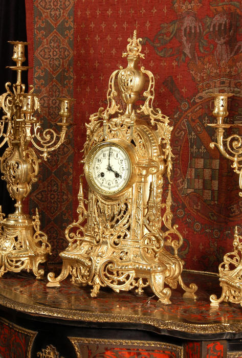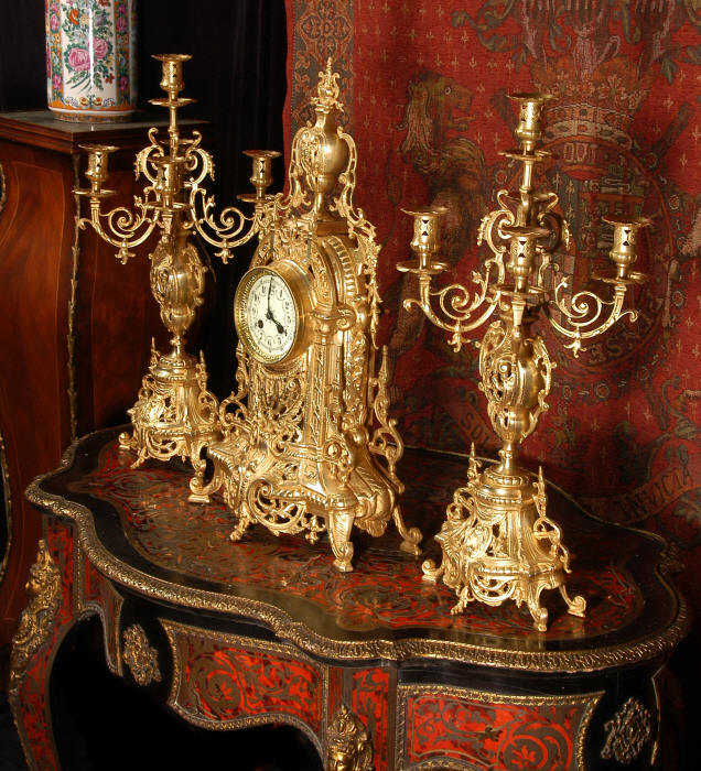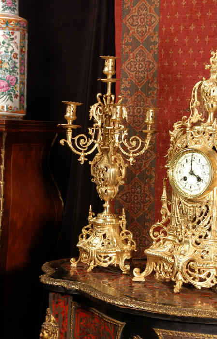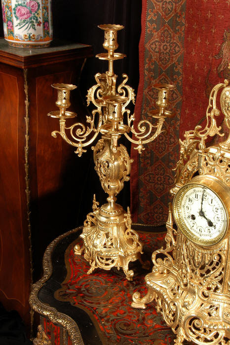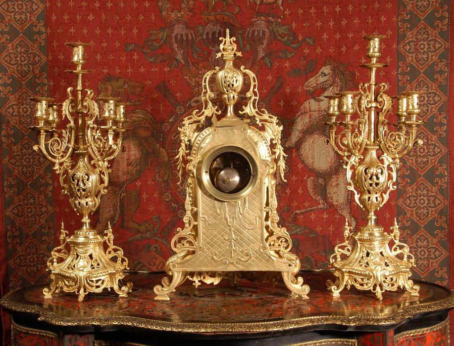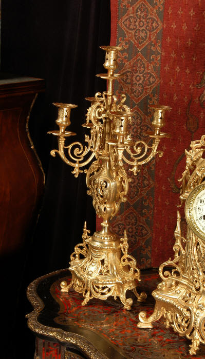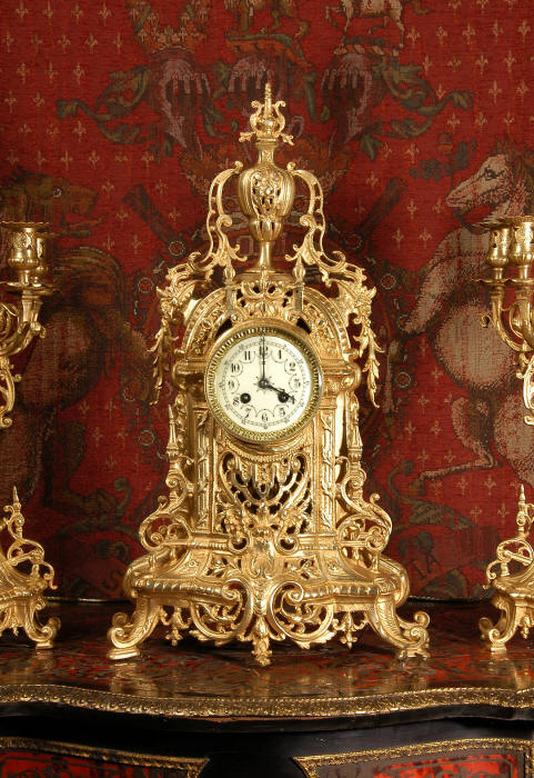 ~ French - Circa 1880 ~ ~~ Excellent condition fully working ~~ A beautiful antique French clock set, well made in brass. The clock is architecturally styled as a gothic ruin, covered in entwined foliage. It is surmounted by an urn and stands on scroll feet. The front of the clock is delicately fretted to allow the pendulum to be seen swinging within the case. Candelabra are similarly bold and large and have four branches. The dial is cream enamel on copper and is complete with original blued steel hands. The back door is glazed to allow the movement to be seen. The French movement is by Louis Japy and has the clockmakers 1878 mark on the movement backplate. It is of high quality and is clean and running condition having been fully serviced by our clockmaker. Pendulum is original. It runs for 8 days on one wind and strikes the hours and halves on a bell. Click the video clip below to hear the bell and watch the clock running! Condition of the case is