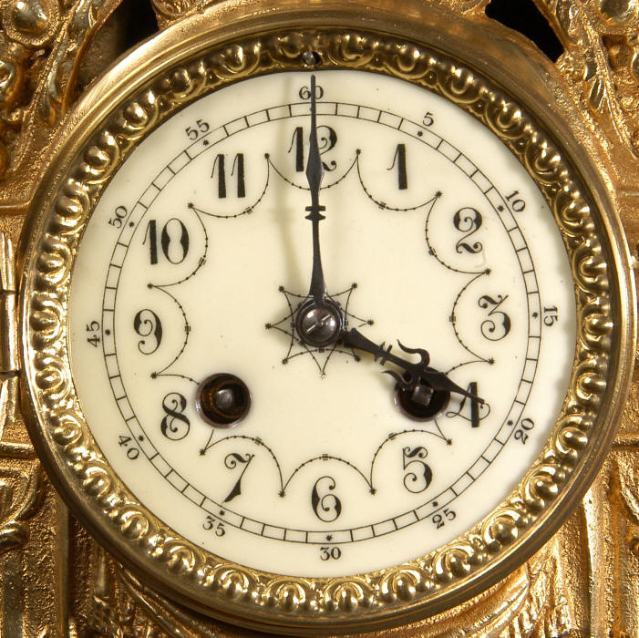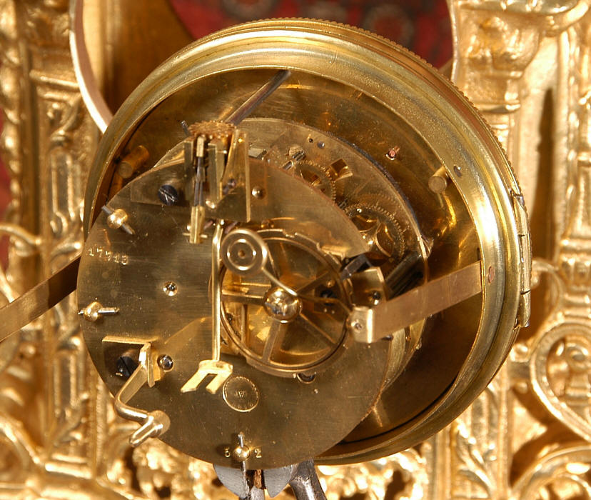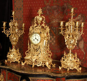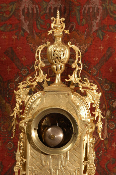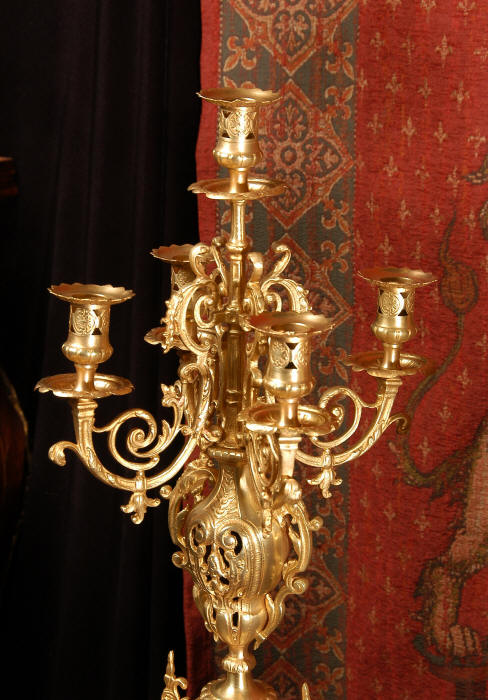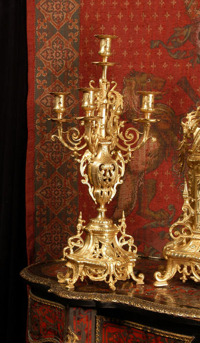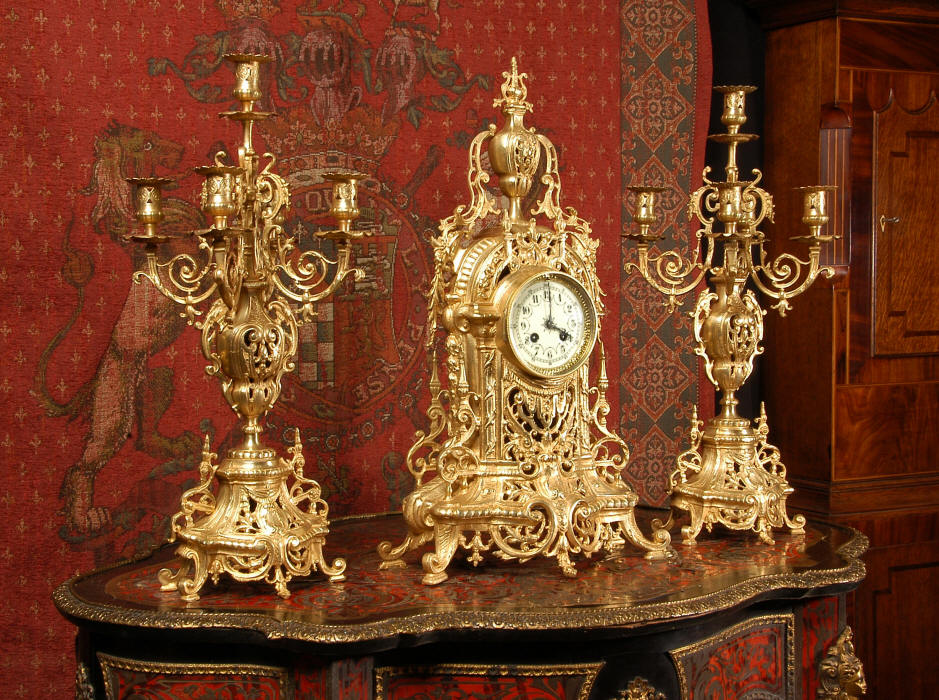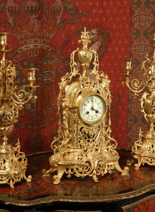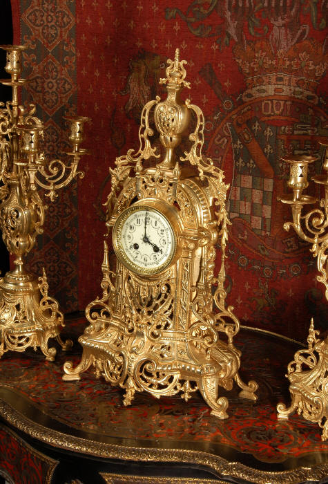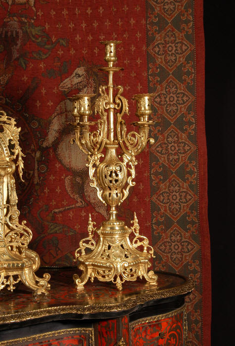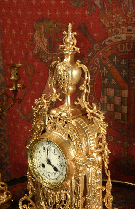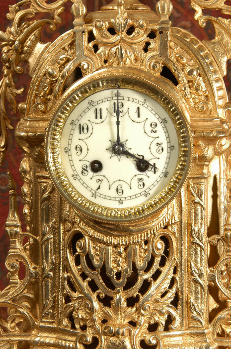 ~ French - Circa 1880 ~ ~~ Excellent condition fully working ~~ A beautiful antique French clock set, well made in brass. The clock is architecturally styled as a gothic ruin, covered in entwined foliage. It is surmounted by an urn and stands on scroll feet. The front of the clock is delicately fretted to allow the pendulum to be seen swinging within the case. Candelabra are similarly bold and large and have four branches. The dial is cream enamel on copper and is complete with original blued steel hands. The back door is glazed to allow the movement to be seen. The French movement is by Louis Japy and has the clockmakers 1878 mark on the movement backplate. It is of high quality and is clean and running condition having been fully serviced by our clockmaker. Pendulum is original. It runs for 8 days on one wind and strikes the hours and halves on a bell. Click the video clip below to hear the bell and watch the clock running! Condition of the case is