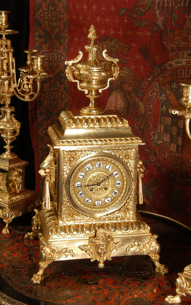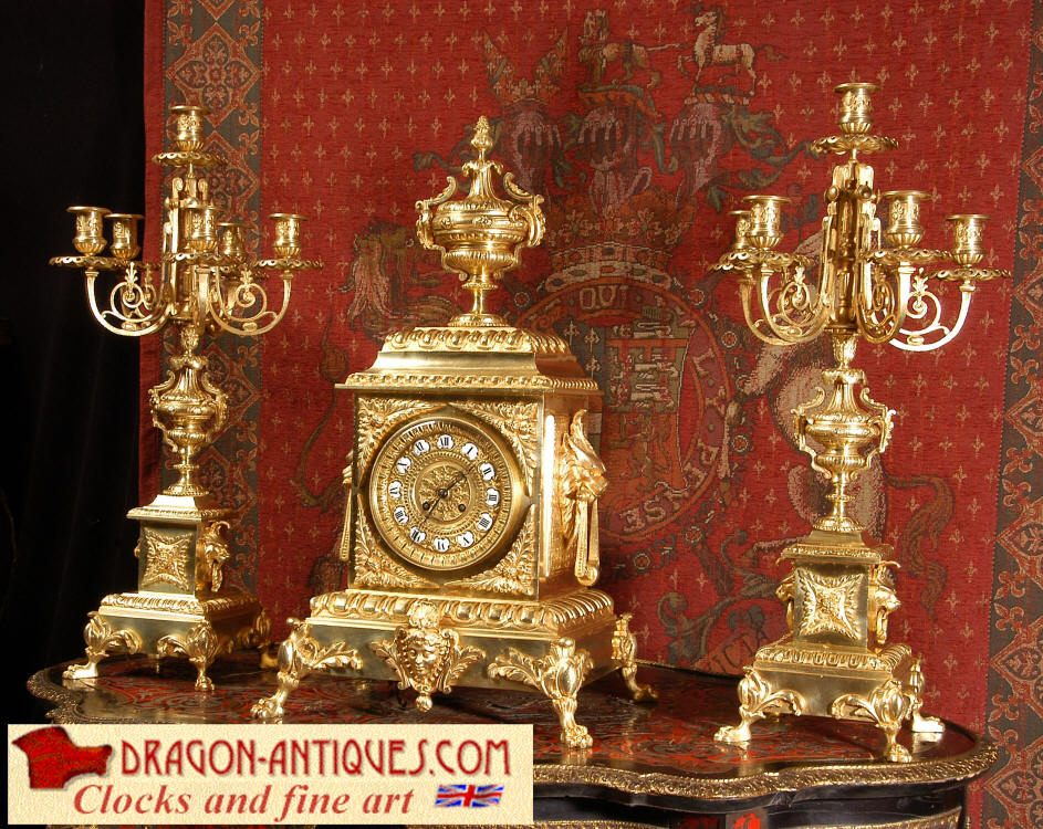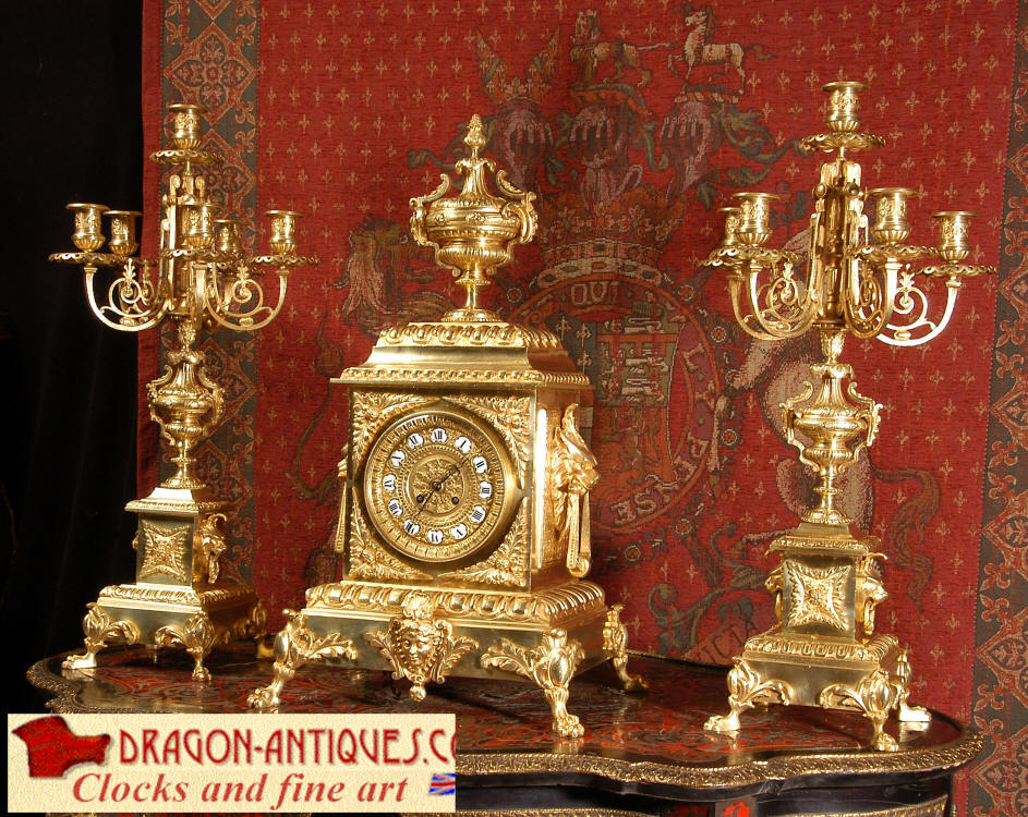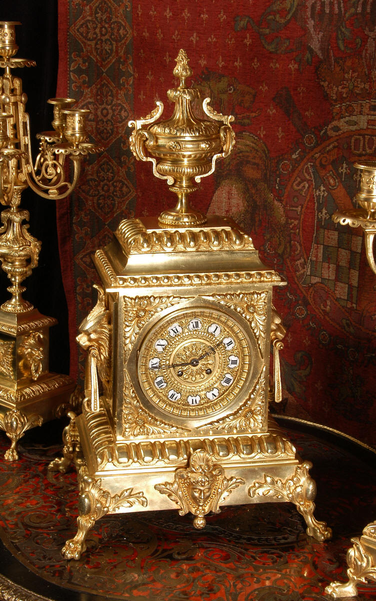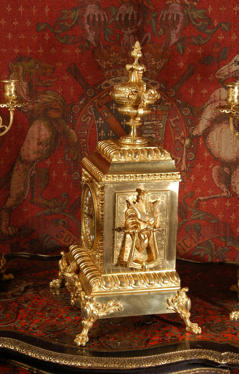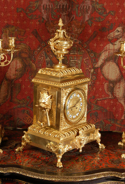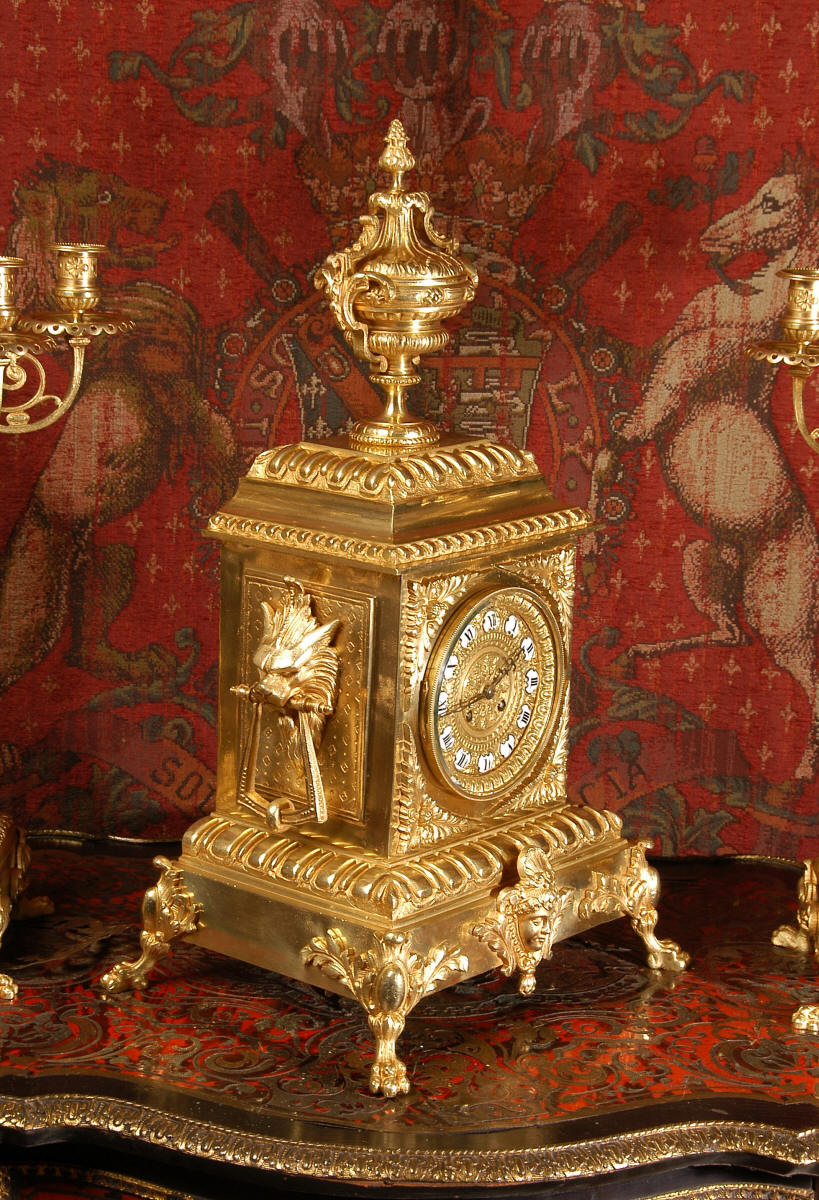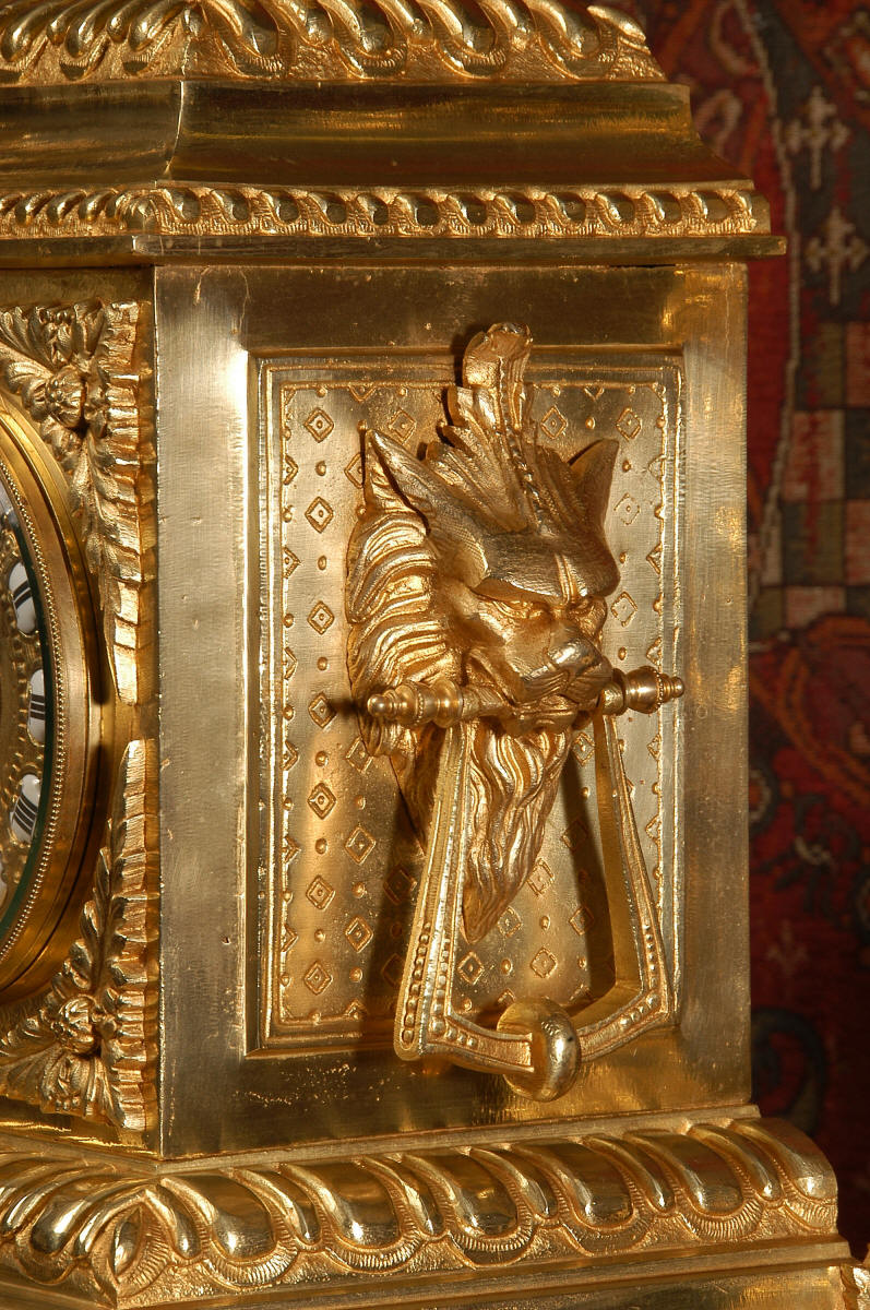 ~ French - Circa 1890 ~ ~~ Excellent condition ~~ A very finely detailed gilt brass clock in excellent condition, much of the original gilding remains which is in lovely bright and clean condition. The style is Baroque. The clock movement is held aloft by cherubim forming the front pillars. The cherubim look back at two winged lions which are tethered. The pendulum is visible swinging below the movement between the cherubim pillars, pendulum is formed as a shield with lions rampant. Above the dial is a typical Baroque broken arch. The back of the top is fretted along with the base and the clock is beautifully detailed and well finished. The dial is enamel on copper with a cast brass centre and is complete with original blued steel hands. The French movement is of very high quality and is in excellent clean and running condition having been fully serviced by our clockmaker. Pendulum is original. It runs for 8 days and strikes the hours and halves on a bell. Click the video clip below to hear the bell and watch the clock running! Condition of the case is