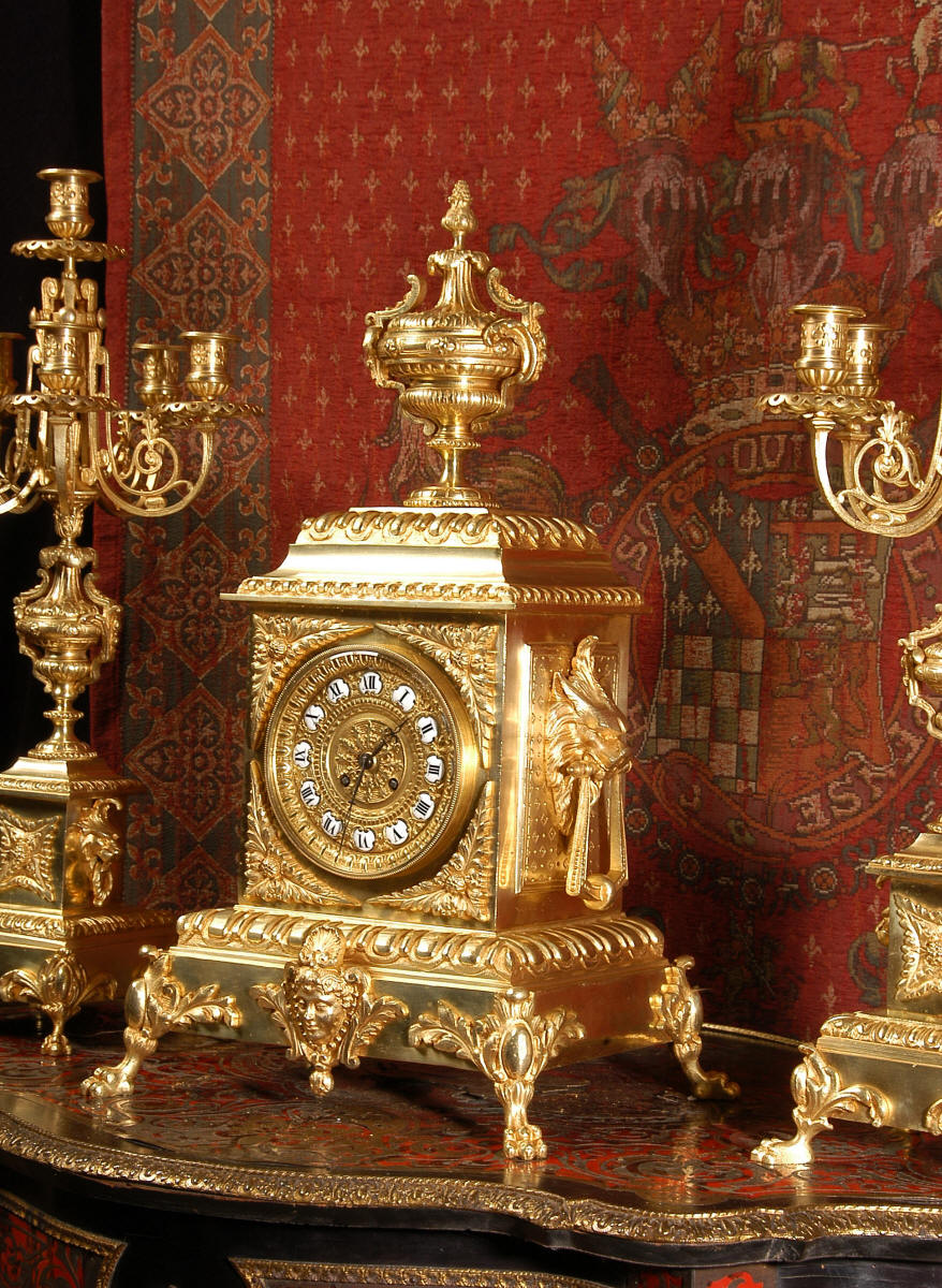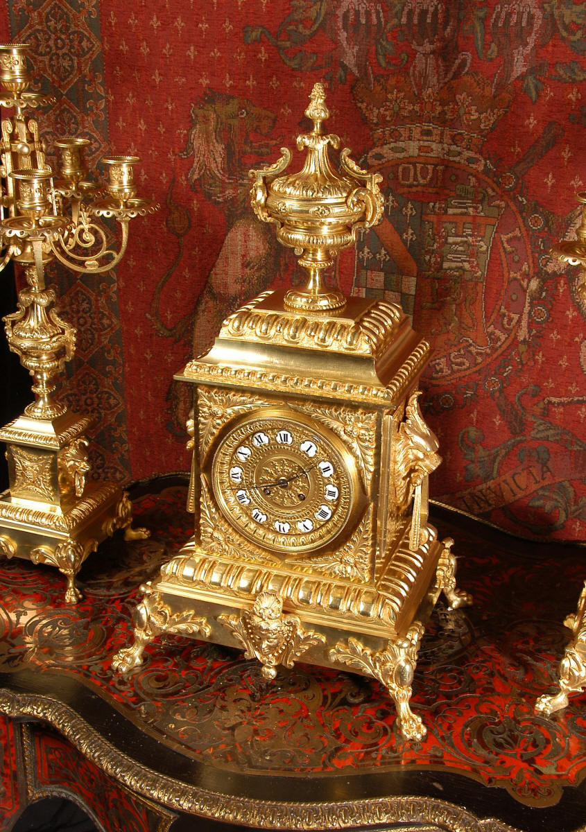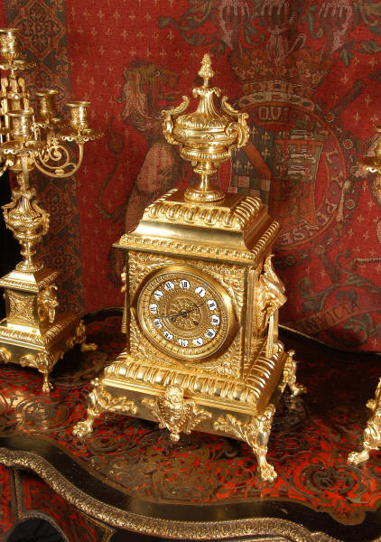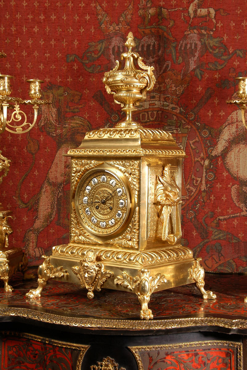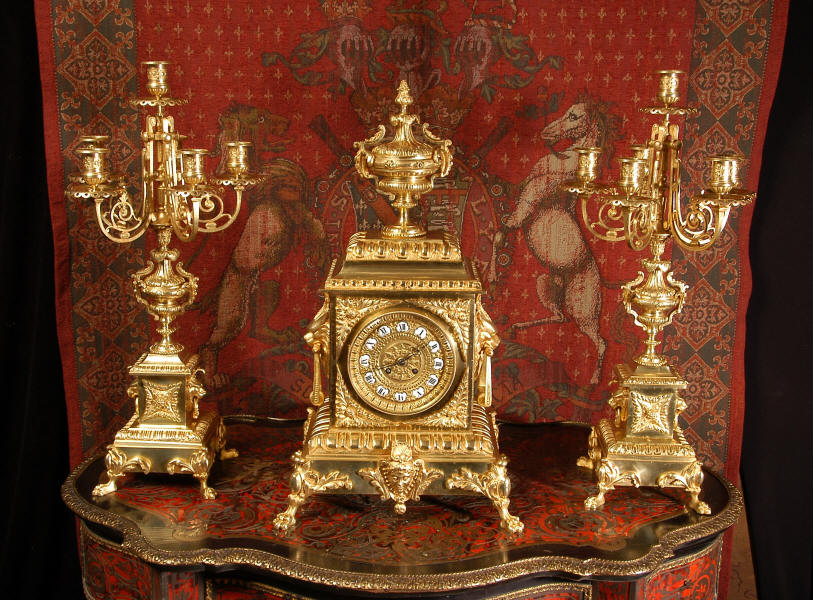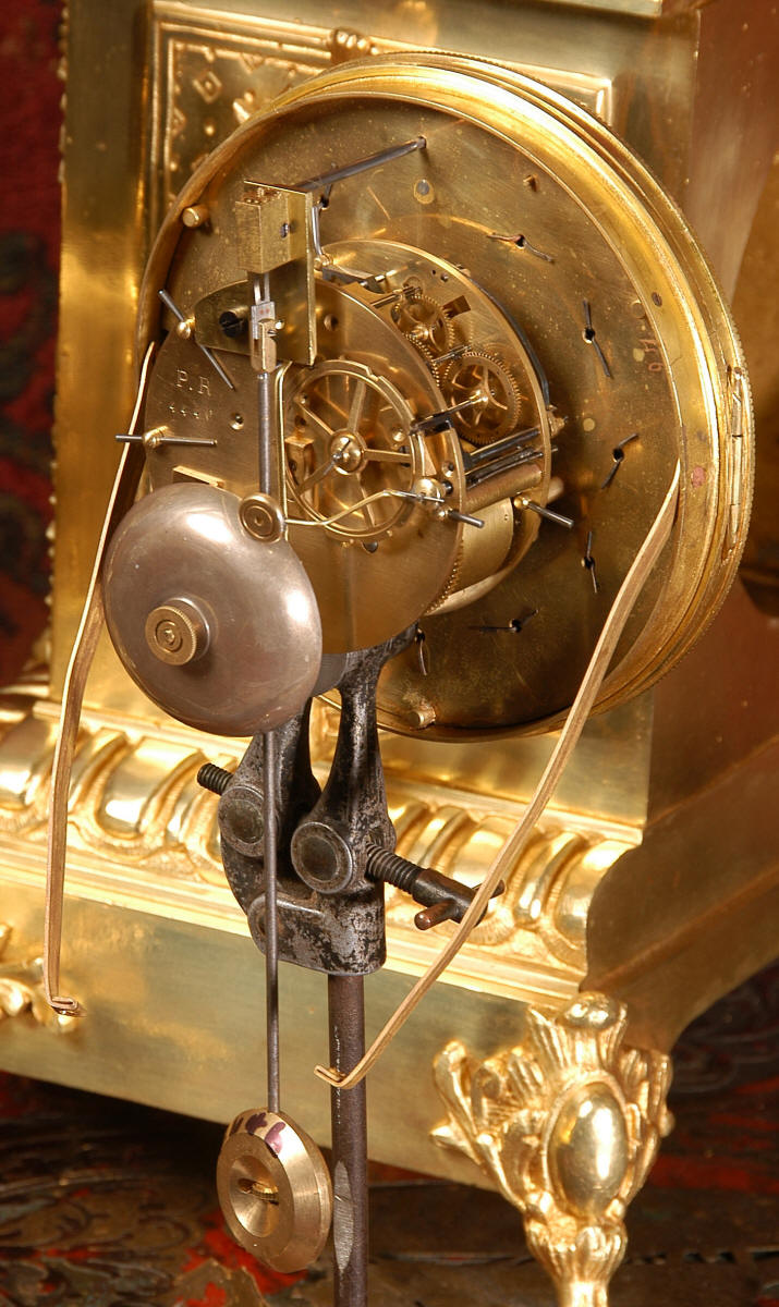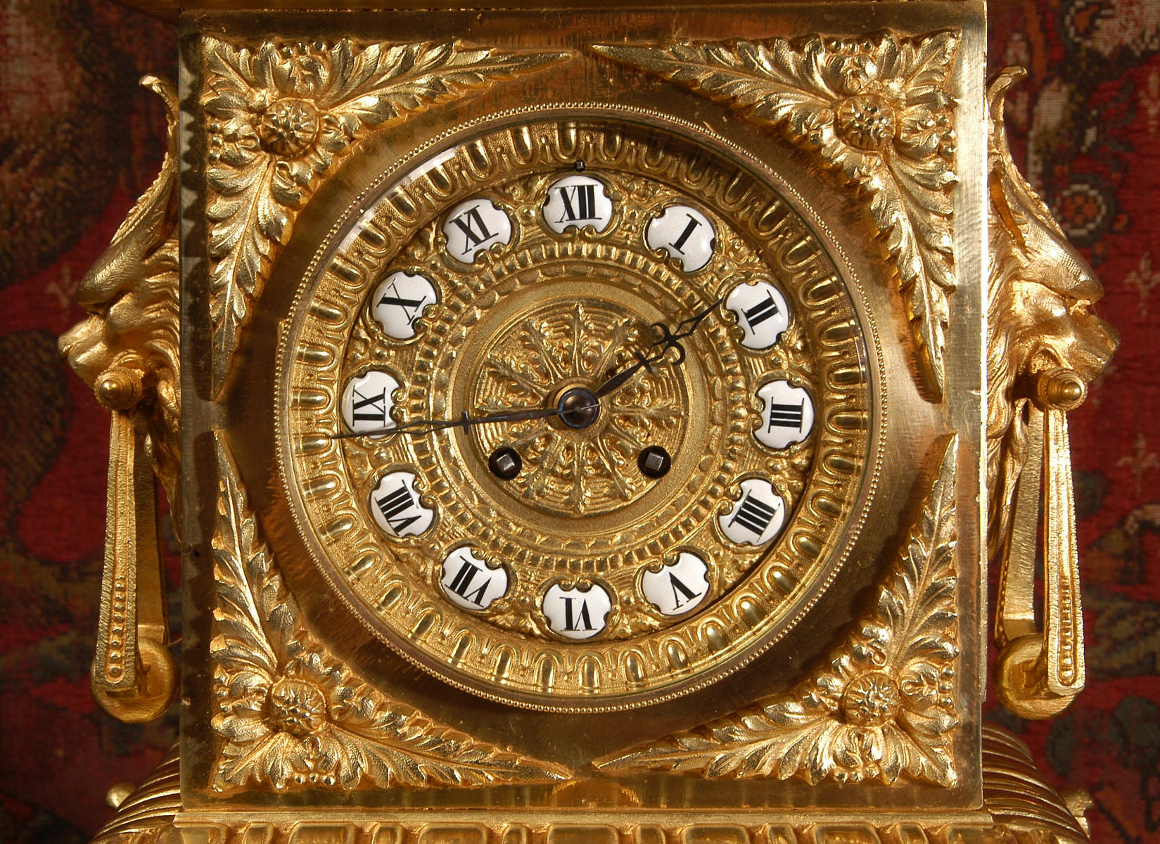 ~ French - Circa 1890 ~ ~~ Excellent condition ~~ A very finely detailed gilt brass clock in excellent condition, much of the original gilding remains which is in lovely bright and clean condition. The style is Baroque. The clock movement is held aloft by cherubim forming the front pillars. The cherubim look back at two winged lions which are tethered. The pendulum is visible swinging below the movement between the cherubim pillars, pendulum is formed as a shield with lions rampant. Above the dial is a typical Baroque broken arch. The back of the top is fretted along with the base and the clock is beautifully detailed and well finished. The dial is enamel on copper with a cast brass centre and is complete with original blued steel hands. The French movement is of very high quality and is in excellent clean and running condition having been fully serviced by our clockmaker. Pendulum is original. It runs for 8 days and strikes the hours and halves on a bell. Click the video clip below to hear the bell and watch the clock running! Condition of the case is